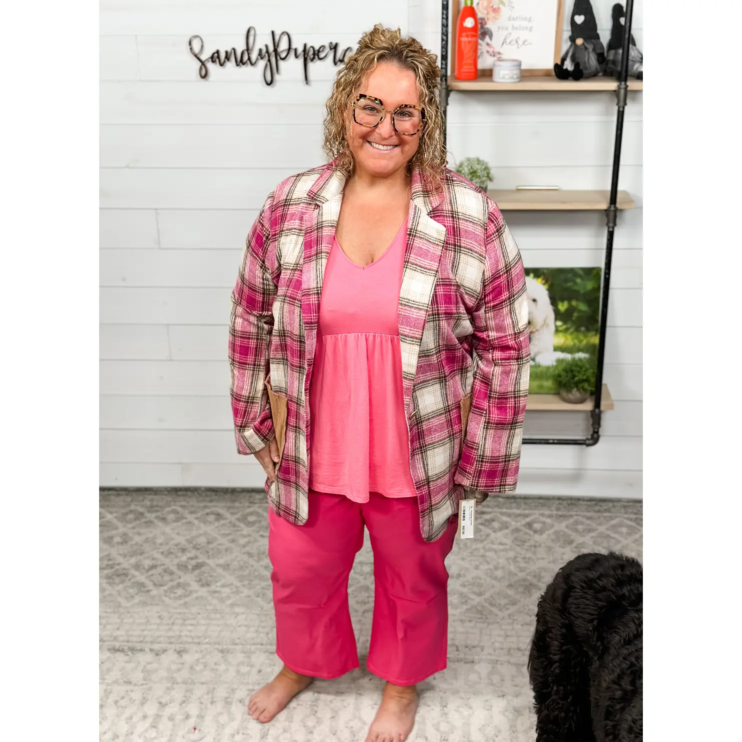 The perfect addition to your Spring wardrobe! Our Missy High-Rise Hyperstretch Wide Leg Flood With Faux Front Pockets is not only super stretchy and flexible for all-day wear, but also lightweight and breathable for warmer days ahead! Featuring contouring technology, engineered to give you an incredible fit and hold while accentuating your curves. We've designed these in a cropped wide leg that hits in the middle of your calf. Available in gorgeous Spring colors, as well as neutrals, so you can mix and match with your current wardrobe. Pair with a floral blouse and heeled sandals for the ultimate Spring look, or wear them more casual with a front tucked tee and flats! Product Details: - High-Rise- 1-Button Closure with Zipper- Faux Front Pockets- 2 Back Pockets- Cropped Wide LegSize & Fit (Based on size M):- Inseam: 34"- Rise: 10.5"77% Rayon/ 21% Nylon/ 2% SpandexSize ChartS | 1-3 | 25-26M | 5-7 | 27-28L | 9-11 | 29-30XL | 13-15 | 31-321X | 14W-16W | 34-362X | 18W-20W | 36-383X | 20W-22W | 38-40