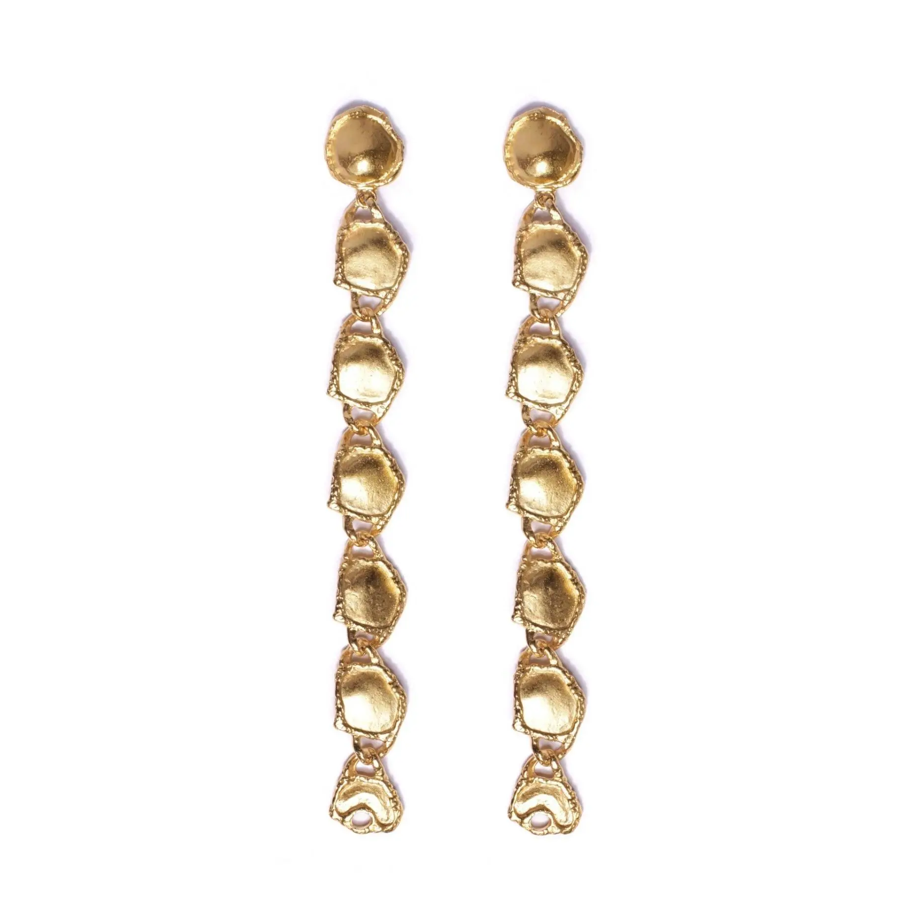 Frame your face in two long drop earrings to elongate your neck. They are worn with a post and butterfly back. A glamorous statement set. Height: 1/2" Width: 2” Length: 6” Made in America. 24K Gold Plated on pewter