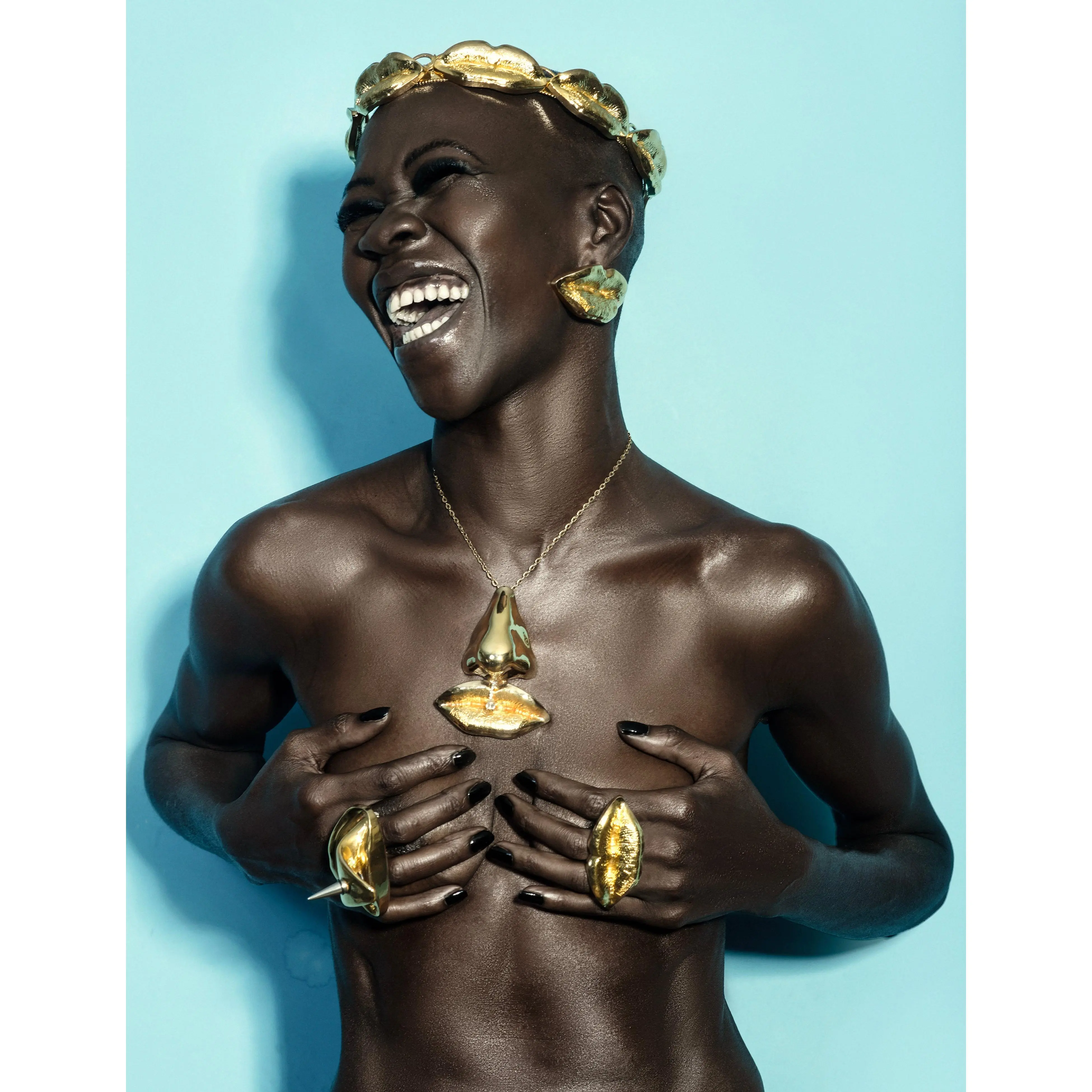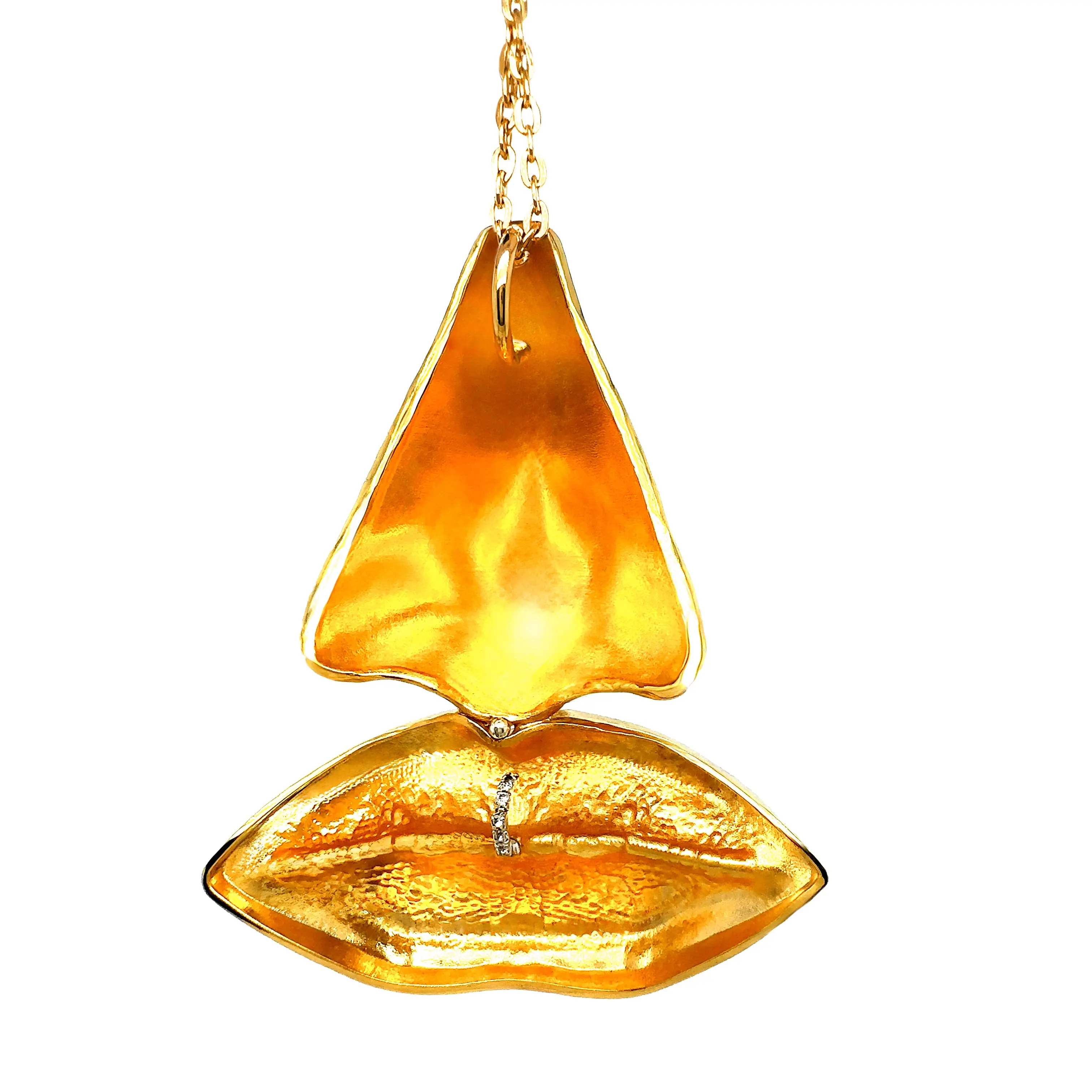 Inspired by the Dali perfume bottle, this pendant is the most unique conversation and statement neckpiece you will ever own. Produced through a painstaking process of 3D printing and handmade casting, this mini sculpture is the centerpiece of the FACElift jewelry collection. Molded from our creative director’s face (really!) this 3D printed oversized pendant is the most unique conversation piece. This exquisite jewel is a the lips and nose and is adorned with a rhinestone nose ring and crystal lip ring.