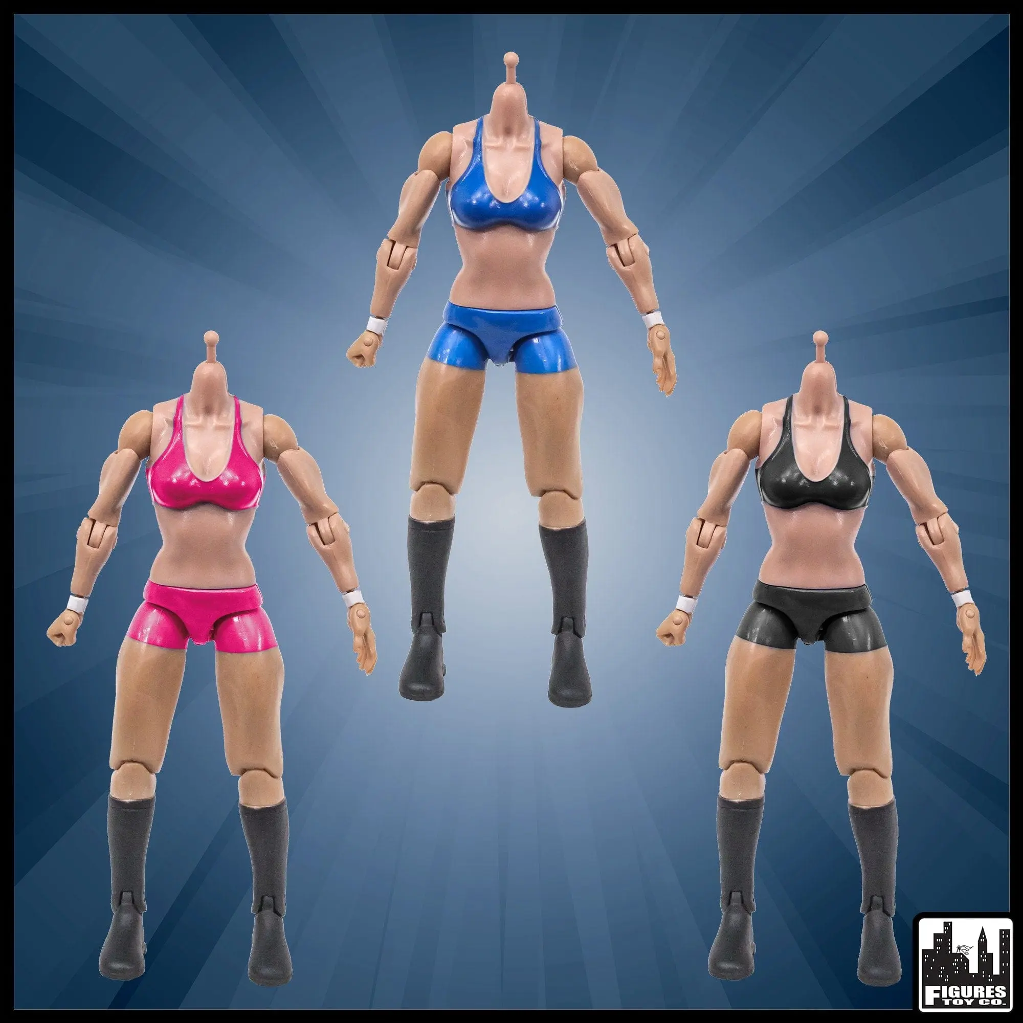 Build your very own wrestling figure! This is a generic wrestling action figure with no head that you can use for your own wrestling figure customizations. Use the drop down box below to pick which color trunks you would like. Roughly 6.5 inches tall.