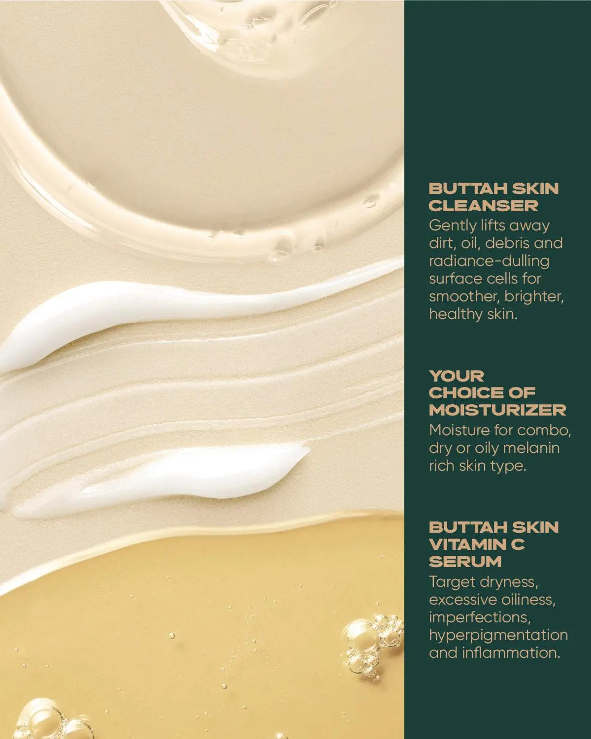 Reveal your natural glow with the Buttah Customizable Skincare Kit—a simple yet effective 3-step system designed for tanned to richer complexions. Whether you're tackling dark spots, dullness, uneven texture, or dryness, this customizable routine is crafted to meet your skin’s unique needs. Achieve hydrated, smooth, flawless and radiant skin with products powered by nature and science. Product is 30ml in size. Specifically designed for melanin-rich skin tones, this routine supports healthy, glowing skin by addressing common skincare needs.