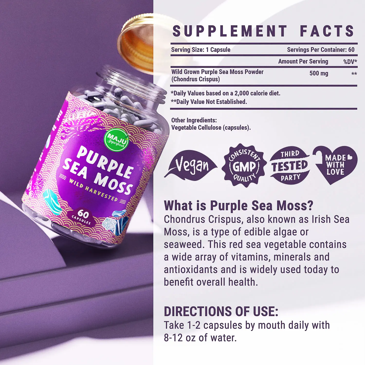 ·How many servings are there? Maju's Purple Sea Moss Capsules 60 ct contains a 60-day supply at one capsule per day.
