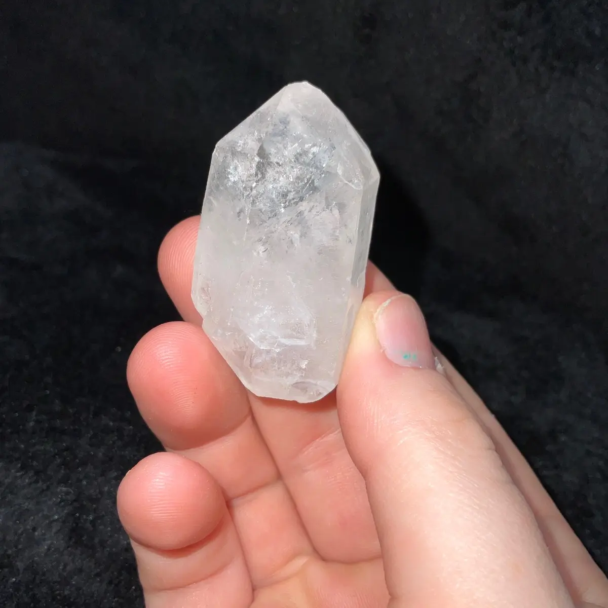 Being an isis cut clear quartz, it not only represents goodness, power, and Feminine Divine energy, it also has many rainbow flashes when exposed to light.
