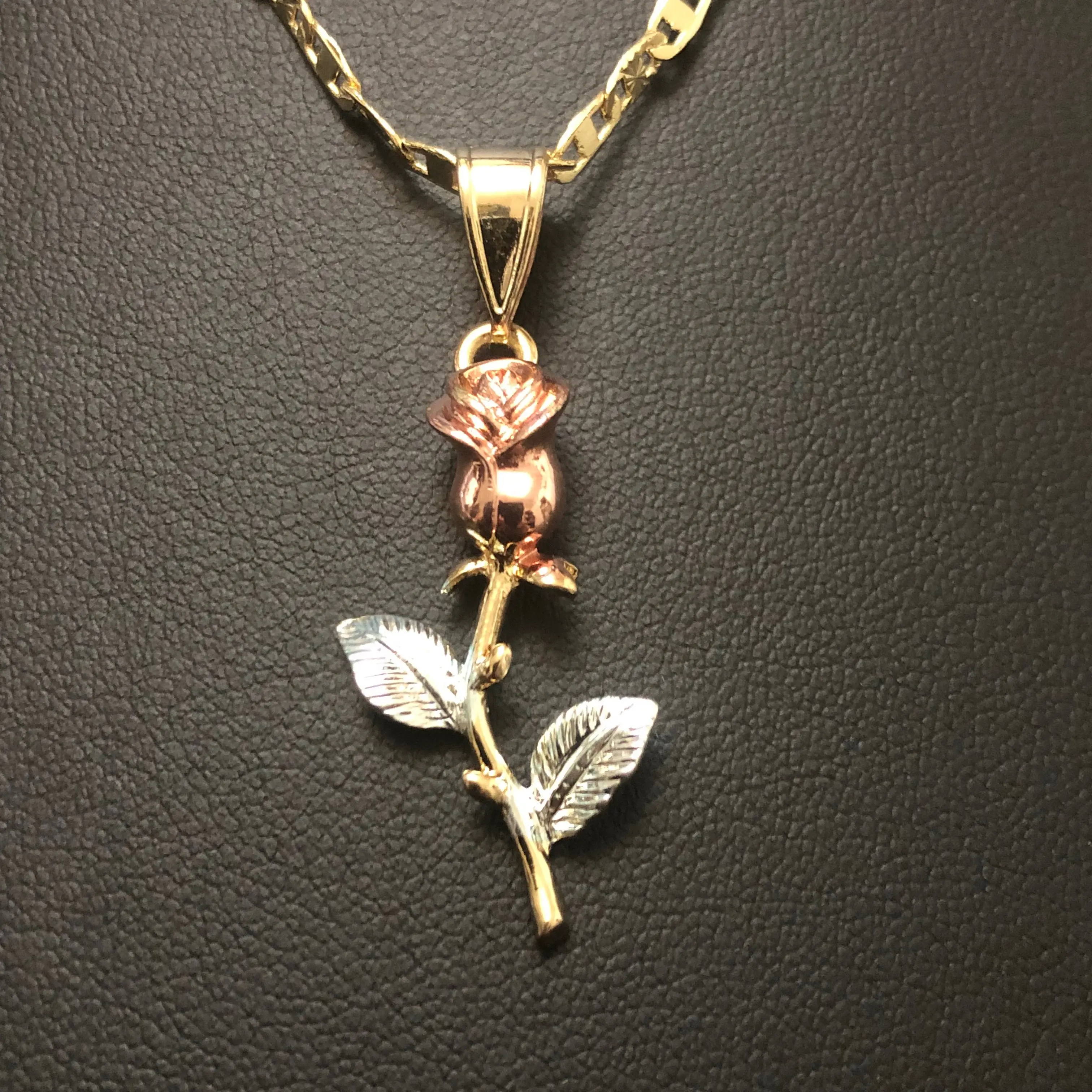 Rose PendantPendant and Necklace24K Gold Filled - Three TonePendant Measures 1 1/2"Necklace Measures 24"*Please Read in Detail*Rosarios Y Mas Inc. provides a life time warranty on all products. If the product gets damaged for any reason, we will exchange the item for free. All items are as described. Items sold by Rosarios Y Mas Inc. are either Gold Plated/Filled, Stainless Steel or Handmade beaded products. Please read item description in detail for all information regarding the item. Please contact us if you have any questions or concerns. My family and I appreciate your business.Rosarios Y Mas Inc. le da garantia de vida en su compra. Si el producto se dana por algún motivo, se lo cambiamos gratis. Todas las cadenas y medallas/dijes son hechas de Oro Laminado, Acero Inoxidable o hechas a mano. Por favor lea toda la información en detalle. Por cualquier pregunta o comentario, por favor comunícate con nosotros. Muchas Gracias por su compra!Medalla y Cadena