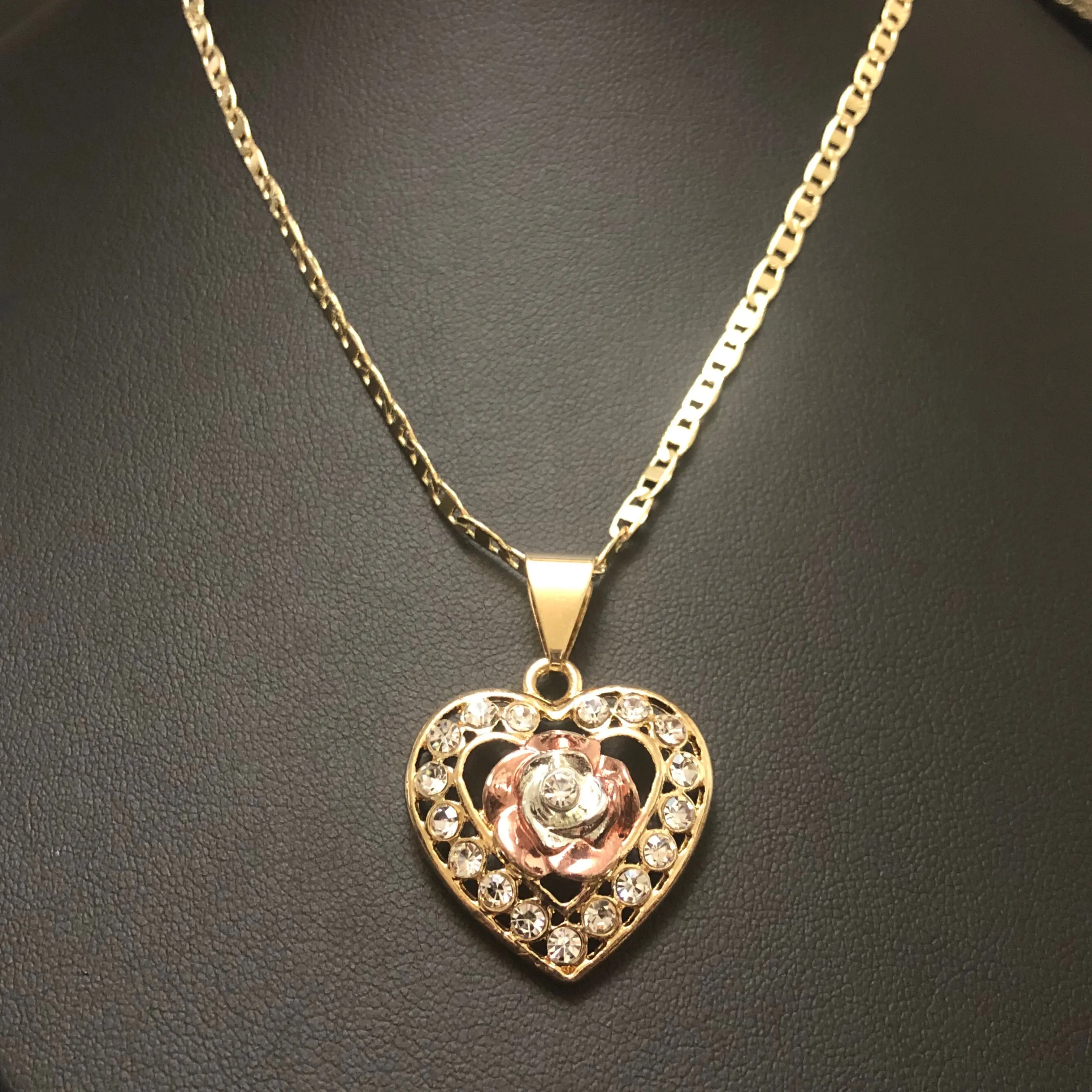 Heart with Rose PendantPendant and Necklace24K Gold Filled - Three TonePendant Measures 1 1/2"Necklace Measures 24"*Please Read in Detail*Rosarios Y Mas Inc. provides a life time warranty on all products. If the product gets damaged for any reason, we will exchange the item for free. All items are as described. Items sold by Rosarios Y Mas Inc. are either Gold Plated/Filled, Stainless Steel or Handmade beaded products. Please read item description in detail for all information regarding the item. Please contact us if you have any questions or concerns. My family and I appreciate your business.Rosarios Y Mas Inc. le da garantia de vida en su compra. Si el producto se dana por algún motivo, se lo cambiamos gratis. Todas las cadenas y medallas/dijes son hechas de Oro Laminado, Acero Inoxidable o hechas a mano. Por favor lea toda la información en detalle. Por cualquier pregunta o comentario, por favor comunícate con nosotros. Muchas Gracias por su compra!Medalla y Cadena