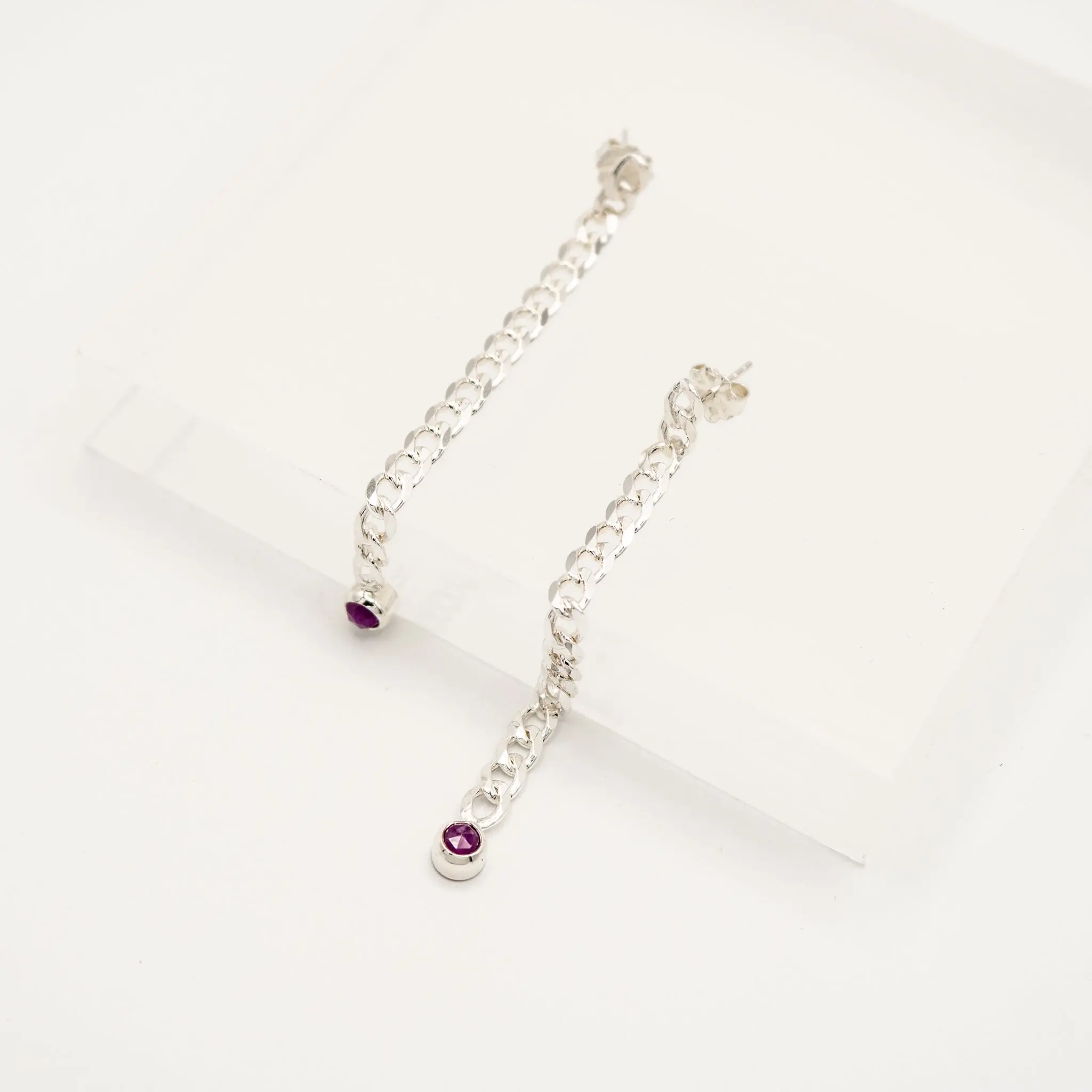These edgy Sterling Silver Diamond Cut Cuban Chain Tassle Earrings are adorned with a Rosecut Pink Sapphire. Lovingly handmade for the everyday slay in mind. Create a fashion forward look when styled with statement pieces. Wear as a single, matching, or asymmetrically with any of our jewelry. Sold as a Single or Pair.