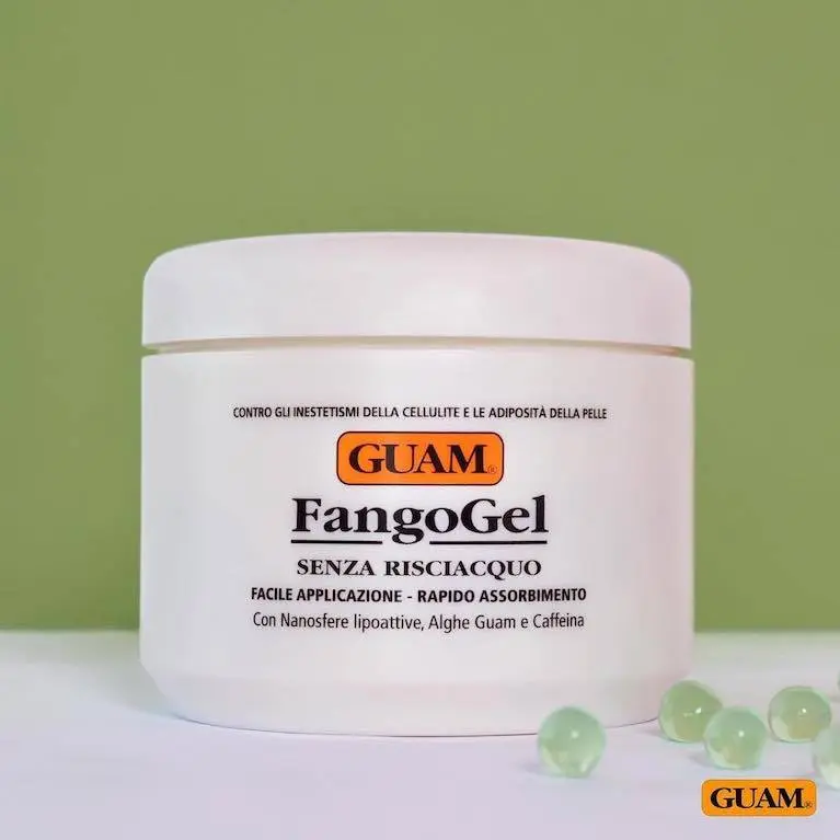 Fast-absorbing GUAM mud-based FangoGel is a new no-rinse anti-cellulite treatment with intense slimming action formulated with Guam Algae, Caffeine, and Kaolin Clay in association with cutting-edge Lipoactive Nanosphere technology. This Innovative technique ensures the direct delivery of active compounds in the FangoGel into the fat cells in connective tissue. The targeted action of the seaweed slimming gel works effectively to reduce adiposity of the skin, offering skin tightening, cellulite-reducing, and rejuvenating effects.