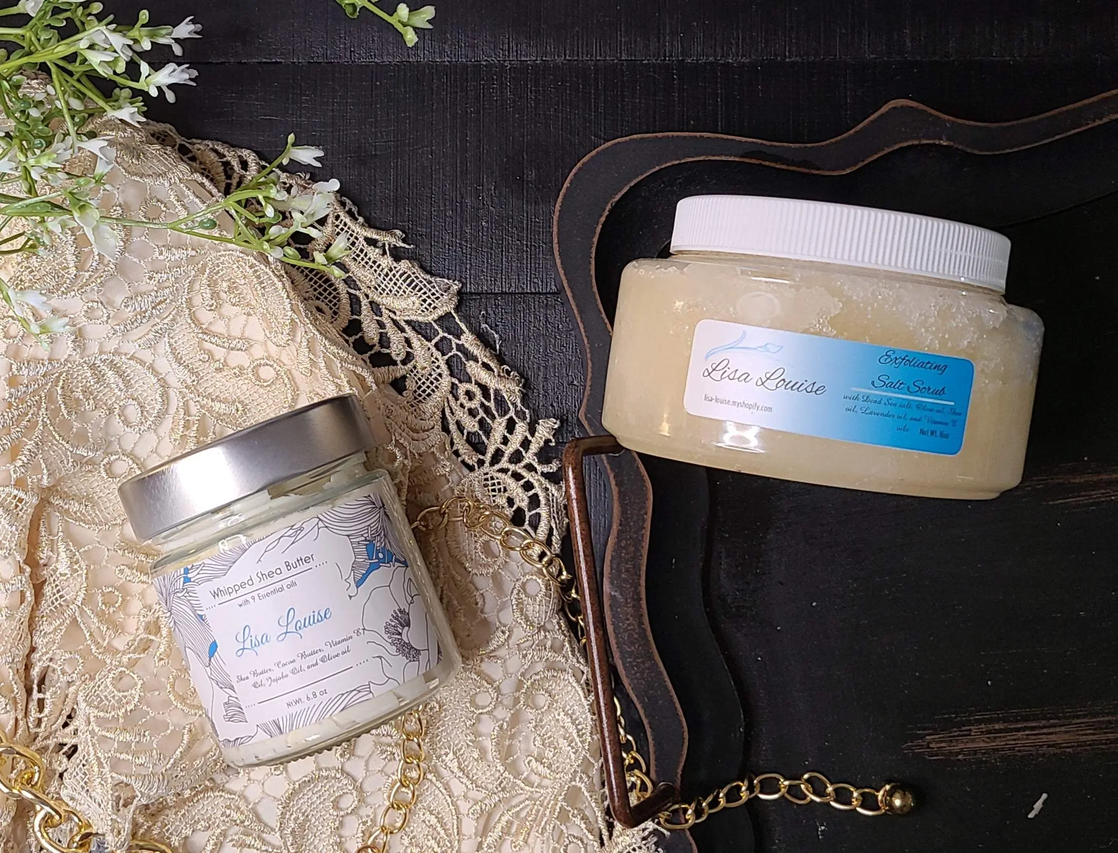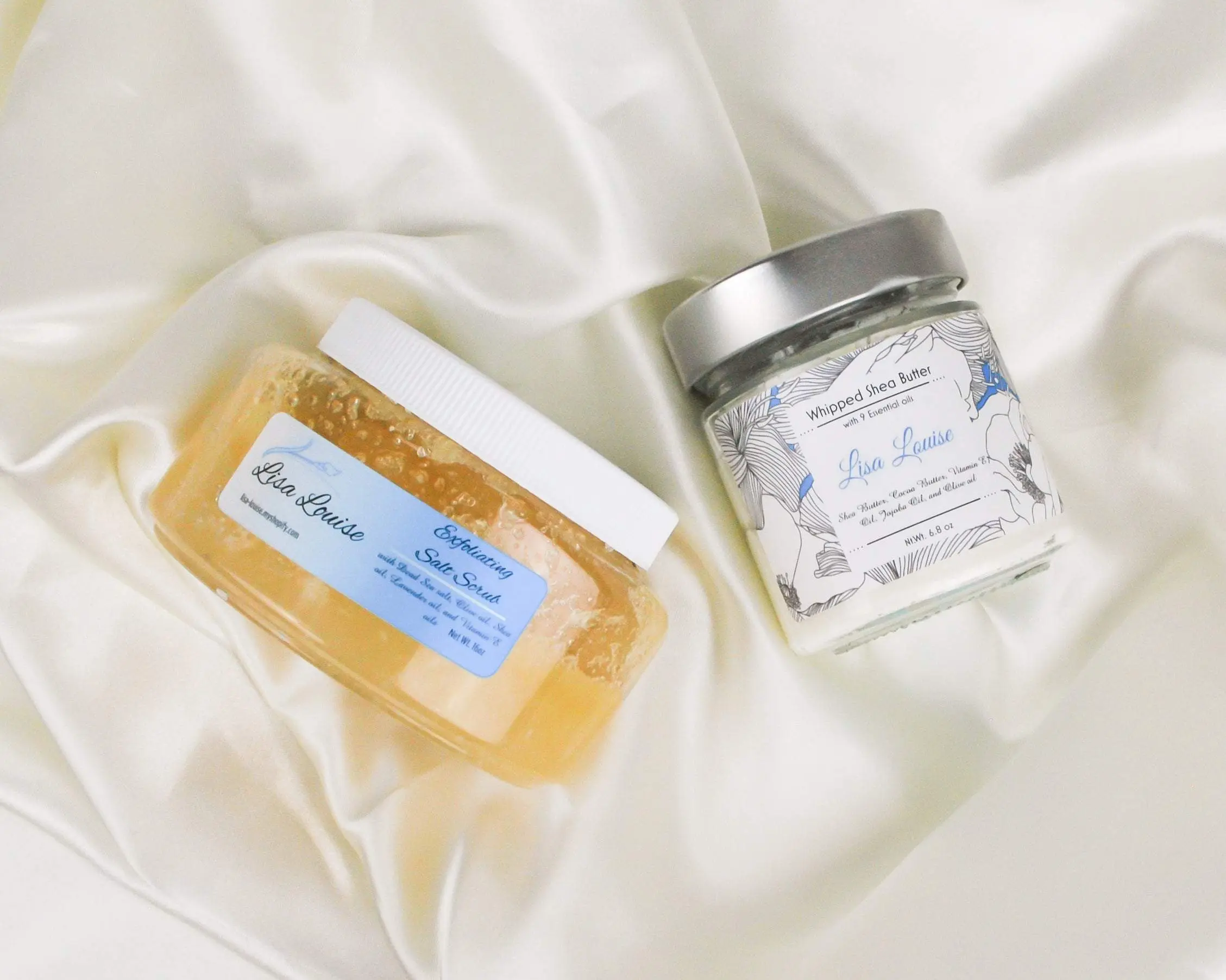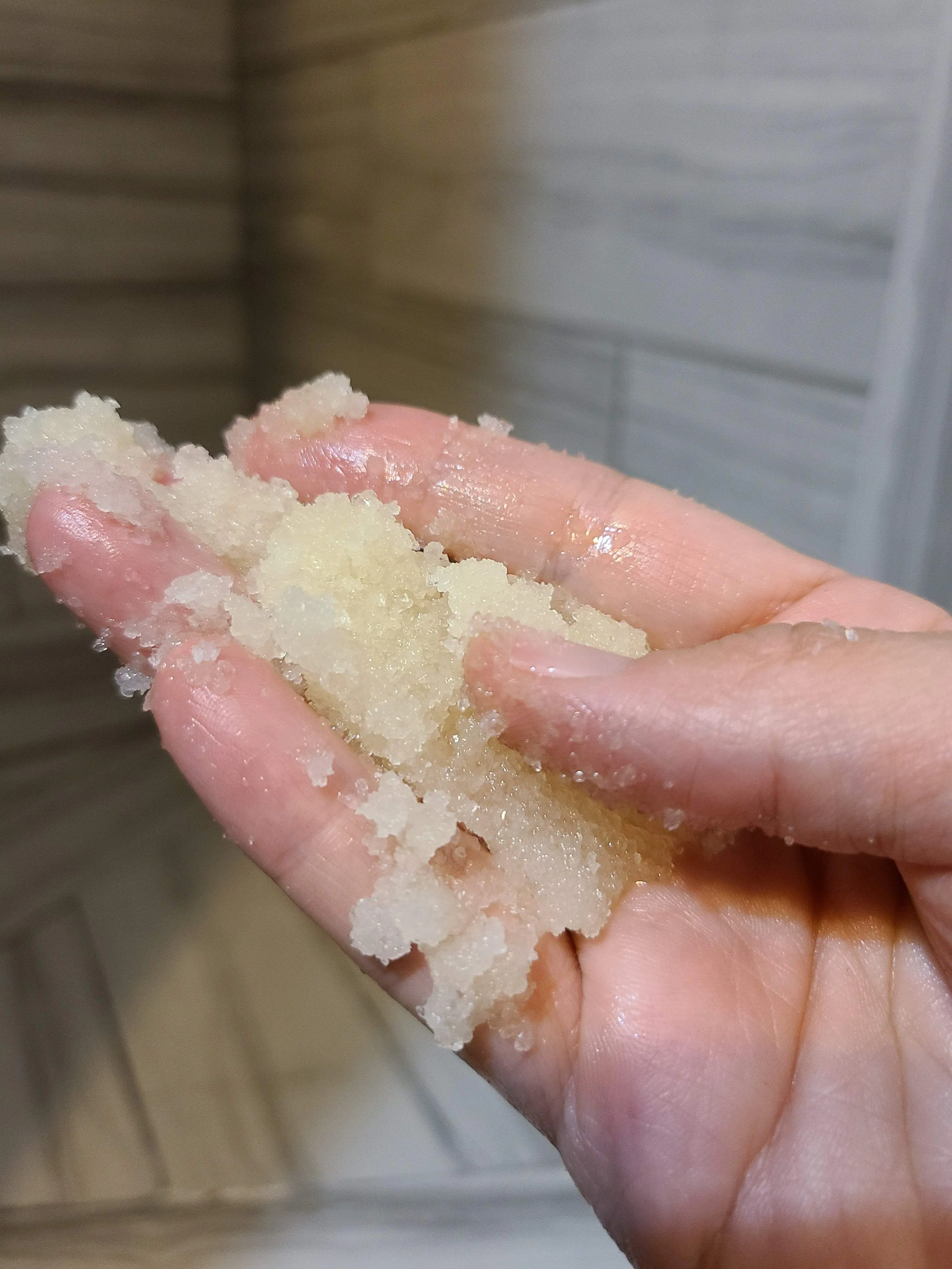 Exfoliating Salt Scrub- Take a small amount in your hands and scrub your body. A little goes a long way.
