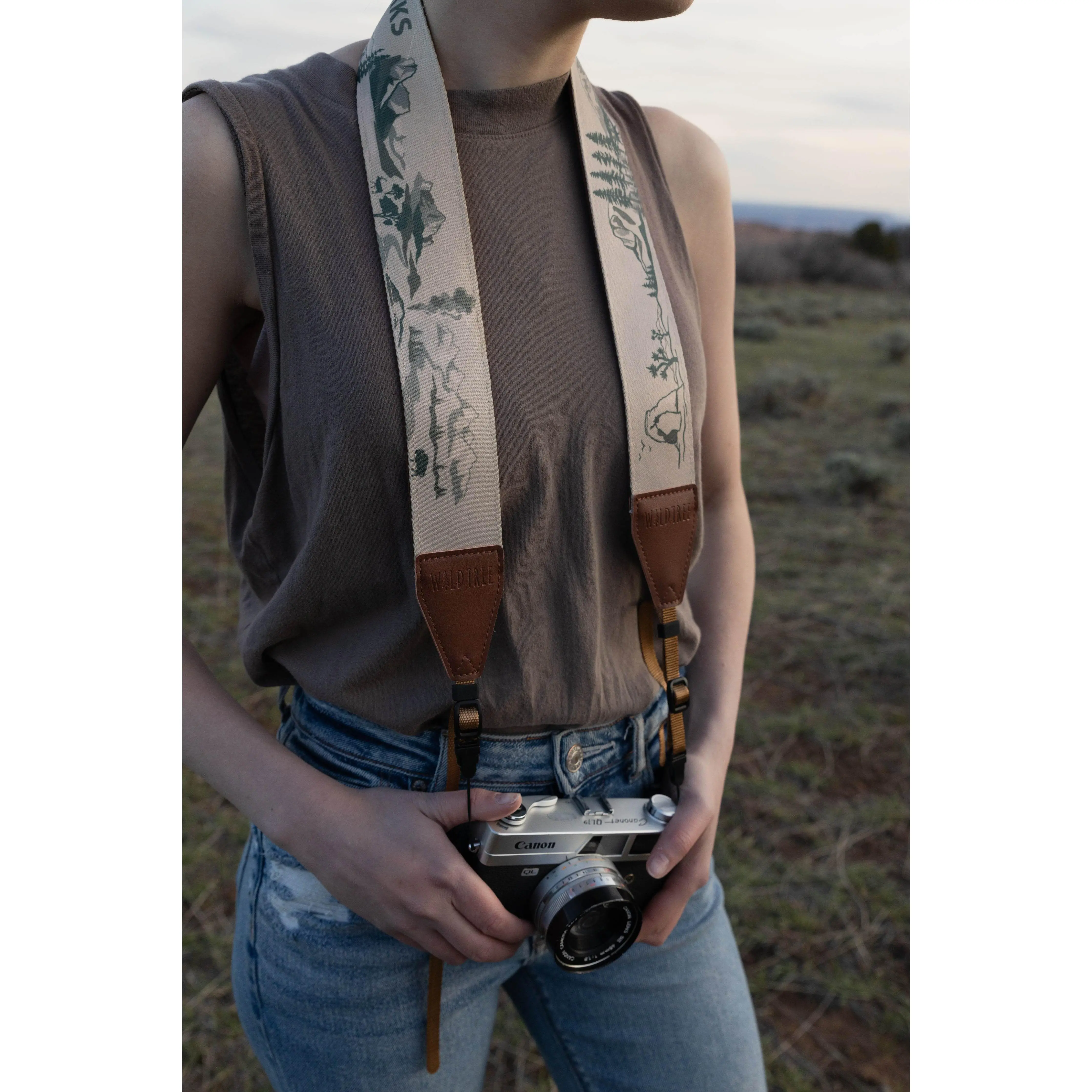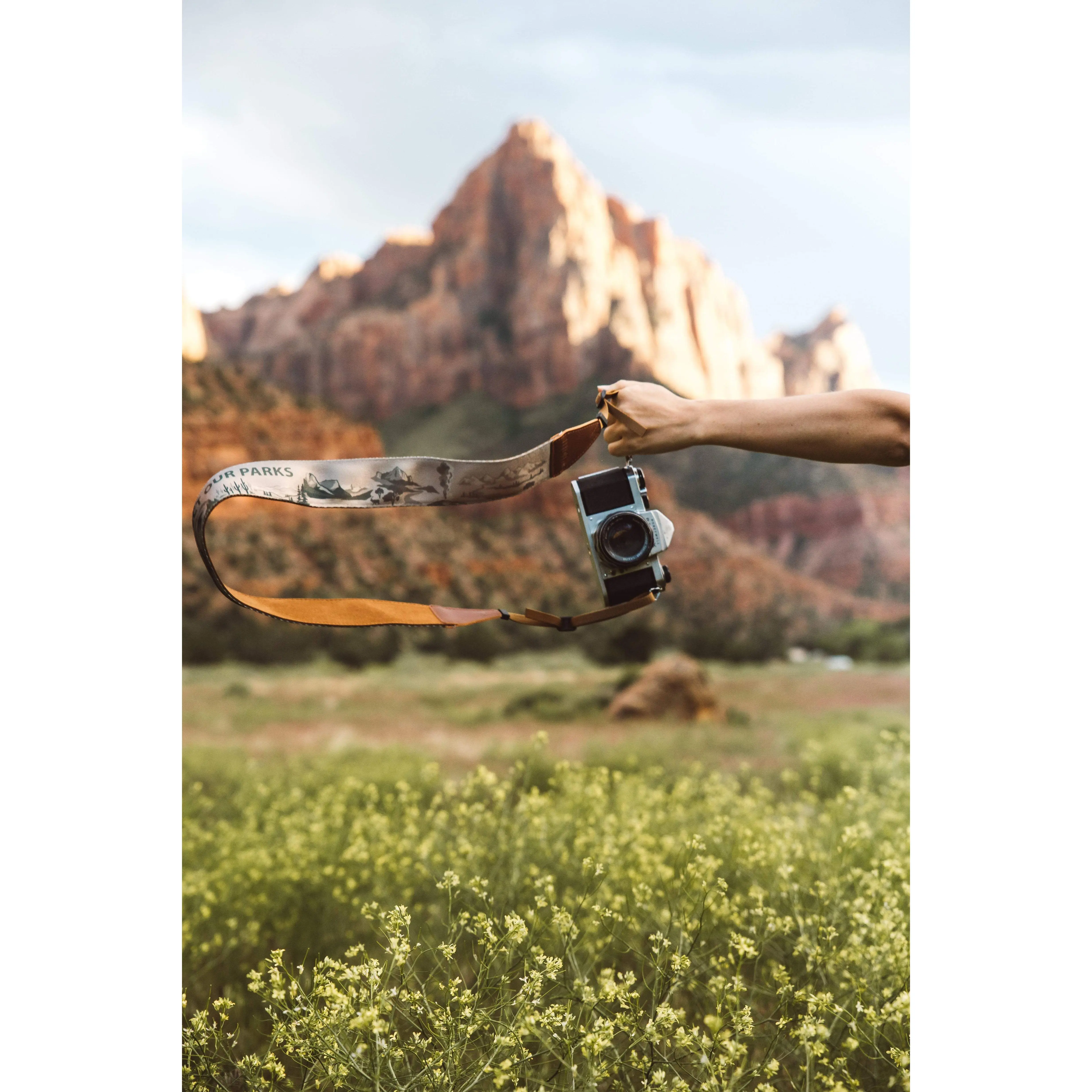 Respect Our Parks National Park inspired camera strap with brown leather ends.