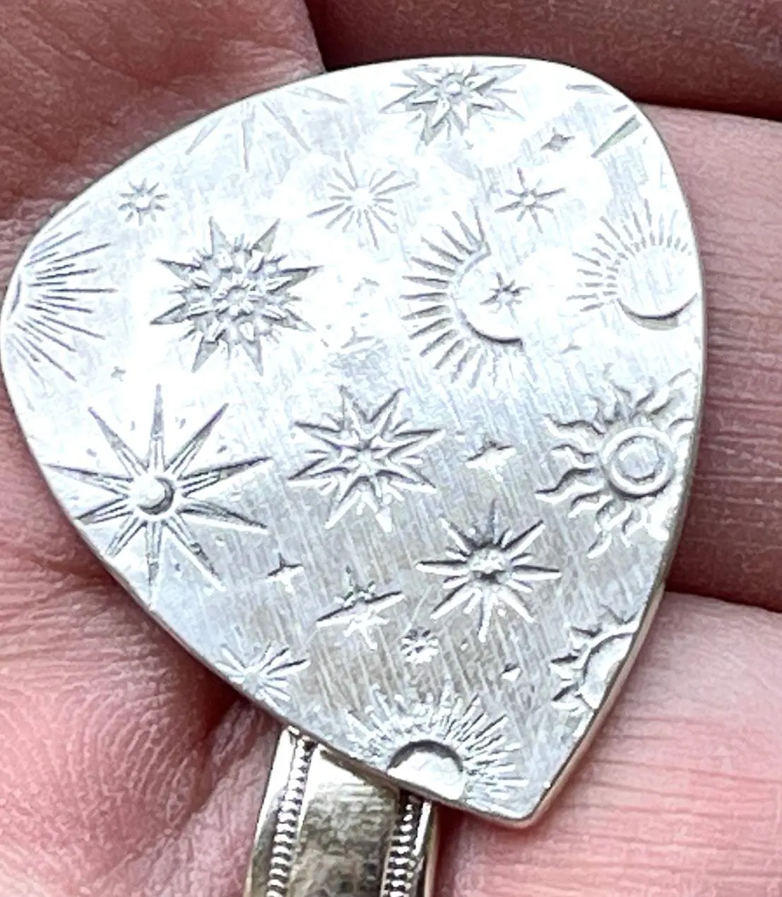 Sterling silver guitar pick with cosmic pattern