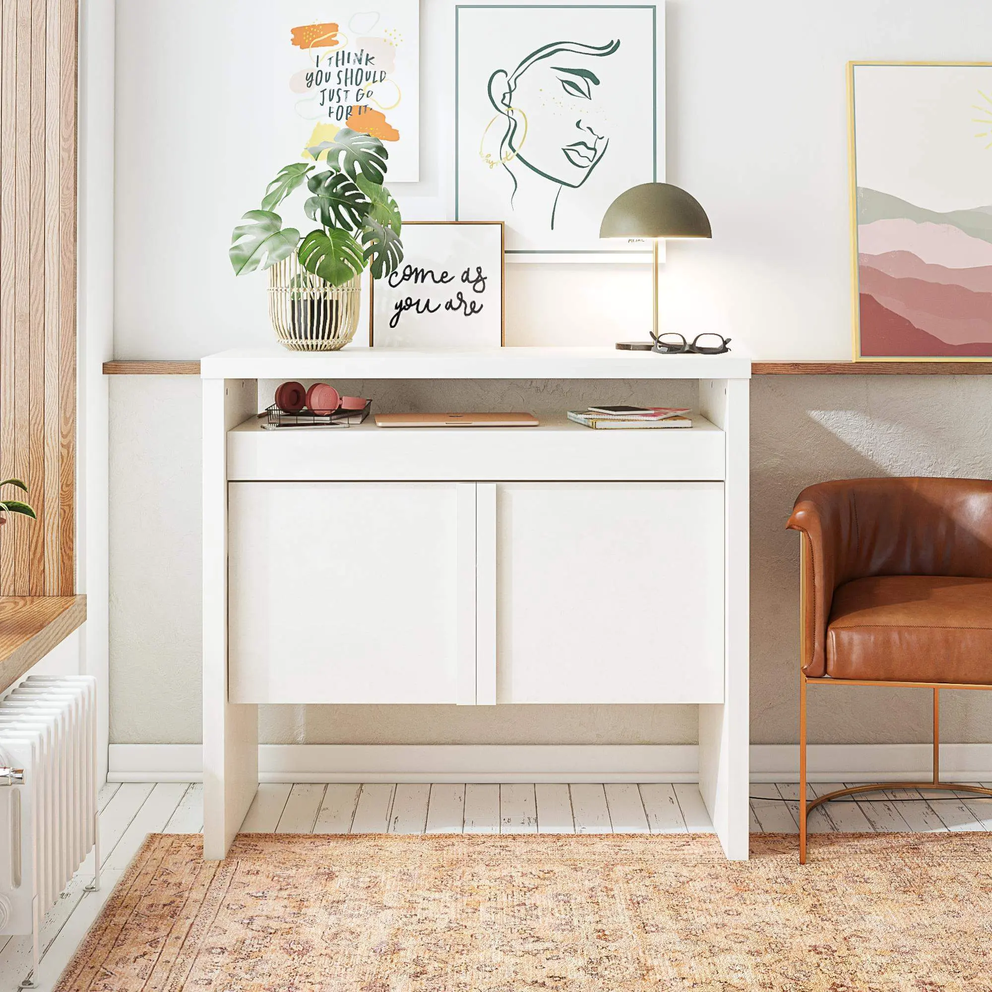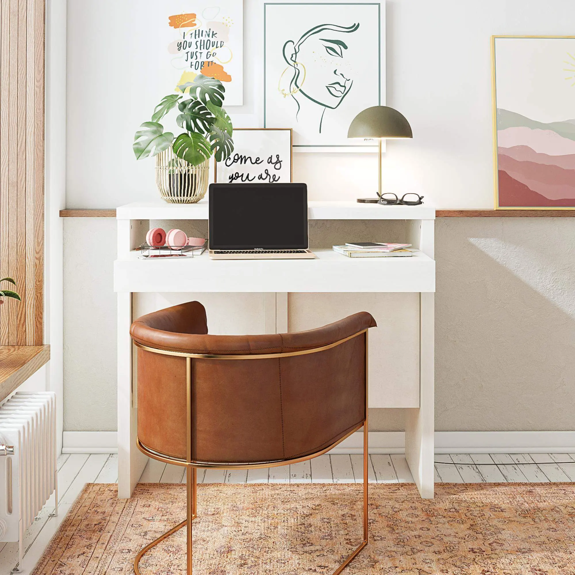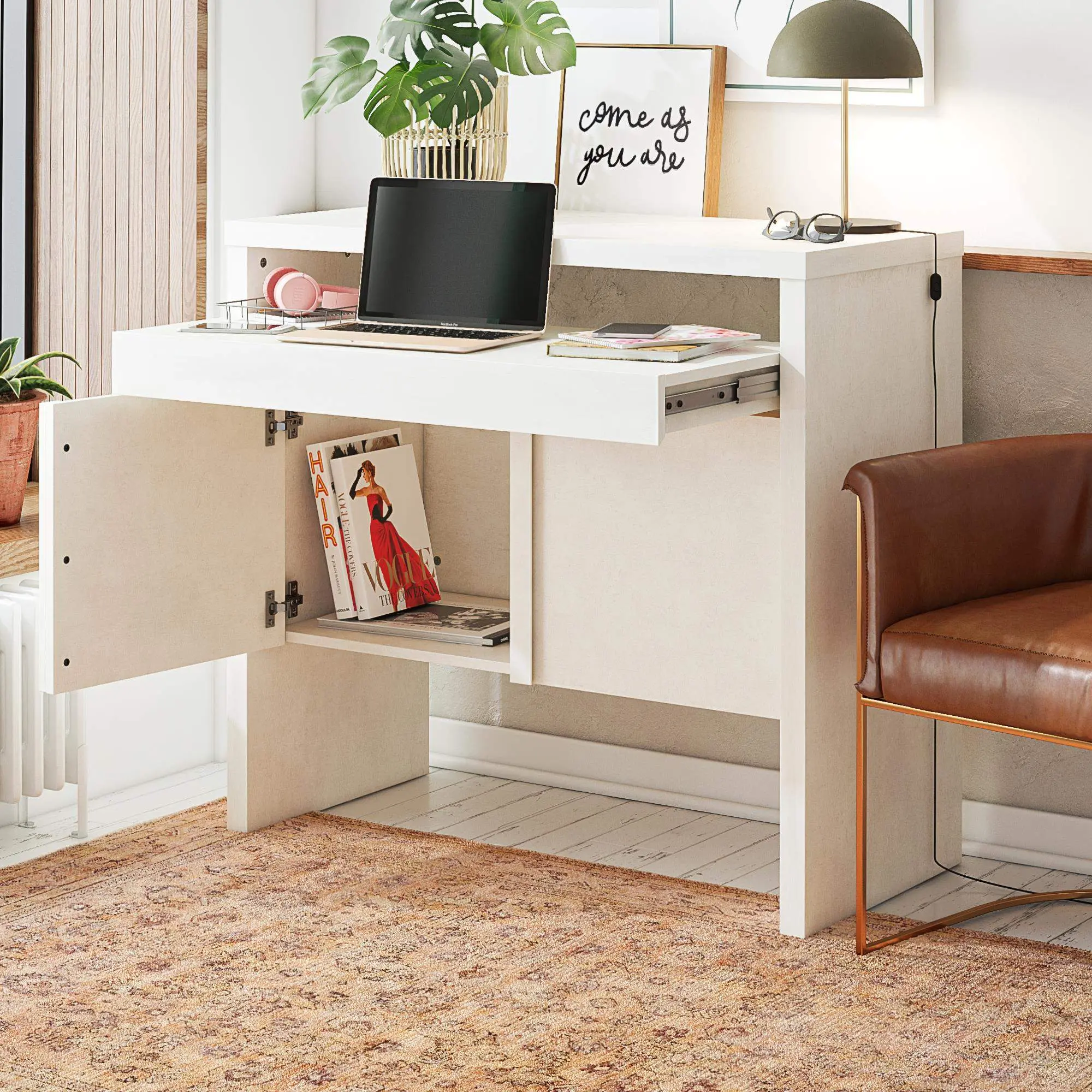 Tap into your own unique design inspiration and get ready to tell a new story with the totally transformative, Neely Collection by Mr. Kate! Textured creamy white plaster and natural wood tones take center stage in the Neely Slide Out Desk. Constructed from engineered wood and finished on all sides, the chunky construction of the Desk conceals features that both surprise and delight. We love multipurpose pieces! The slide-out desktop and hidden storage with integrated handles is the perfect place to do a little studying or much-needed work. When Neely isn’t busy being the creative cornerstone of your home office, it doubles as a chic side table for the entryway with plenty of storage behind the two roomy cabinet doors. Completely revitalize your own personal refuge with the entire Mr. Kate Neely Collection. (Each sold separately) Perfect for your aesthetic: Contemporary, Modern Dramatic, Vintage-Eclectic. Not sure how to define your style? Take the Mr. Kate “What’s My Aesthetic” Quiz for more great design inspiration ideas!