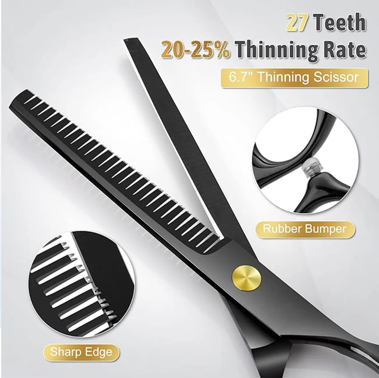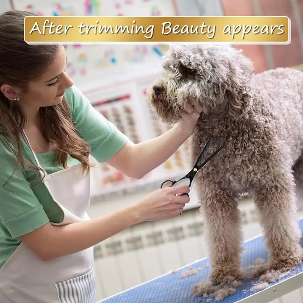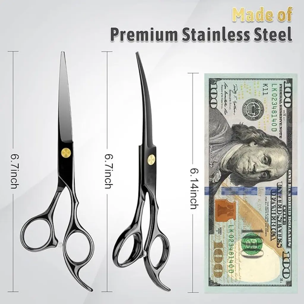 ·Professional Pet Grooming Scissors Kit-The kit includes 1 × 6.5-inch thinning shear, 1 × 6.5-inch curved scissor, 1 × 6.5-inch straight scissor, 1 × pet comb, 1 × cleaning cloth, 1 × black leather case