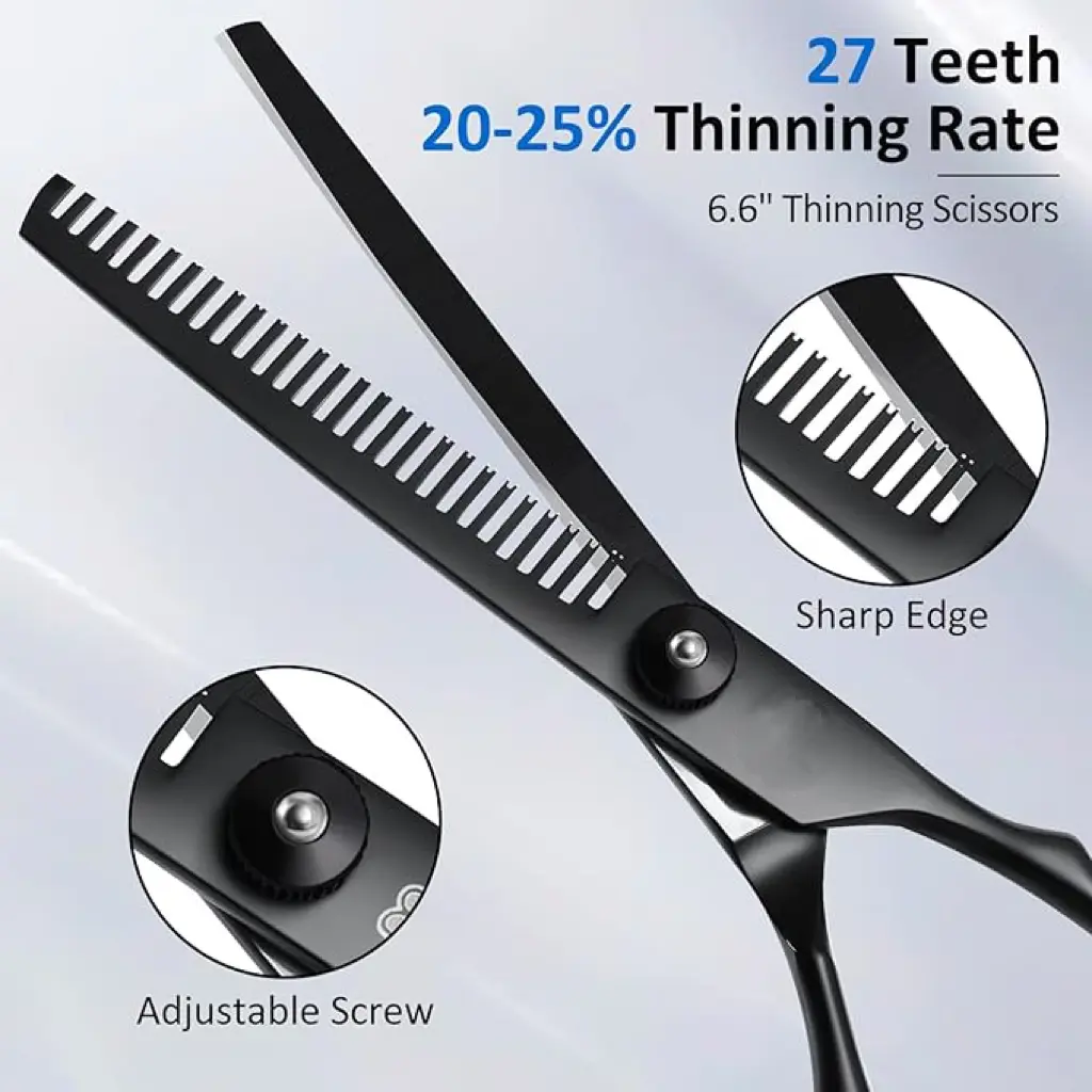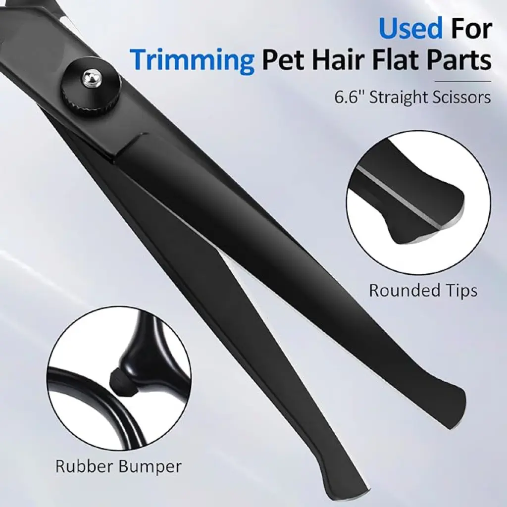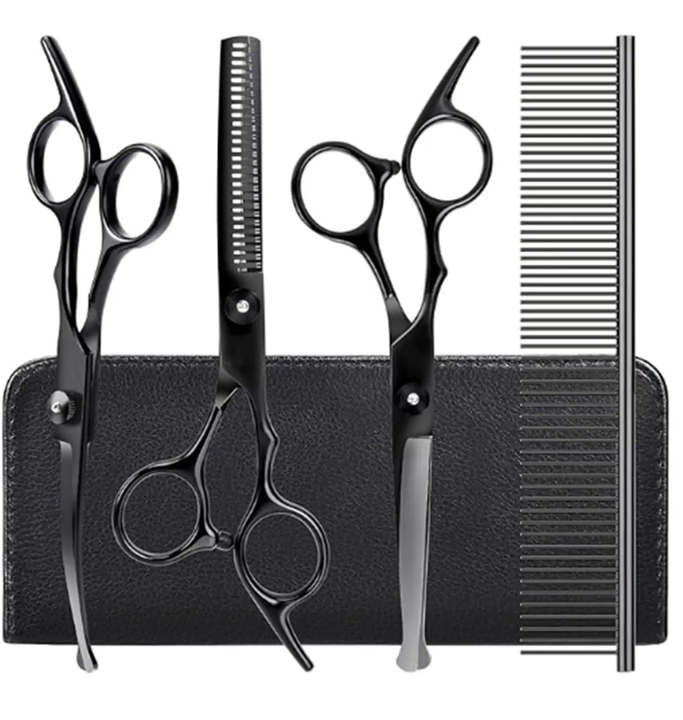 ·Professional Pet Grooming Scissors Kit-The kit includes 1 × 6.5-inch thinning shear, 1 × 6.5-inch curved scissor, 1 × 6.5-inch straight scissor, 1 × pet comb, 1 × cleaning cloth, 1 × black leather case
