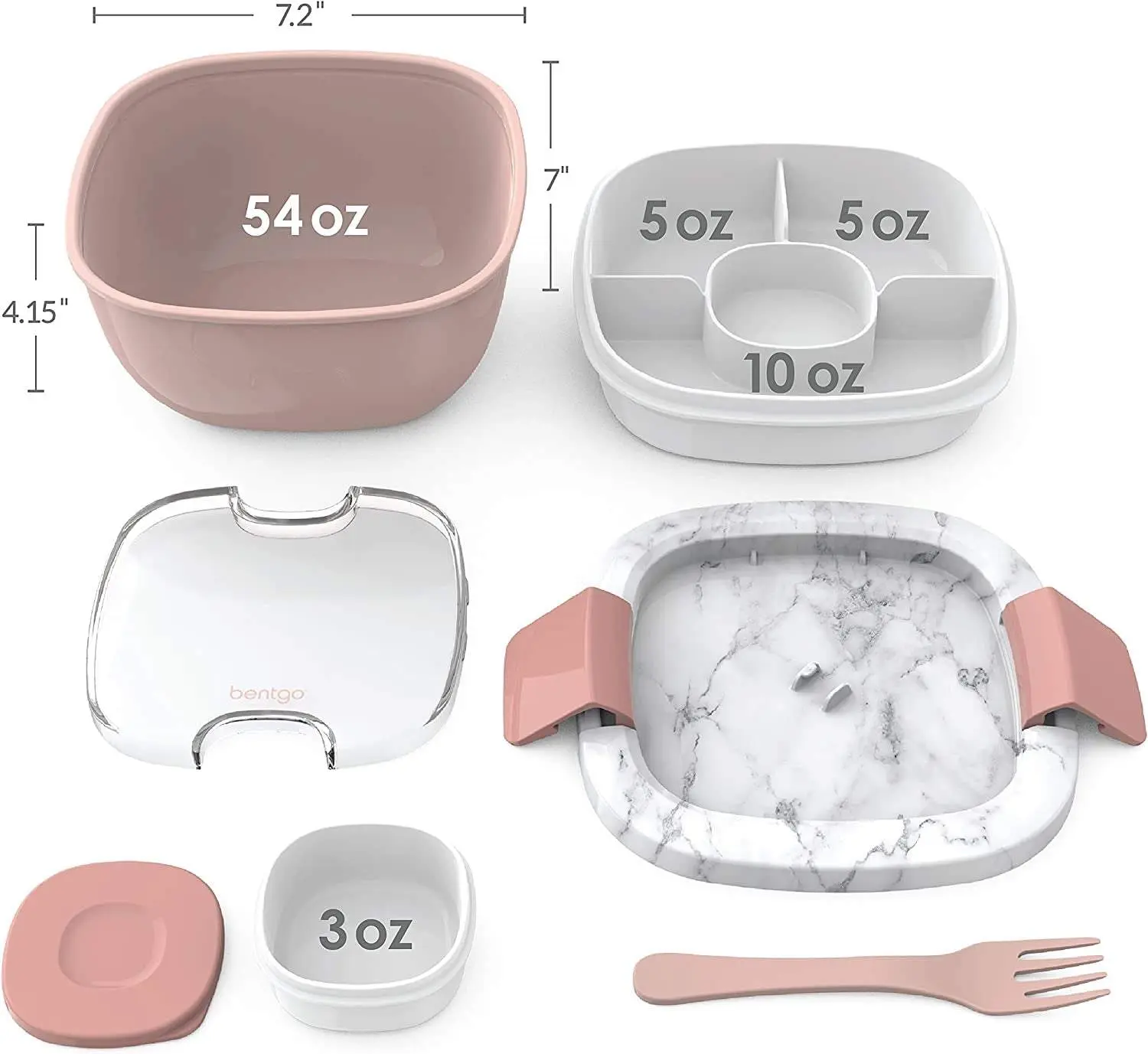 ·STORE TOPPINGS SEPARATELY: 4-compartment tray includes 1 large 10-oz compartment and 2 smaller 5-oz compartments to fit toppings of your choice, plus a leak-proof 3-oz container that's perfect for salad dressing.