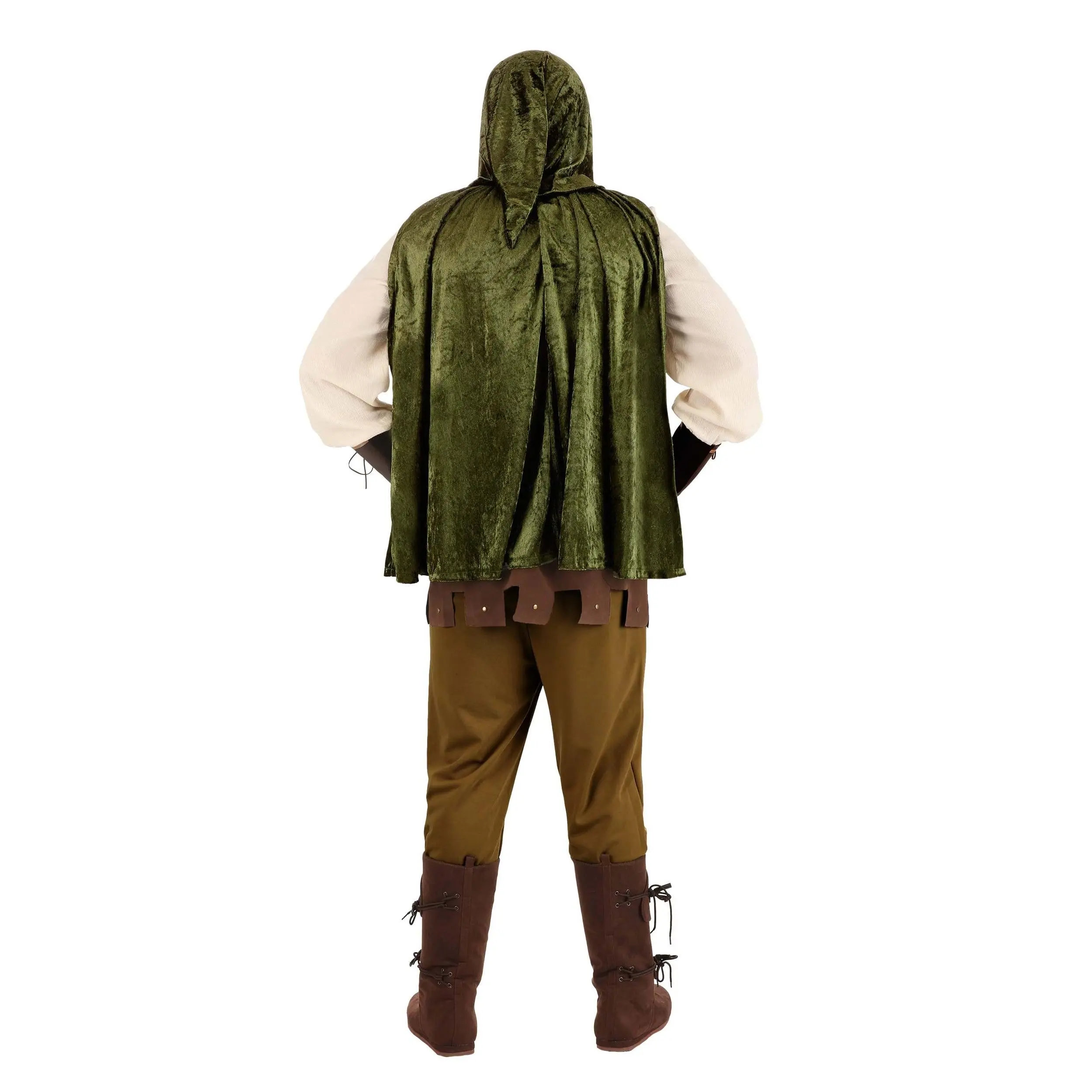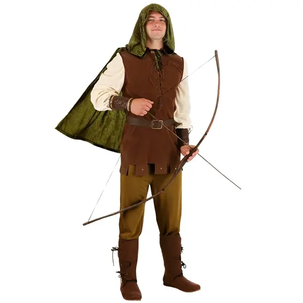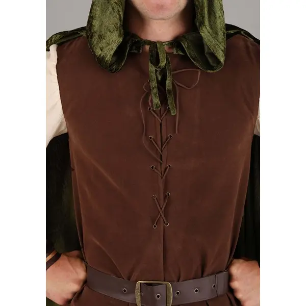Look every inch the dashing outlaw in this exclusive Deluxe Robin Hood Costume for Men! The long tunic is designed to look like a sleeveless vest worn over long-sleeved, cream-colored shirt. The "vest" portion is made of brown faux suede, has decorative lacing at the chest, and a dagged hemline studded with brass-tone rivets. A short green cape (with a hood, of course!) ties at your neck. Buckle the brown faux leather belt around your waist and slip on the faux leather wrist guards before you sneak into Sherwood Forest.