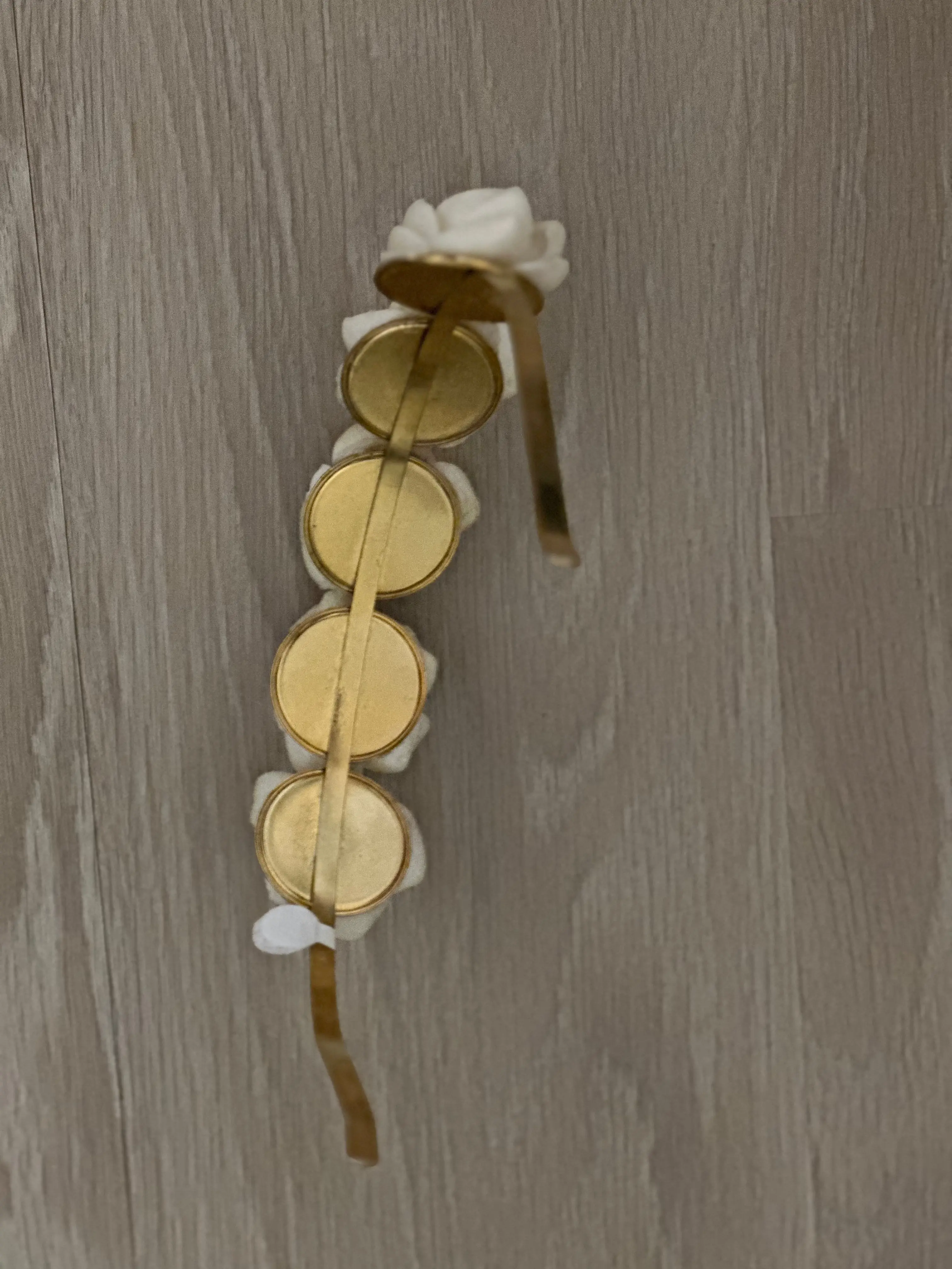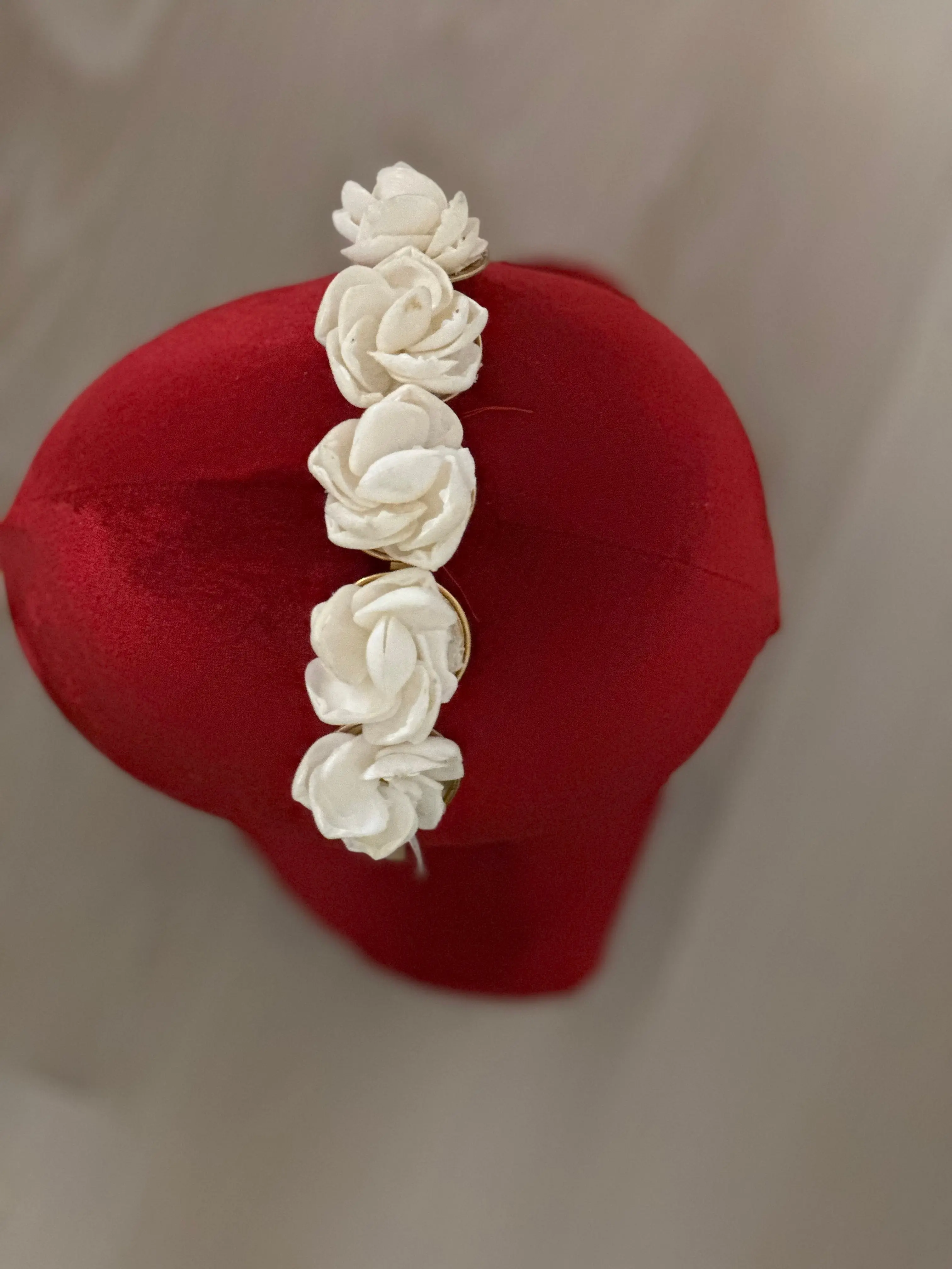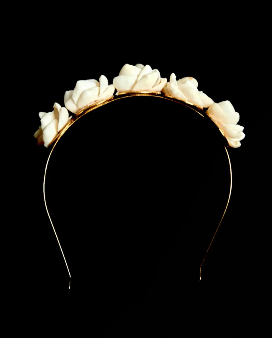 Handmade Shell Rose Headband plus Ring. This unique set showcases intricately crafted pieces, with natural shells shaped as roses that have a subtle, romantic touch. Both the headband and ring are carefully crafted, making them perfect for any special occasion. Slightly damaged flower on headband. Sample.