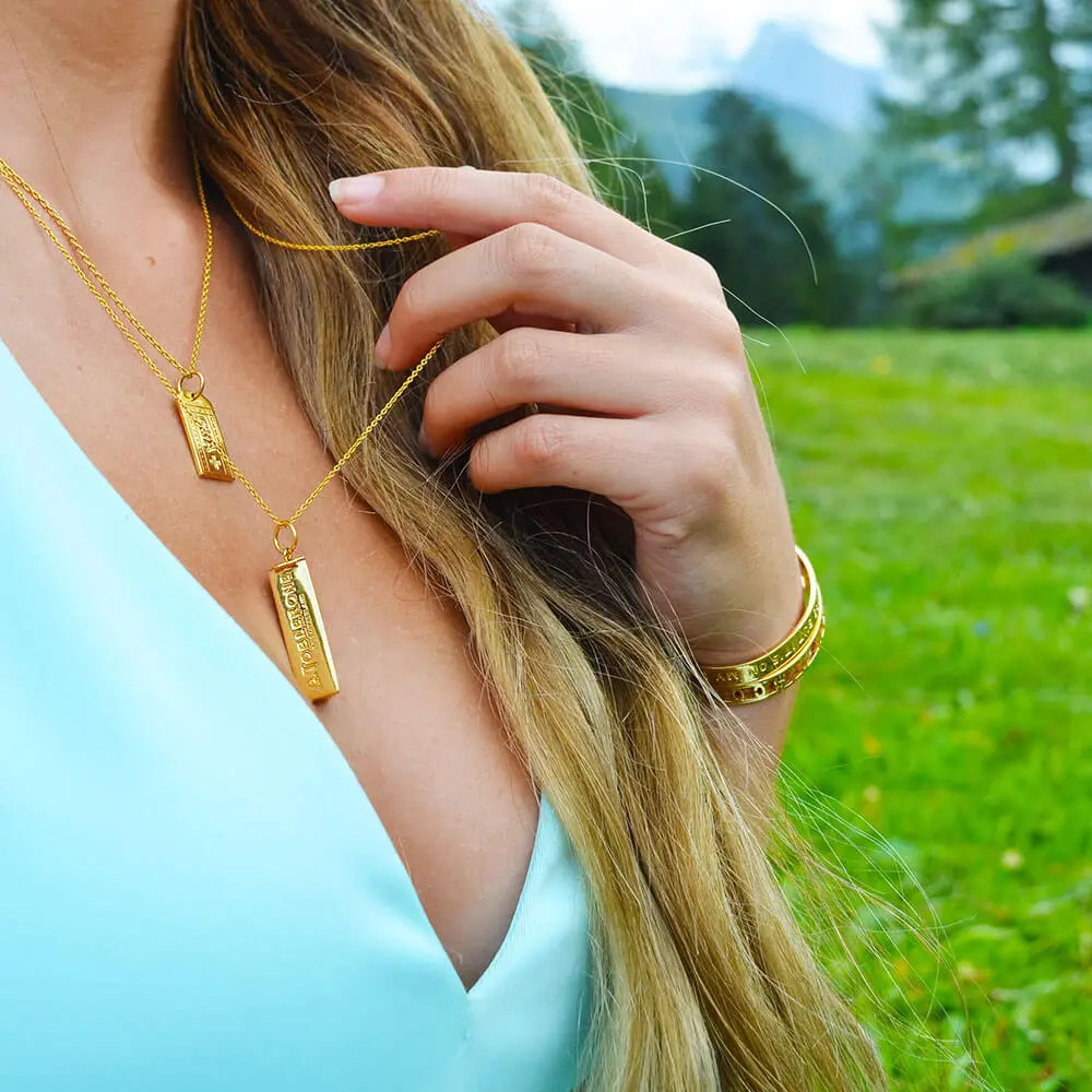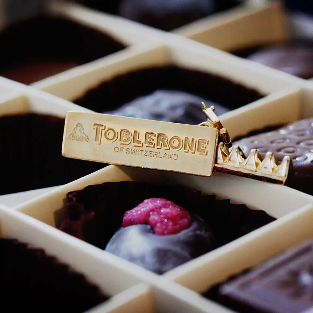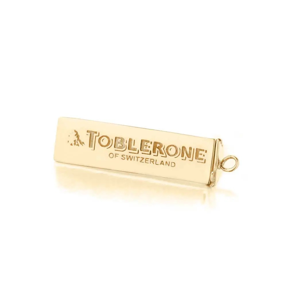 Our Swiss Chocolate Charm pays homage to everyone’s favorite duty-free chocolate. Our version of the honey and almond speckled treat can be taken out of its enclosure, which is secured via a small chain.