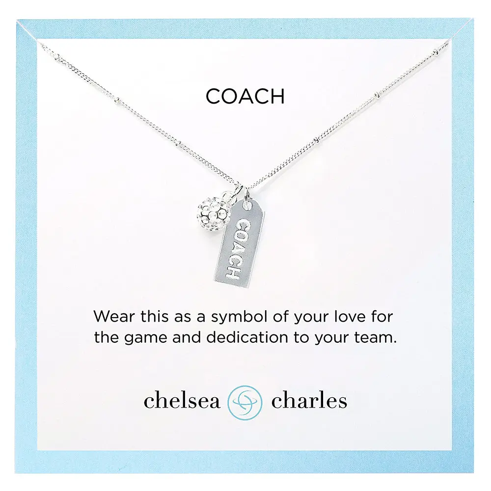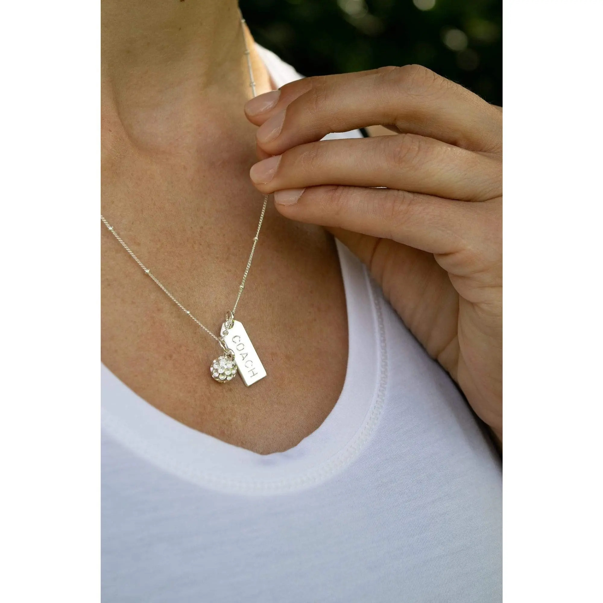 This Golf Coach necklace was designed as a symbol of dedication to team and sport. Sterling silver plated golf ball charm (8mm) and reversible COACH tag (.35 x .7") on 18" sterling silver chain. Makes a thoughtful gift for any golf coach.
