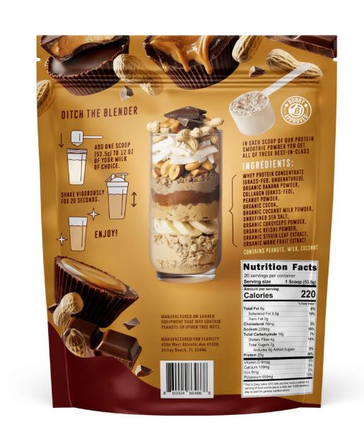 Our Chocolate Peanut Butter Protein Smoothie combines rich chocolate with creamy peanut butter for a crave-worthy, dessert-like flavor—made with 100% grass-fed whey. We keep it simple with real ingredients like organic cocoa powder and peanut flour to round out that classic chocolate–peanut butter taste. Each serving packs: 25g of protein, 10g of collagen, fruits, and functional mushrooms (cordyceps & reishi). Rather than buying all the ingredients separately, everything you need is now packed into one scoop for only $2.99 per serving. And the best part? No blender needed—just add milk or water, shake, and enjoy.