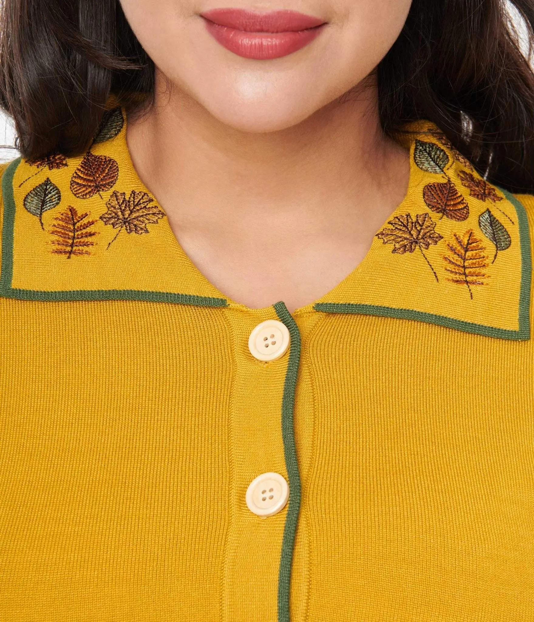 This cozy knit cardigan features a delightful mustard yellow hue, complemented by vibrant green piping. The charming fall leaves embroidered on the collar neckline add an extra touch of whimsy. With its long sleeves and easy button-up front, this cardigan is perfect for those crisp autumn days.Available in sizes XS-XXL while supplies last.