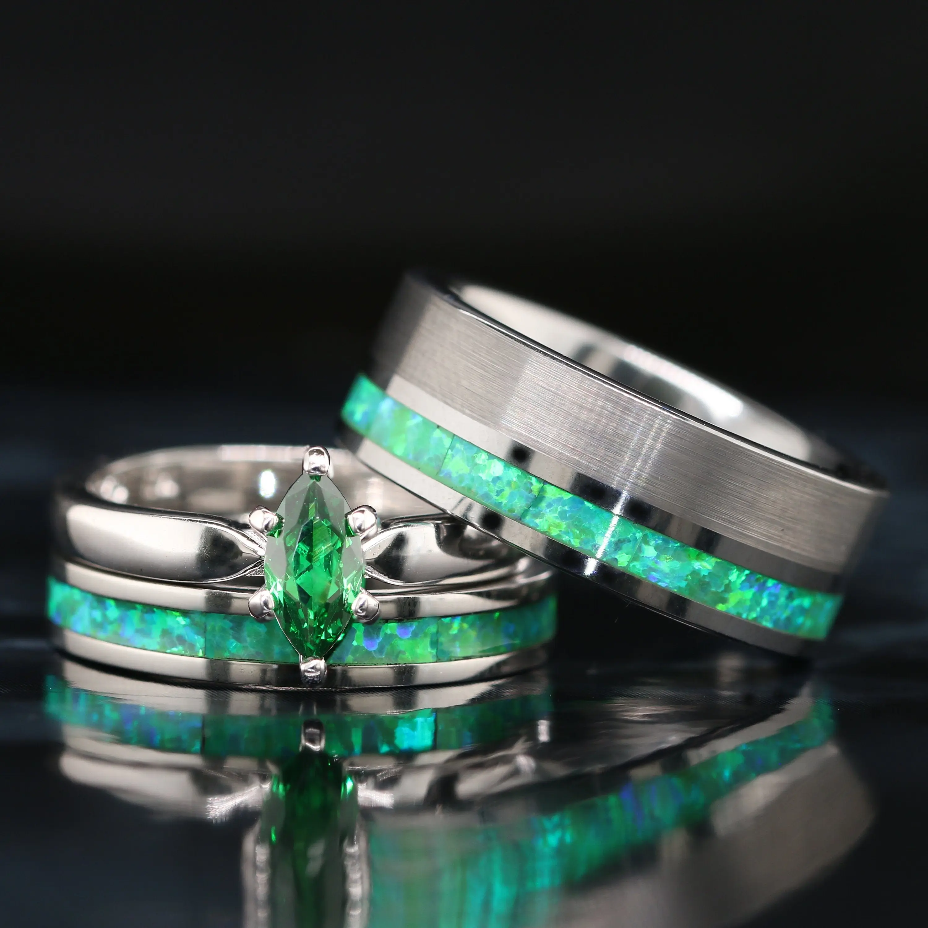 This gorgeous engagement/wedding ring set is made of surgical stainless steel, sterling silver and tungsten. The wedding bands are decorated with green Opal.