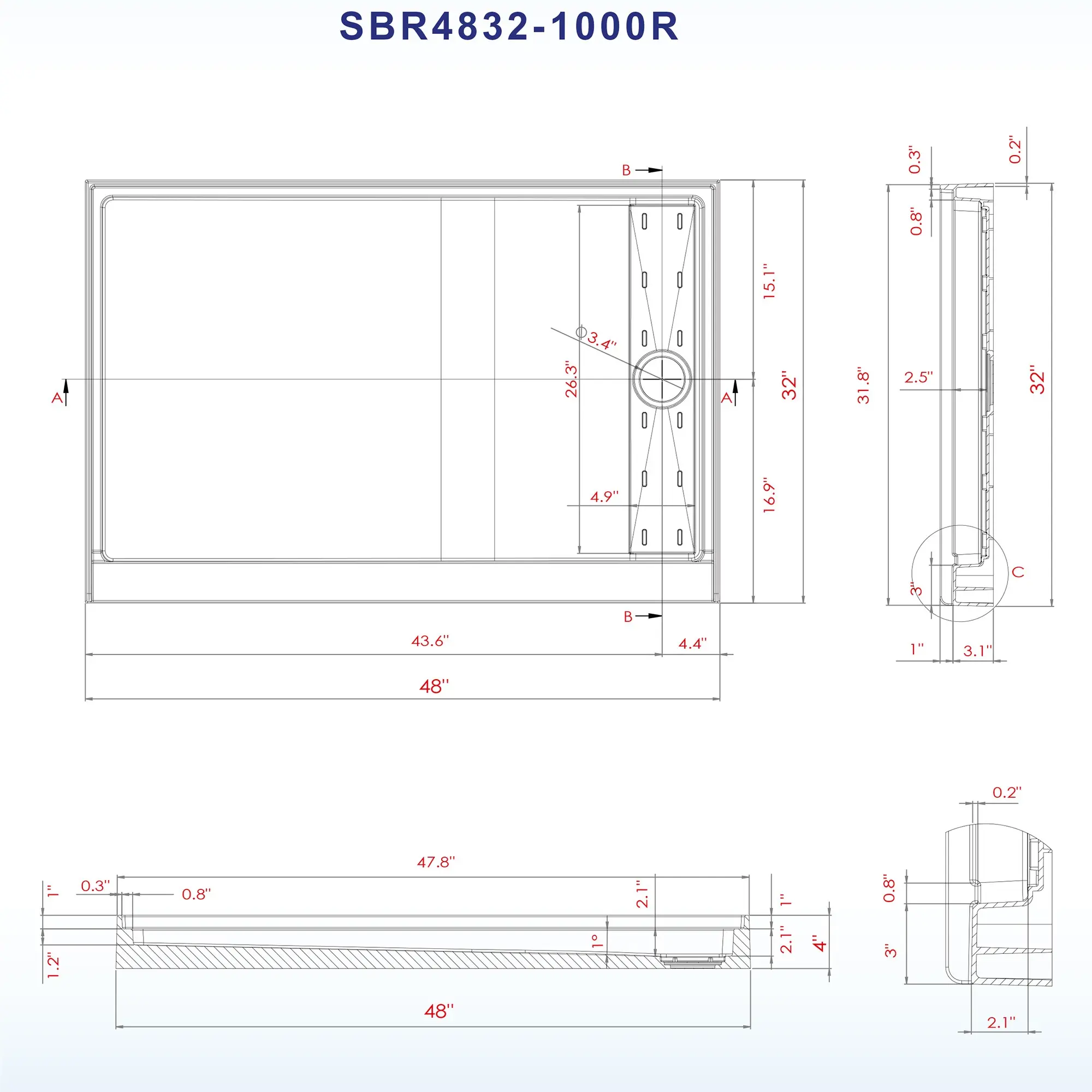 [DIMENSIONS]:WOODBRIDGE Solid Shower Base SBR4832-1000R 48 in L x 32 in W x 4 in H, Drain Location: Right, Matte Black Drain Cover.