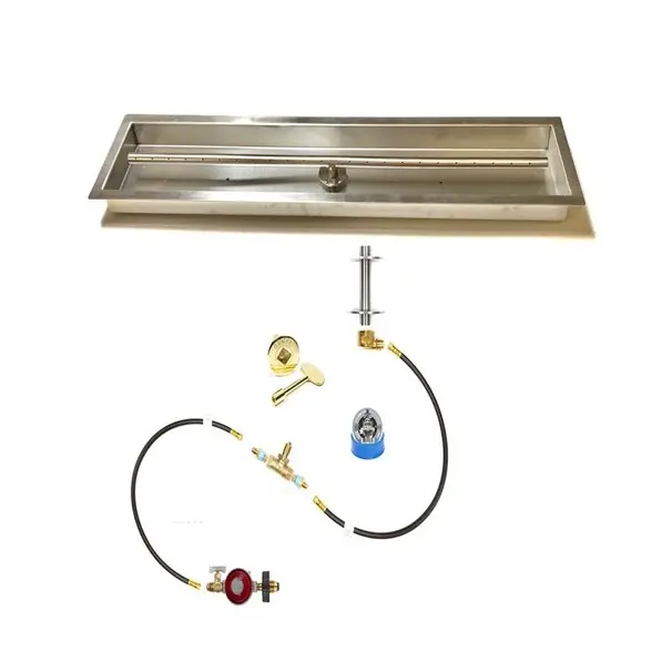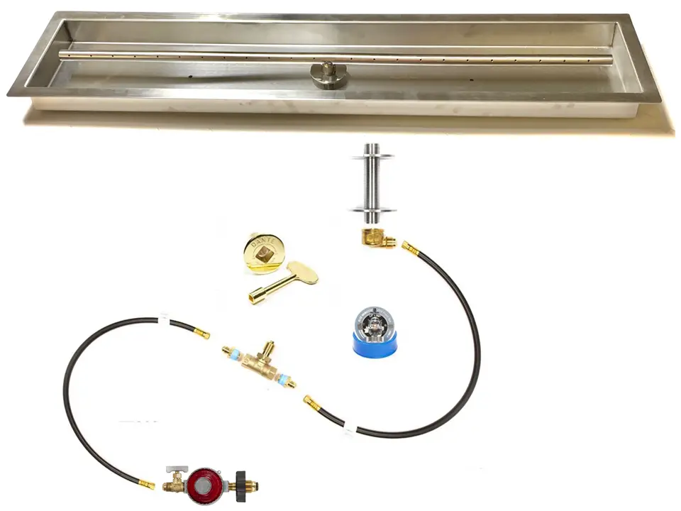 The connection kit includes a stainless steel burner pan and burner, key valve control, adjustable propane tank regulator, hoses, and all fittings needed to connect ensuring optimal heat output and a stunning flame display every time you use it.