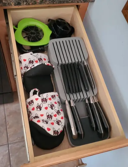 The sleek and modern design of this knife organizer adds a touch of sophistication to your kitchen drawers. The neutral color scheme complements any kitchen decor, and the compact size allows it to fit seamlessly into most standard drawers.