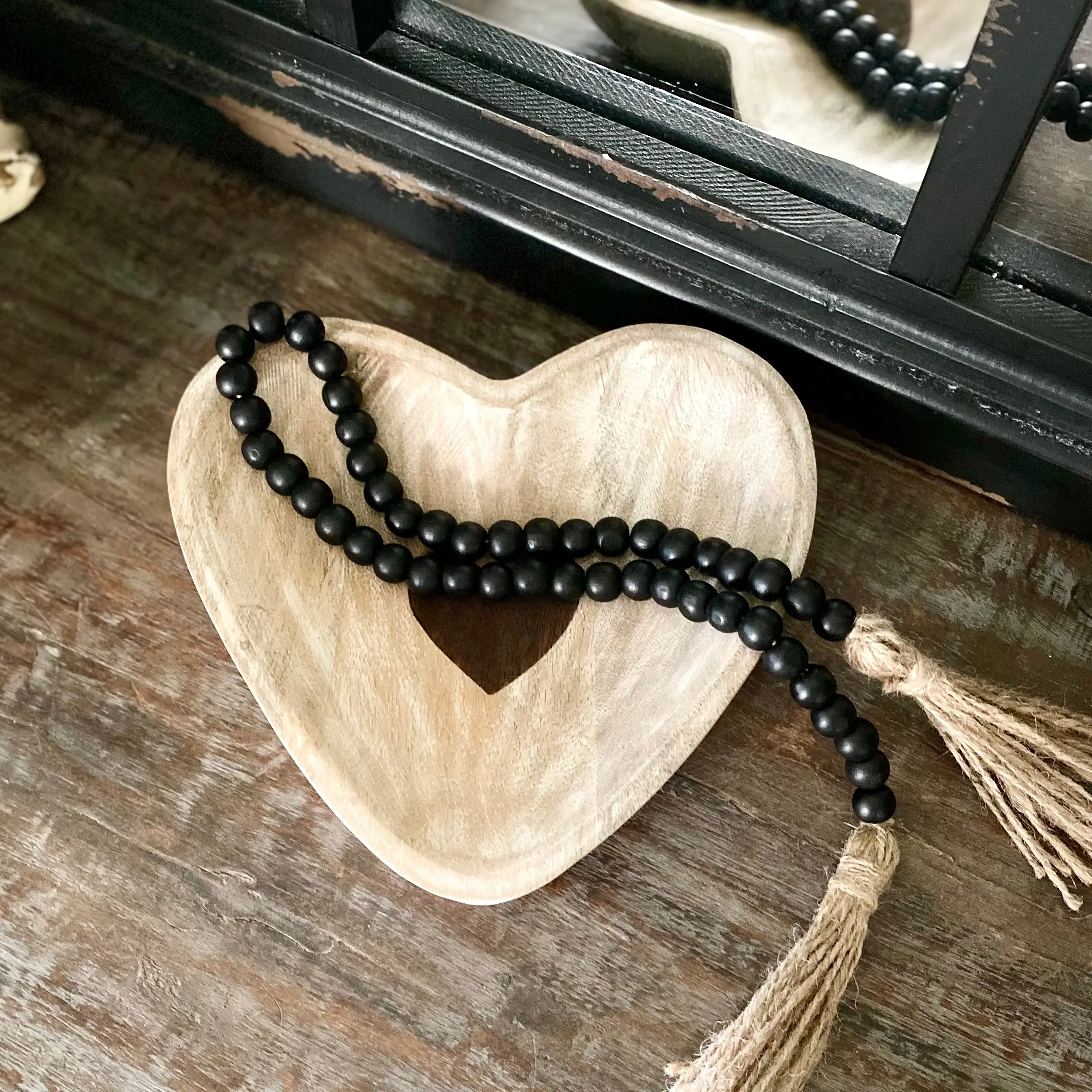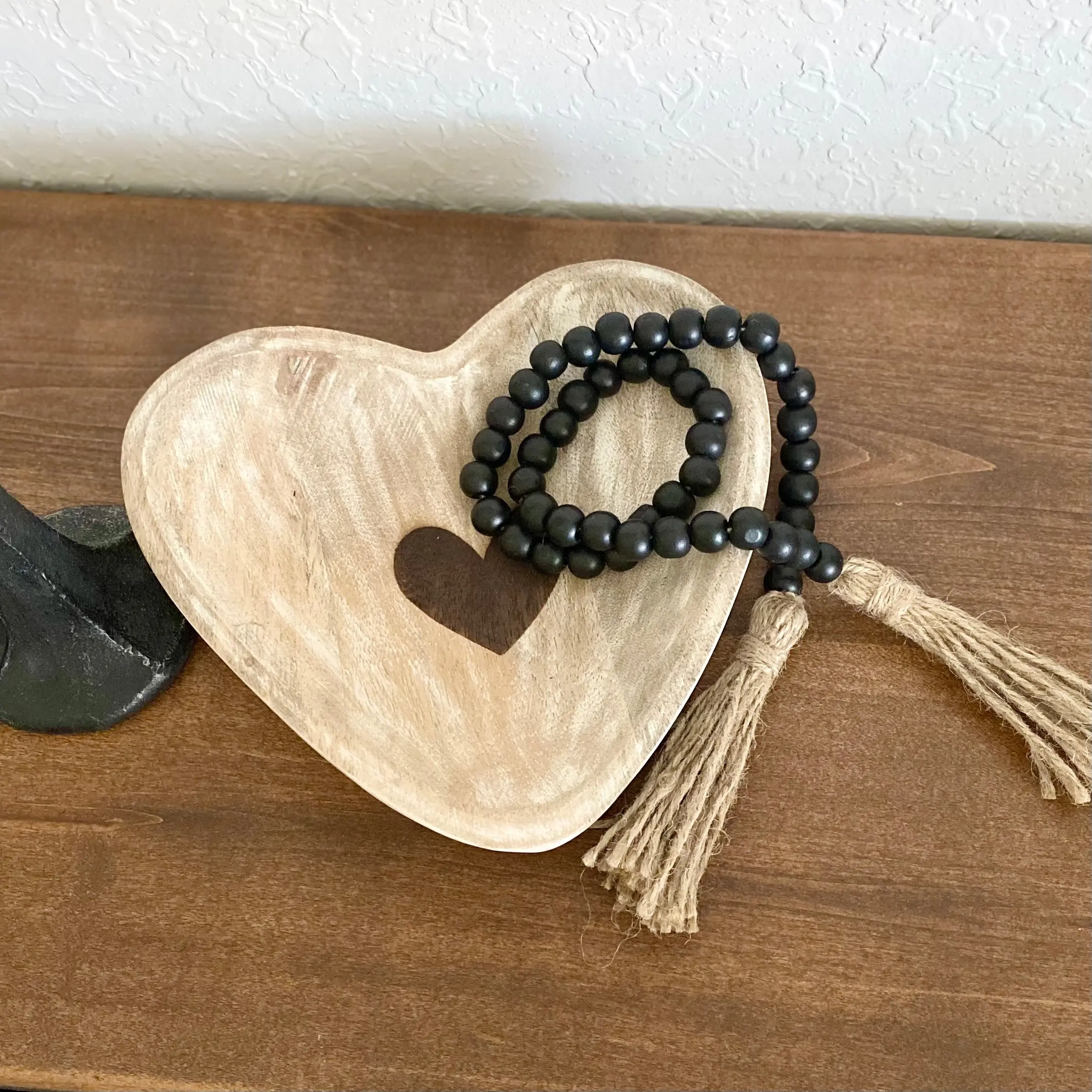 This minimalist Black Bead Garland can be tossed onto a tray or bowl display, wrapped around the neck of a vase, or strewn across a stack of books. Featured here with our Carved Heart Bowl
