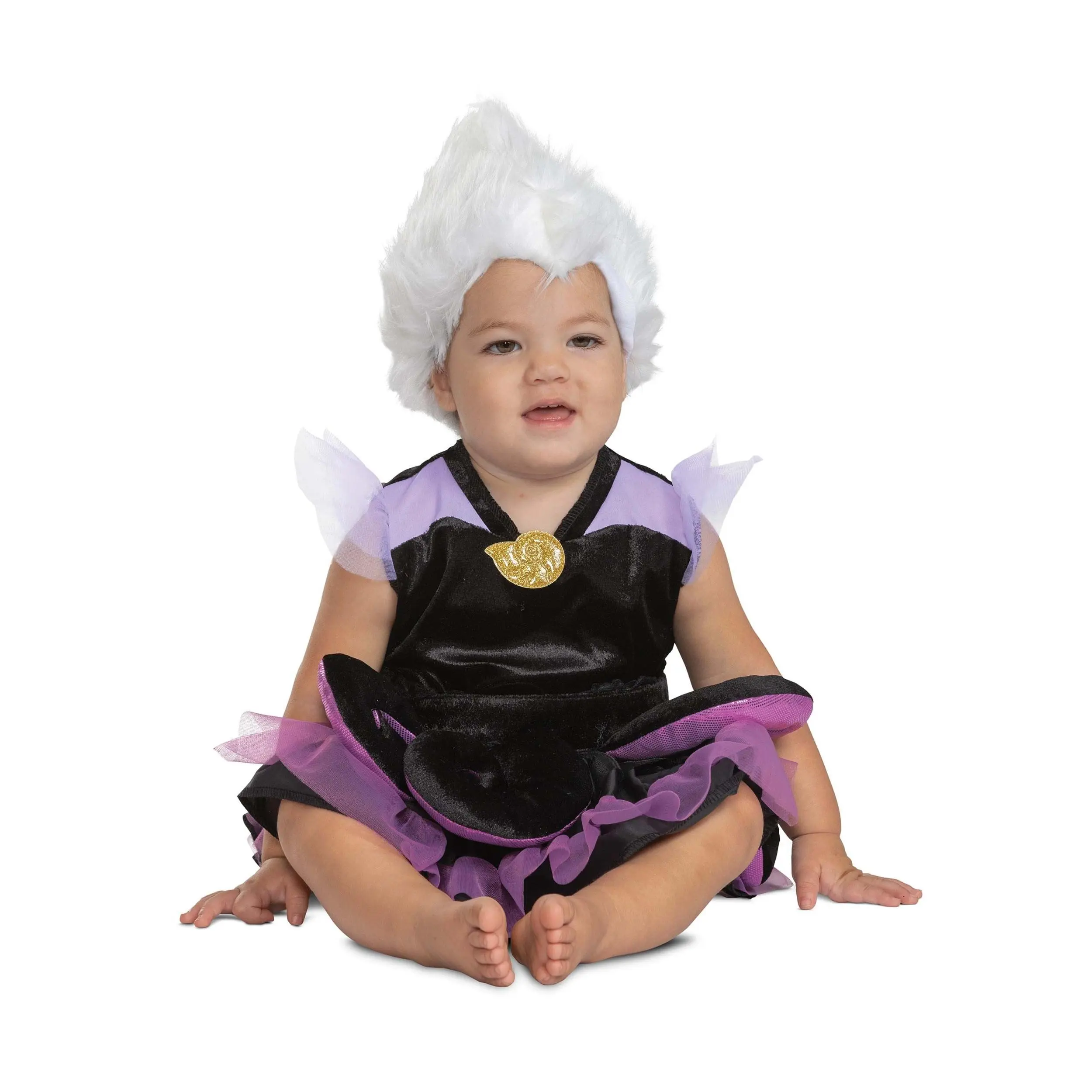 Your child will look darling and devious in this officially licensed The Little Mermaid Infant Ursula Costume! The dress fastens at the center back and is made of soft black velour with purple accents. The neckline is decorated with a shell made of golden fabric, and the shoulders are sewn with sheer tulle wings. The skirt is trimmed with a ruffle made of purple tulle. A black velour belt sewn with soft-sculpted squid tentacles made of black and purple fabric attaches behind the waist.