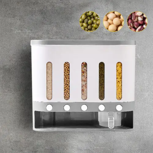 Large Capacity: Large capacity can hold allkinds of dry food. Make your kitchen clean and tidy. The large compartments onboth sides can hold 2.1kg of grains, and the middle three small compartmentscan hold 1.6kg of grains each