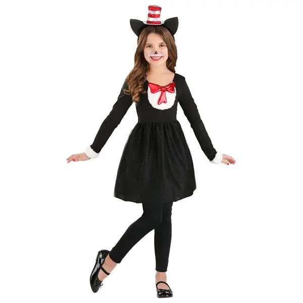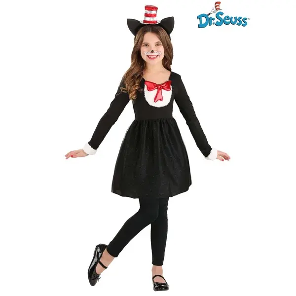 This fully licensed Dr. Seuss Cat in the Hat costume is comfortable and cute, making it a great choice for school events as well as Halloween. The dress has hook & loop fastener at the back, making it easy for kids to slip over their heads by themselves. Your kid will love the sparkly skirt that's flared for twirl-factor. The top is trimmed with white faux fur around the neck and sleeve cuffs. A giant shiny bow is attached to the chest, just like the Cat in the Hat's. Topped off with the striped hat and ears that are attached to the headband, this costume is ready for showtime as soon as it arrives.