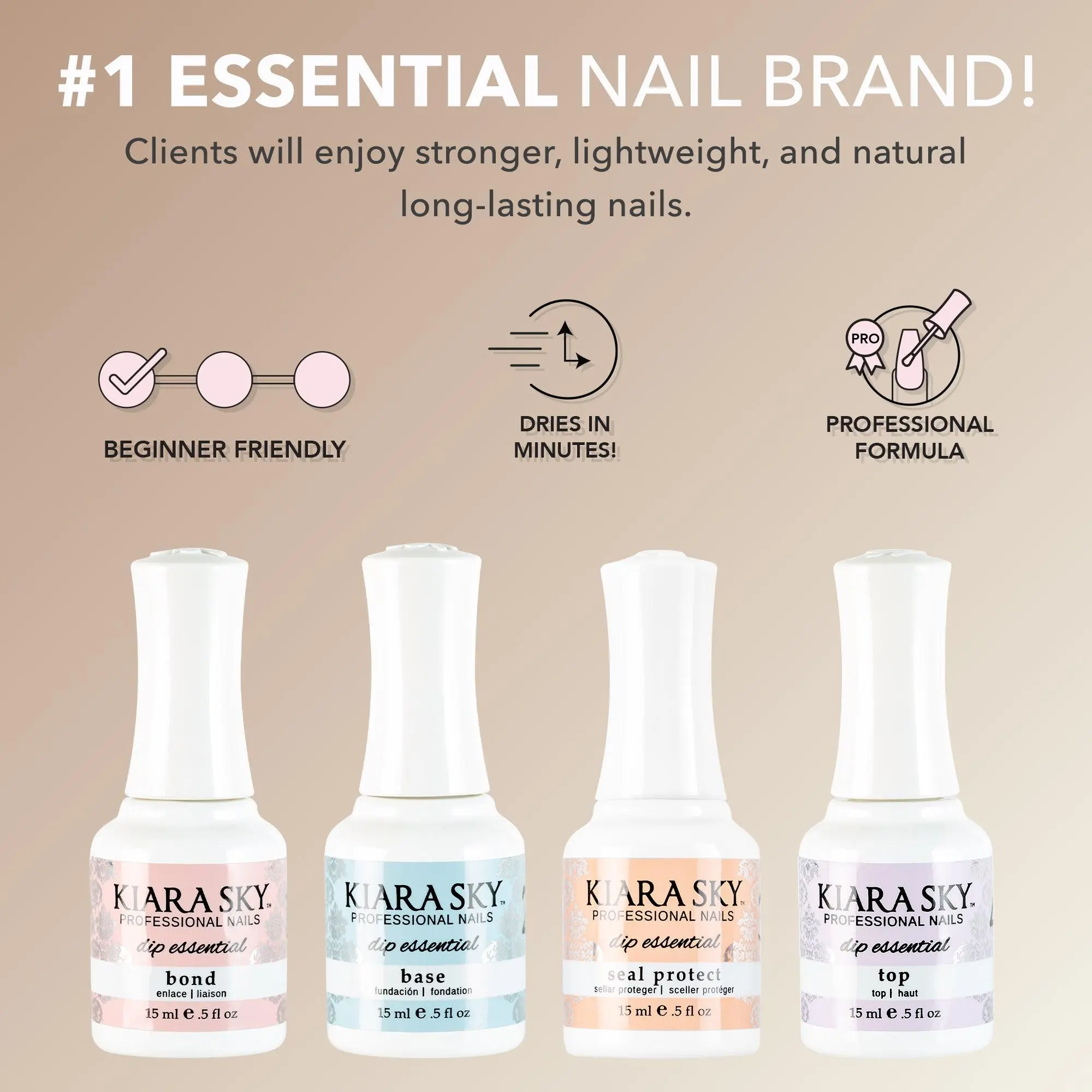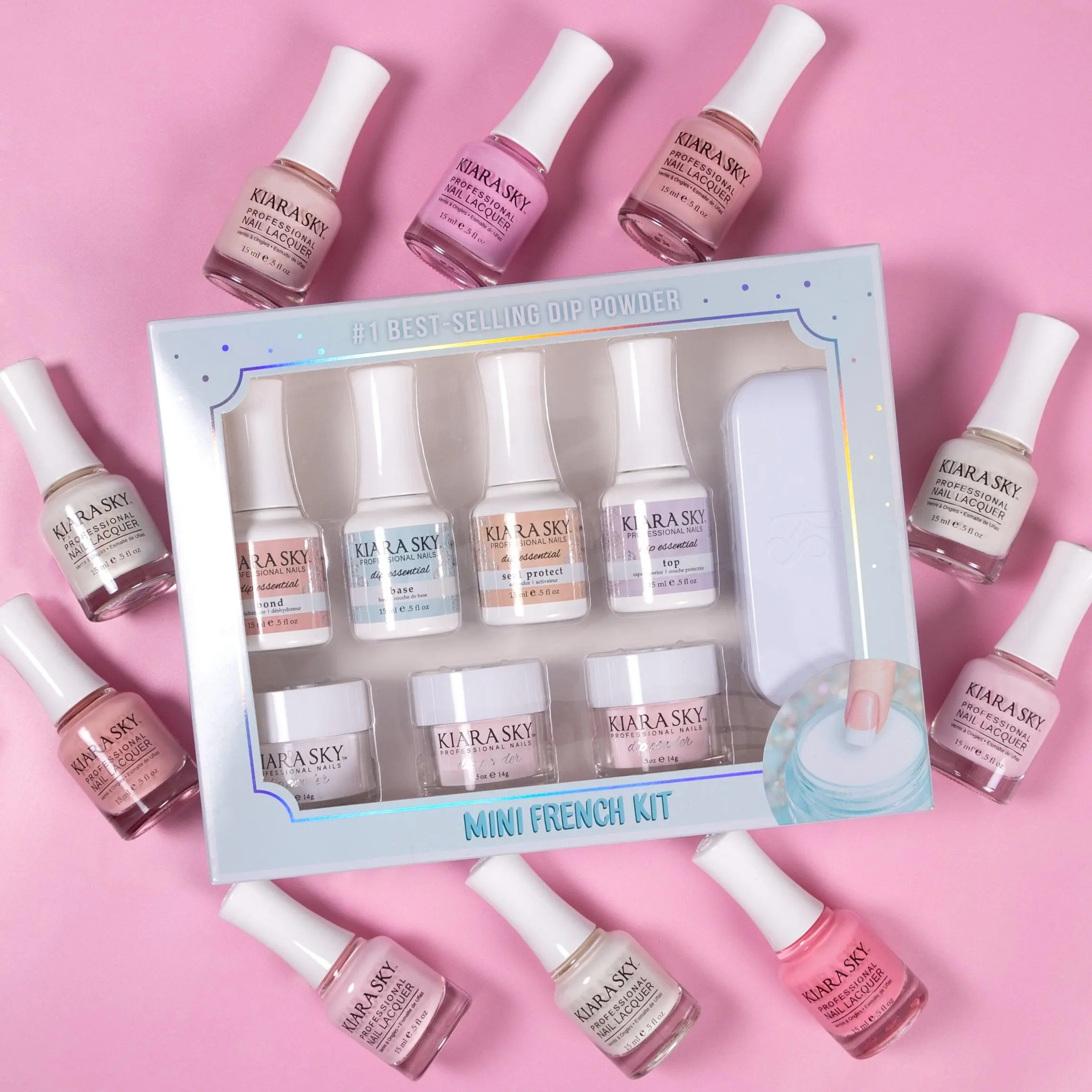 Get stronger, light-weight, and natural long-lasting salon-style nails with the Kiara Sky Mini French Dip Kit! Our easy-to-use dip powders feel natural, do not damage the nail bed, and are a healthier alternative in nail enhancements.