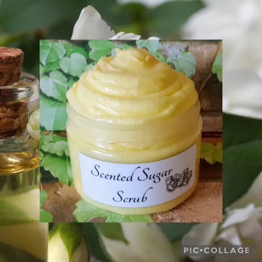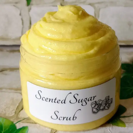 Scented Sugar Scrub Ingredients: Granulated Sugar, Purified Water, Coconut Oil, Sunflower Oil, Emulsifying Wax, Shea Butter, Stearic Acid, Cetyl Alcohol, Carbomer Otiphen Plus (natural preservative), Skin Safe Fragrances and Dyes.