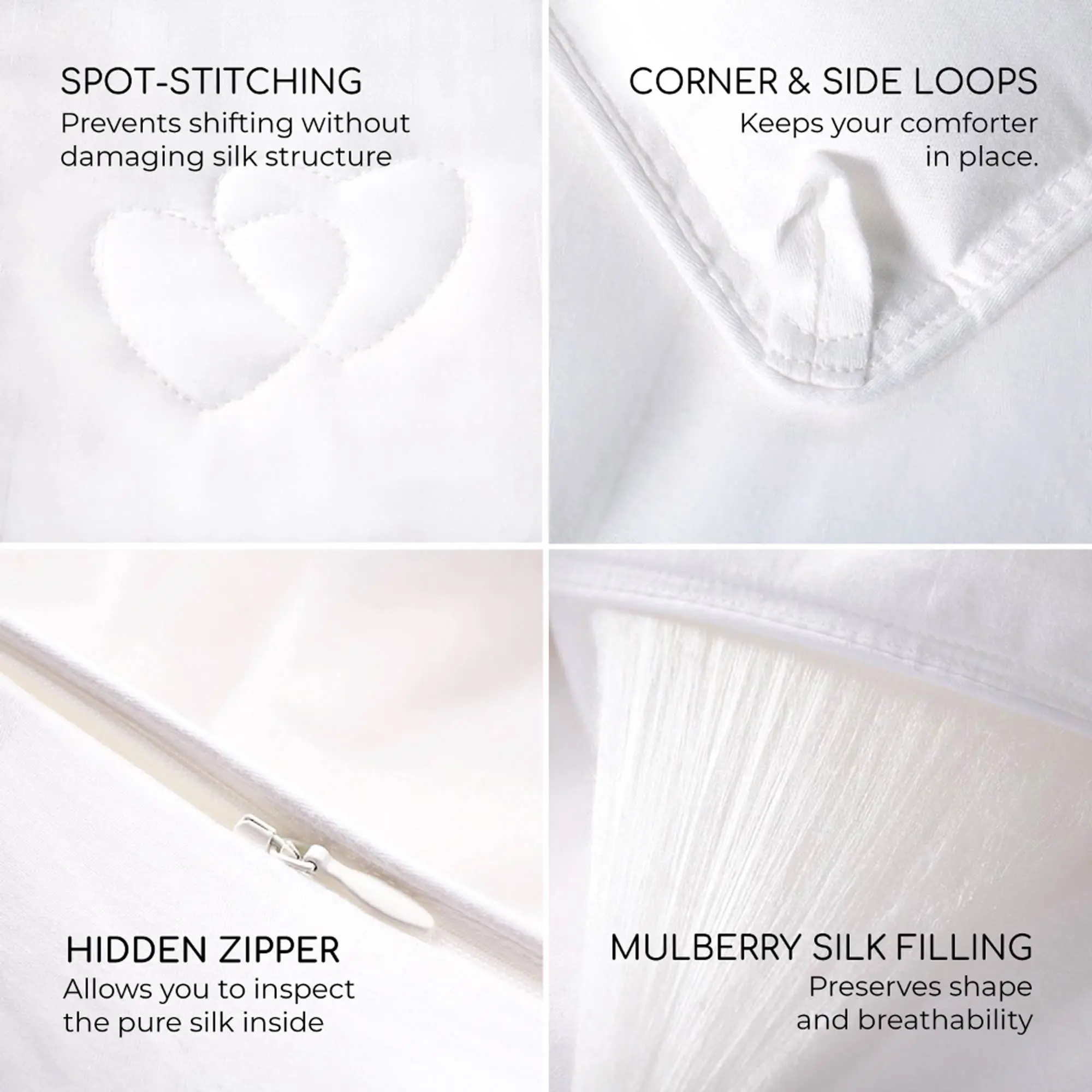 ·[DETAILS] A short zipper on the side for silk-strand filling authenticity inspection. Eight loops are designed to secure the duvet insert in place with your duvet cover.