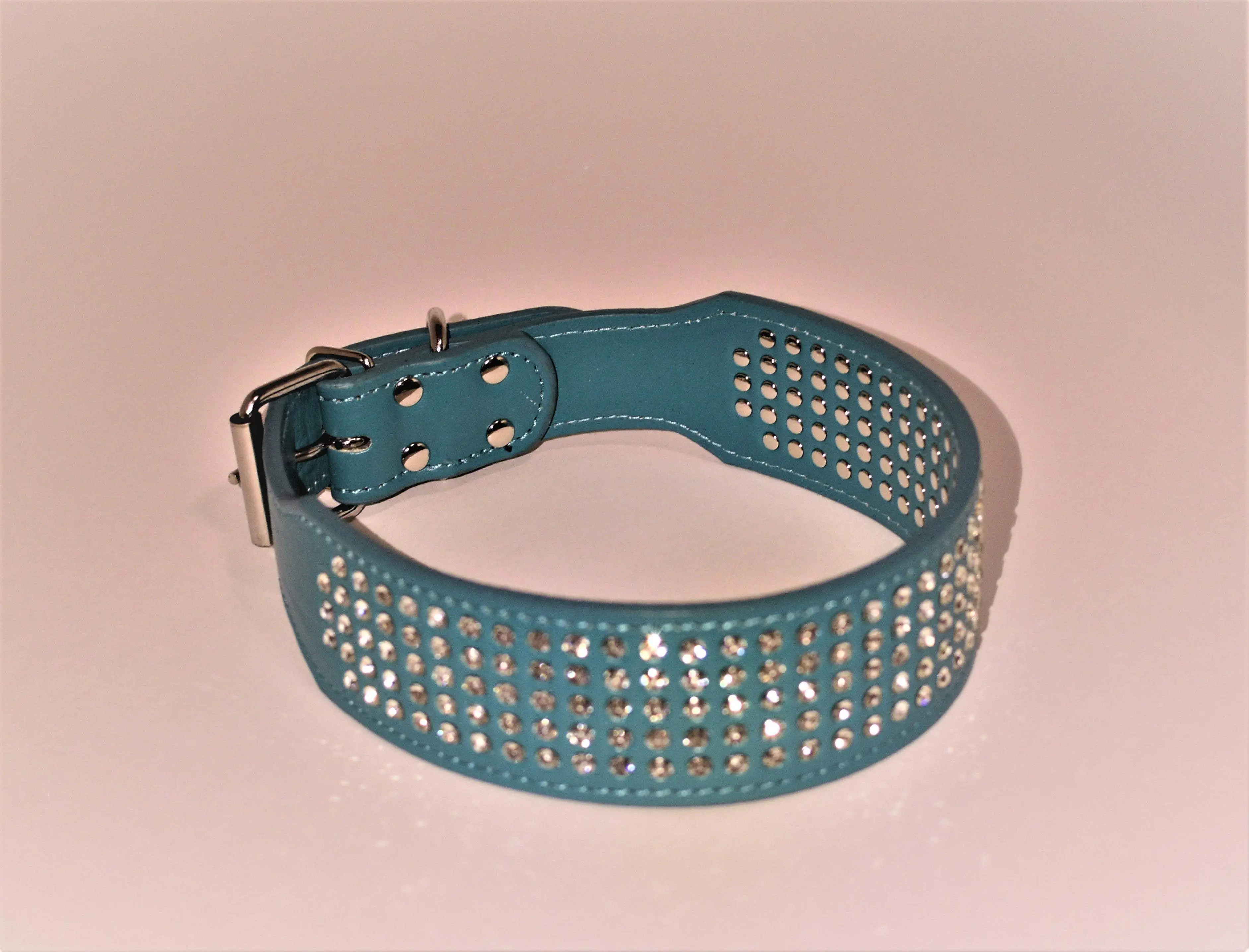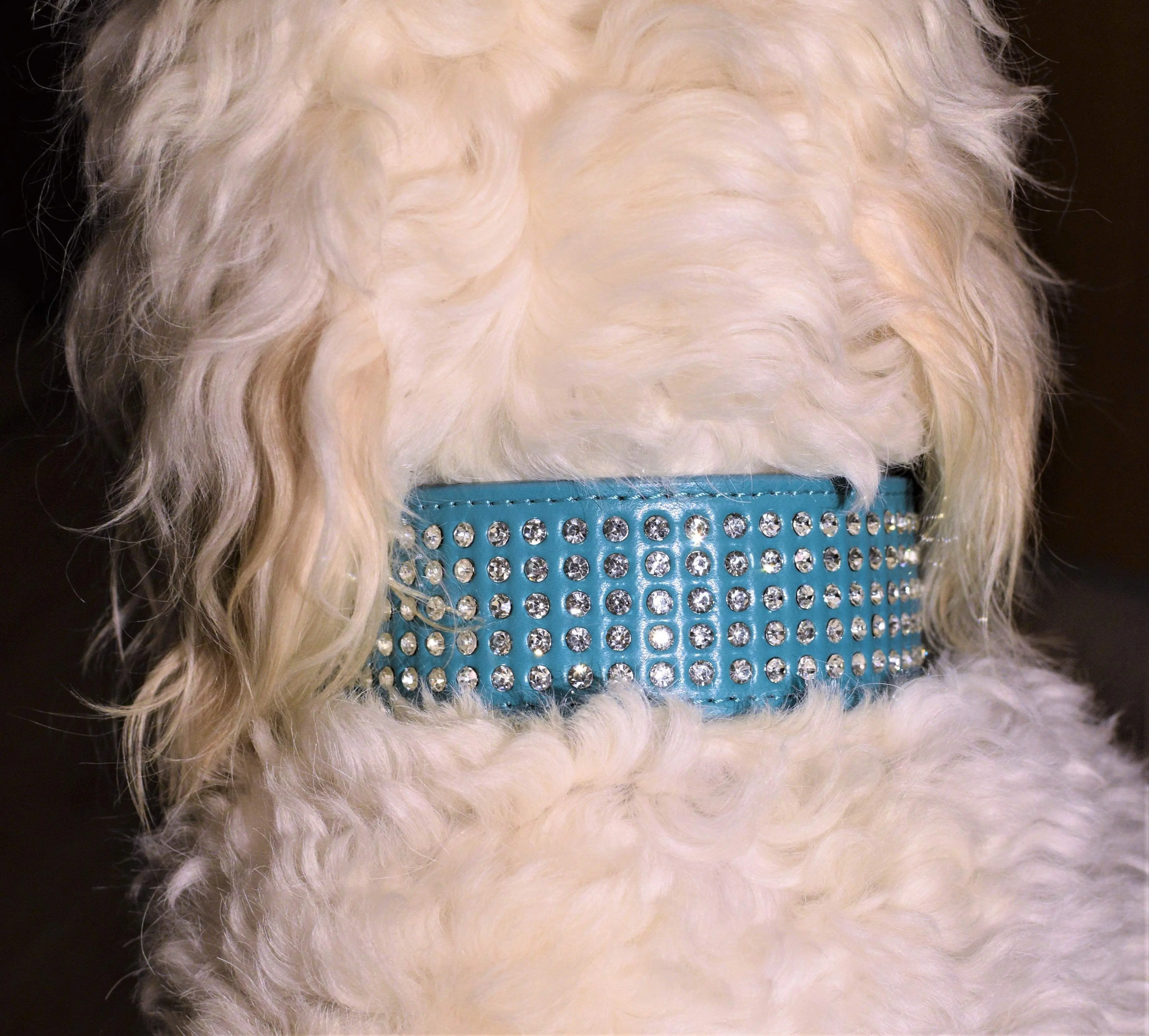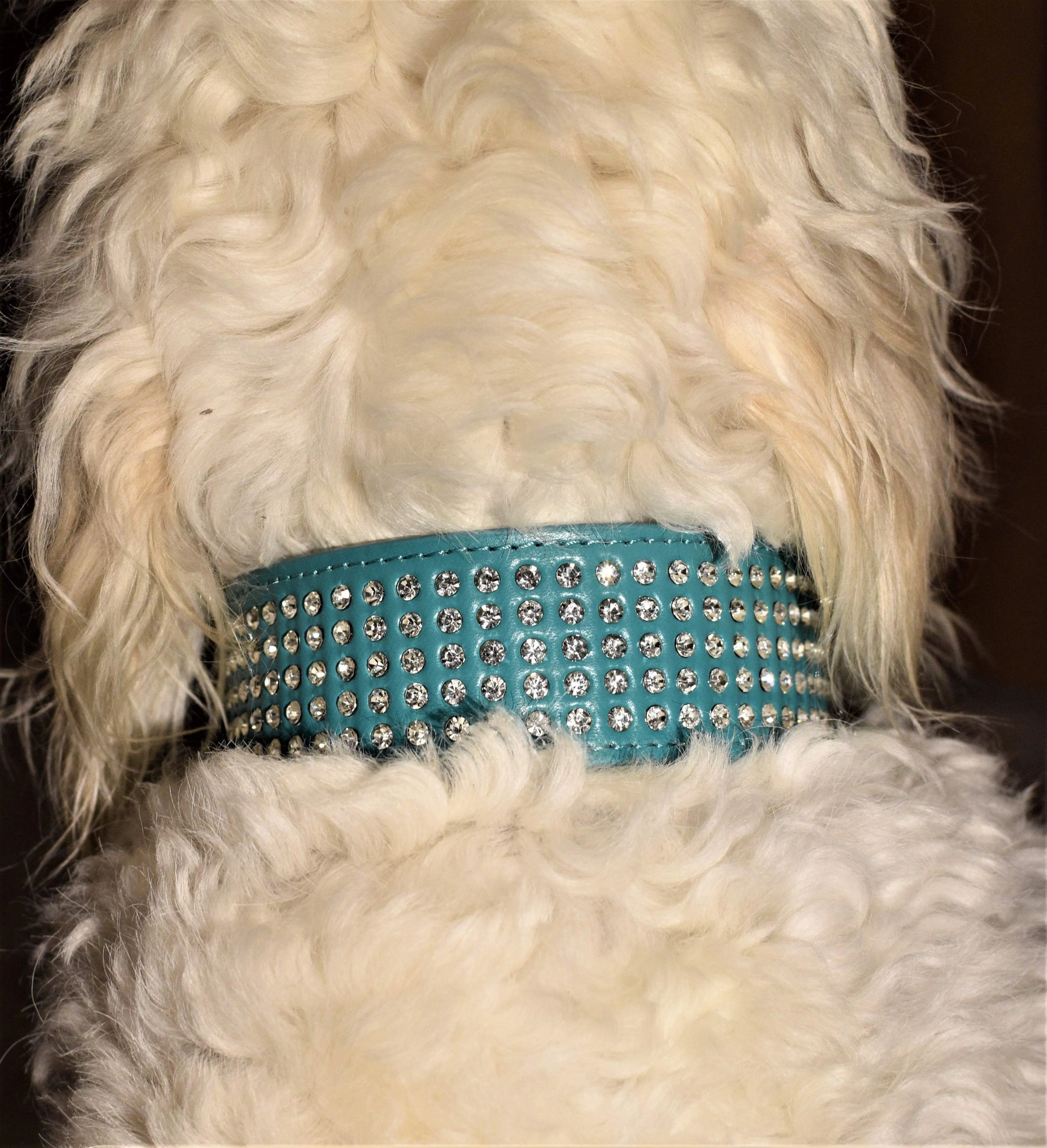 This Teal Dog Collar is crafted with flexible vegan leather and gorgeous riveted rhinestones. It's a durable and comfortable accessory that's sure to make your pup stand out at the dog show. Get ready to make a statement.