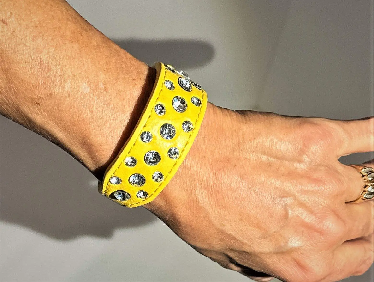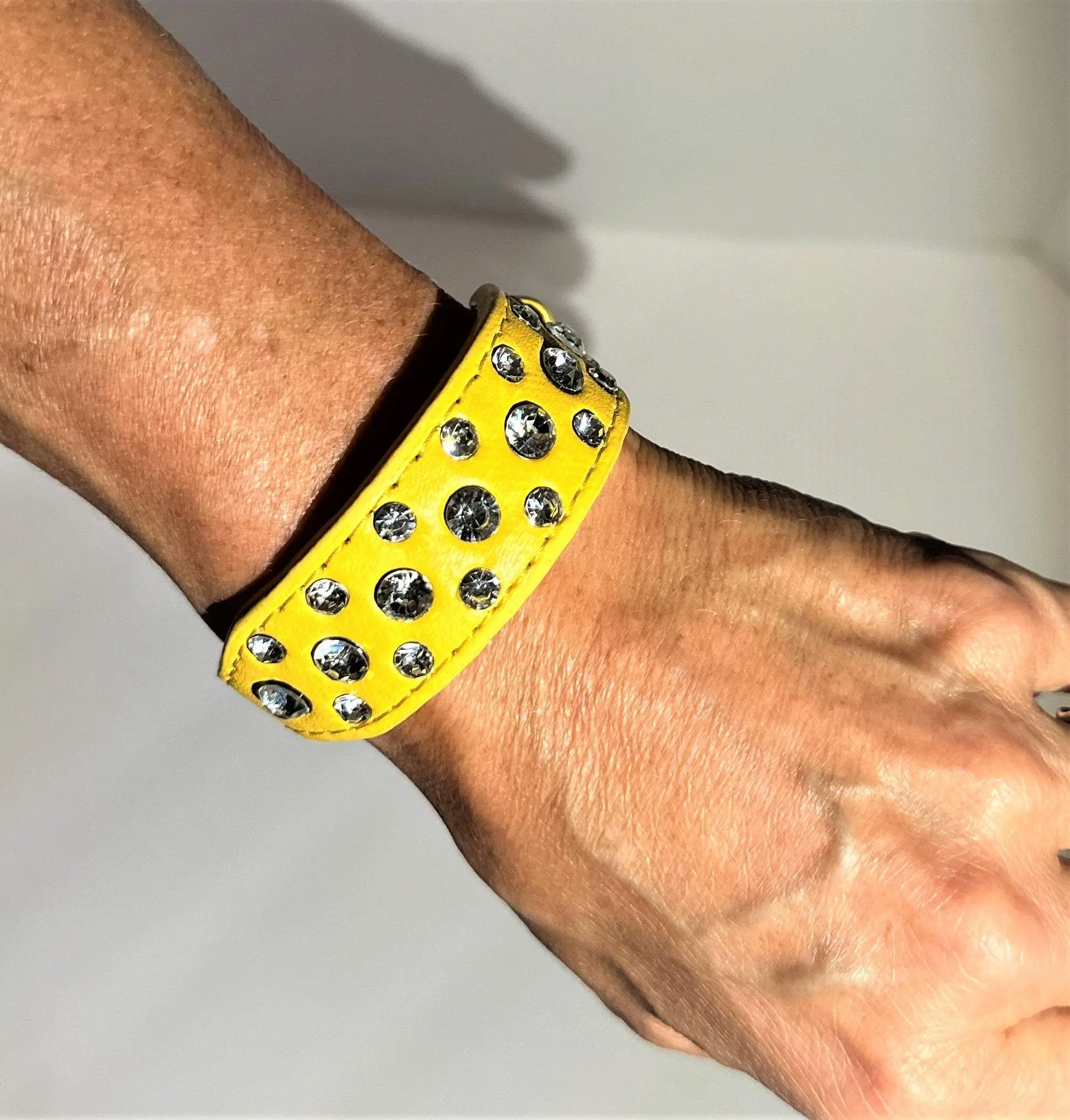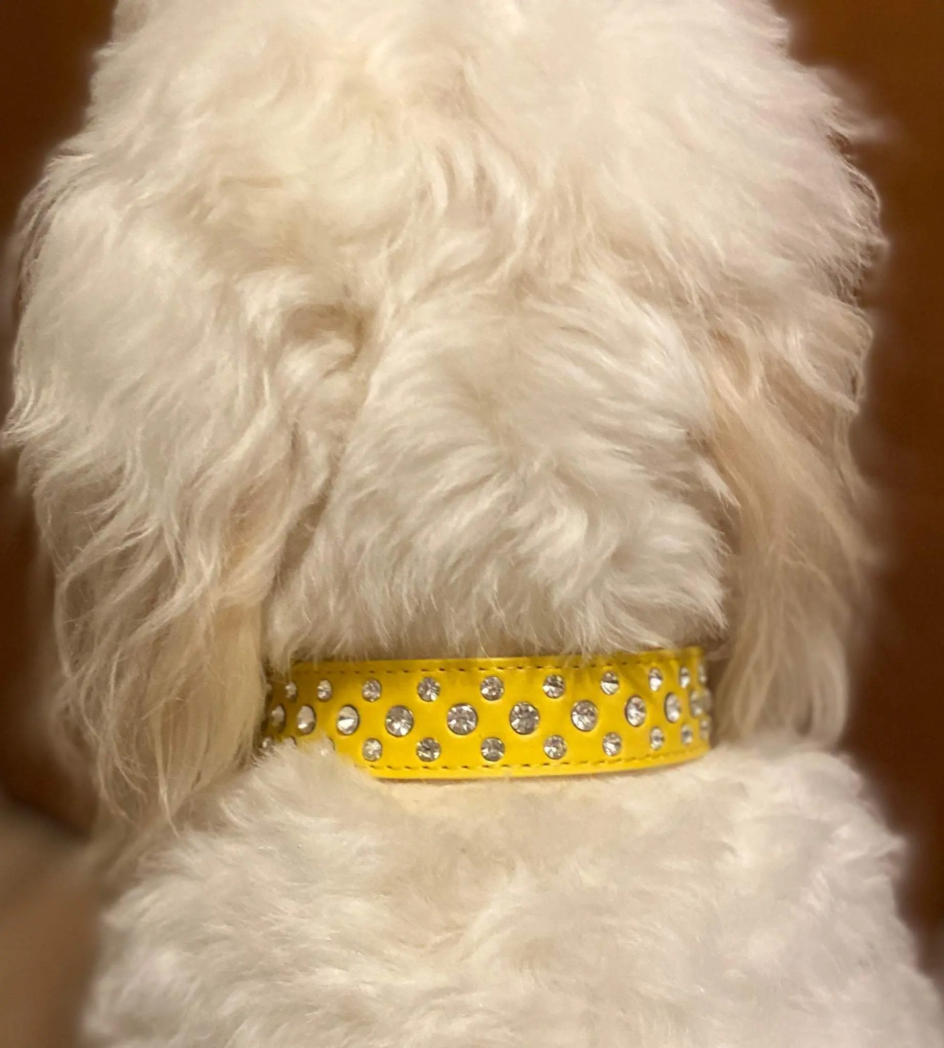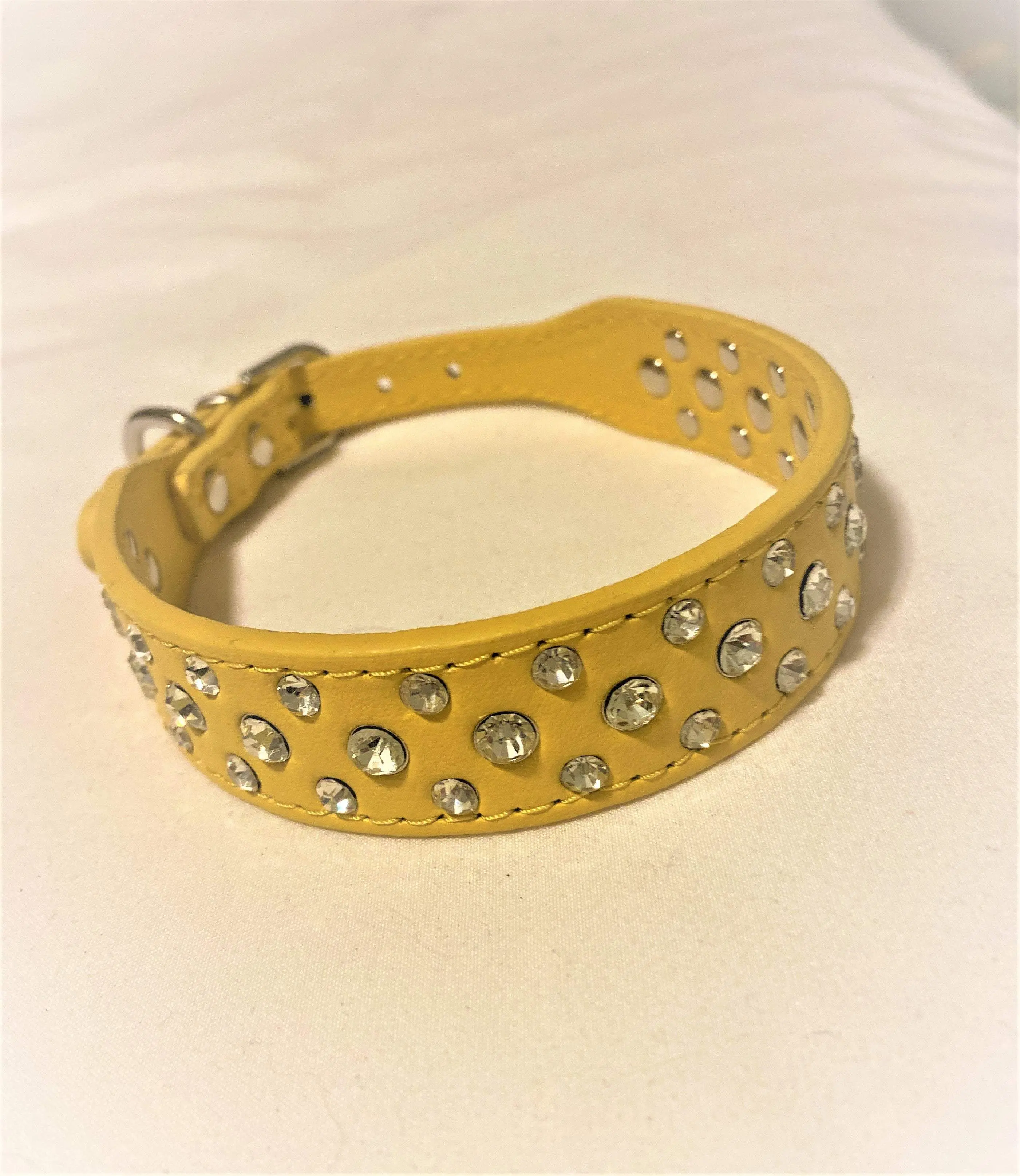 Turn heads at the dog show with this superior quality vegan leather dog collar, featuring riveted rhinestones for a dazzling look. Crafted with extreme attention to detail, this durable yet comfortable collar will give you and your pup satisfaction for years to come. Great for day to day play.