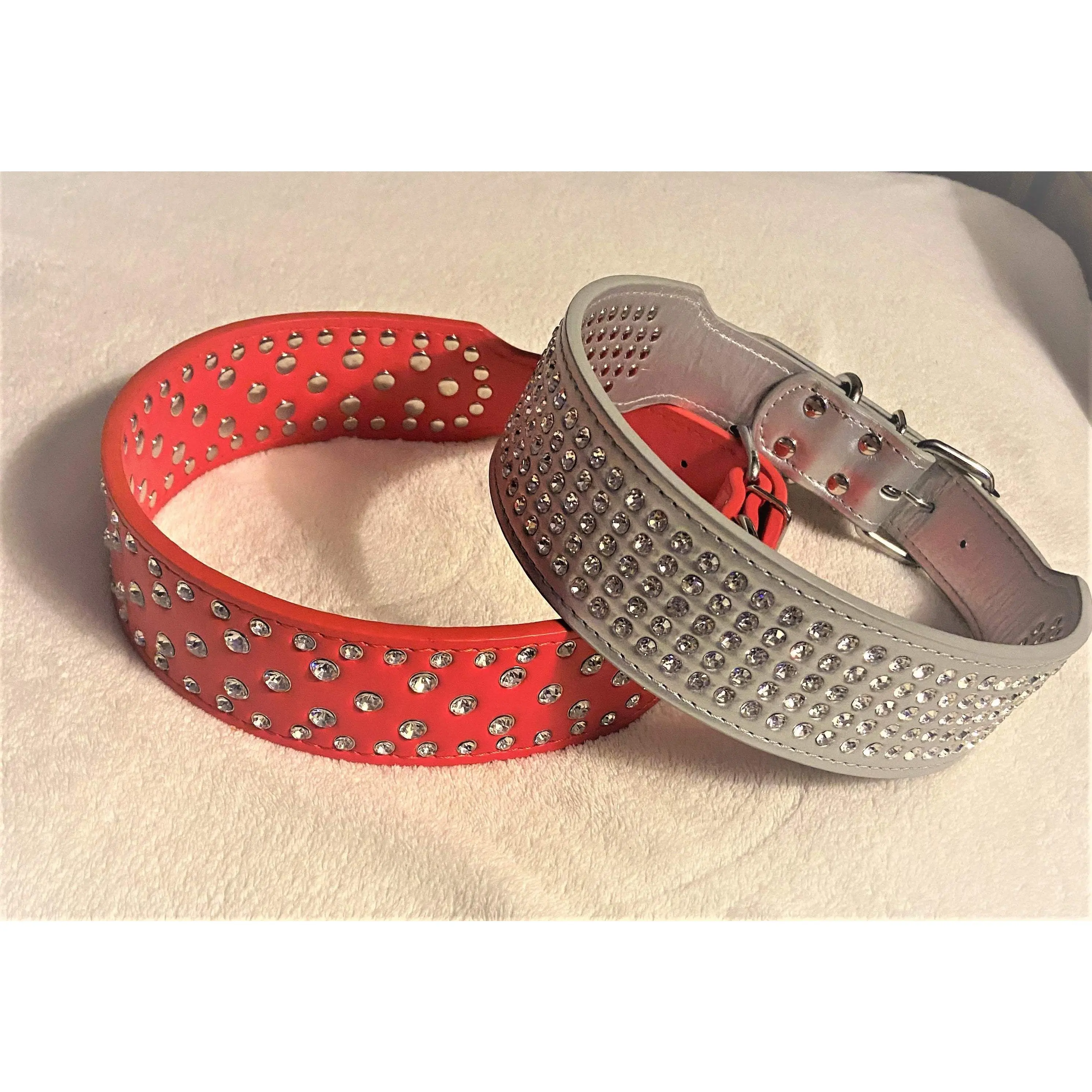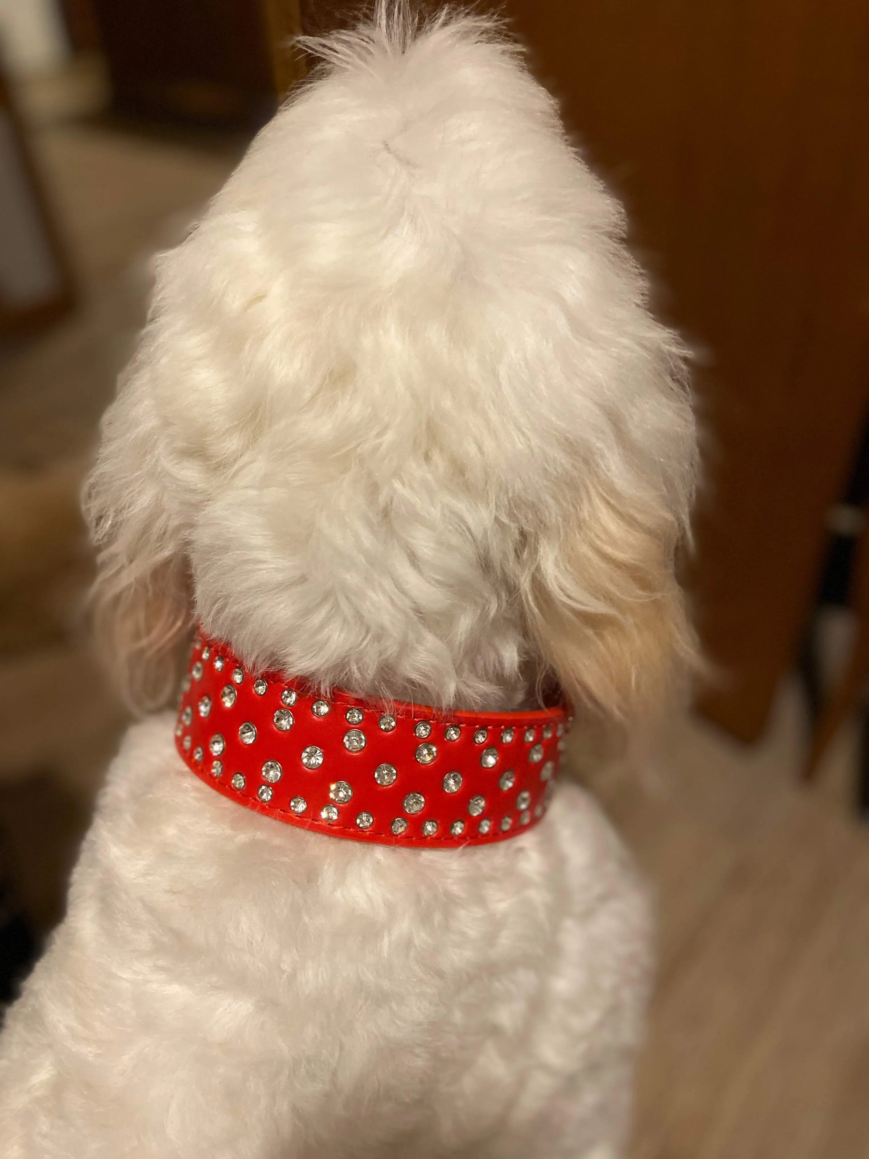 The Red Bling Dog Collar is a stylish and practical way to accessorize your pup. Made with luxurious vegan leather, it features impressive riveted rhinestones for irresistible sparkle. This collar is soft, durable and flexible for all-day comfort. Treat your pup to some bling today.