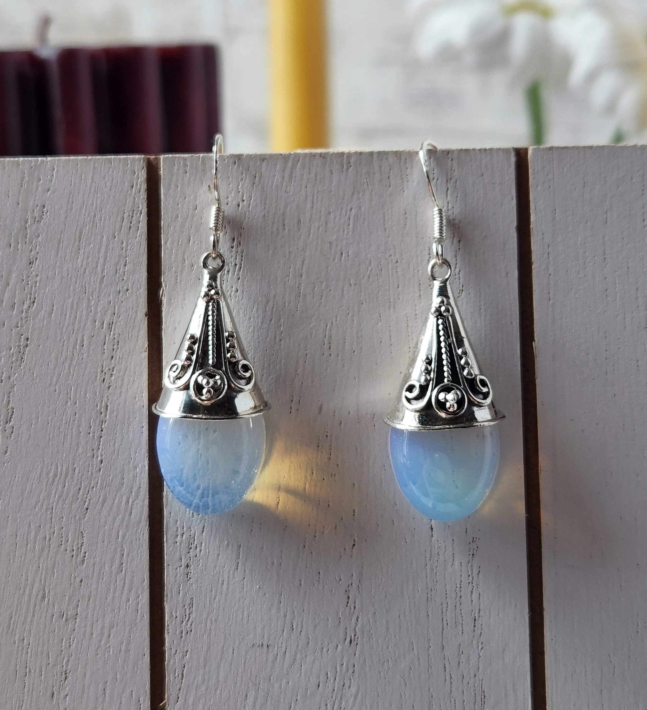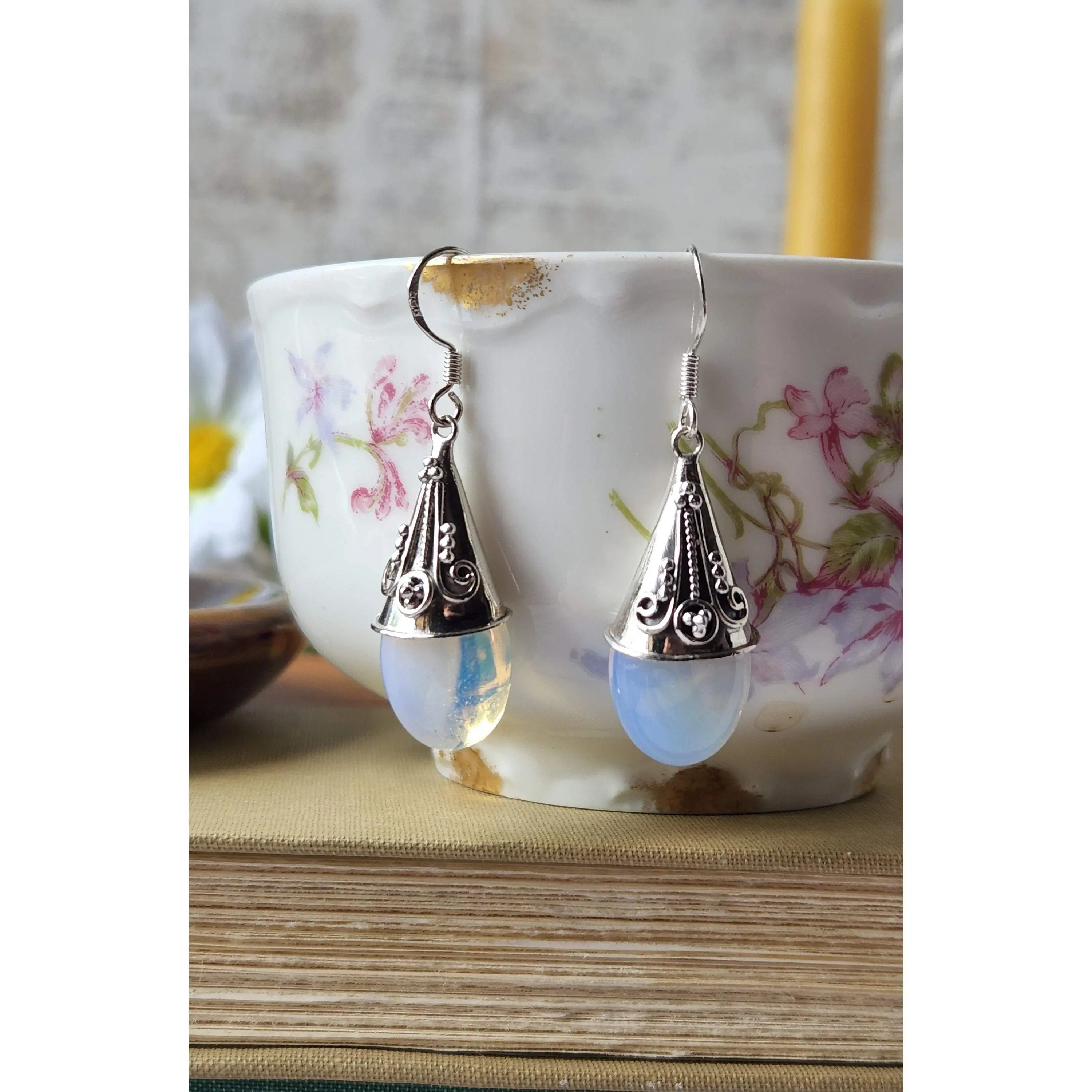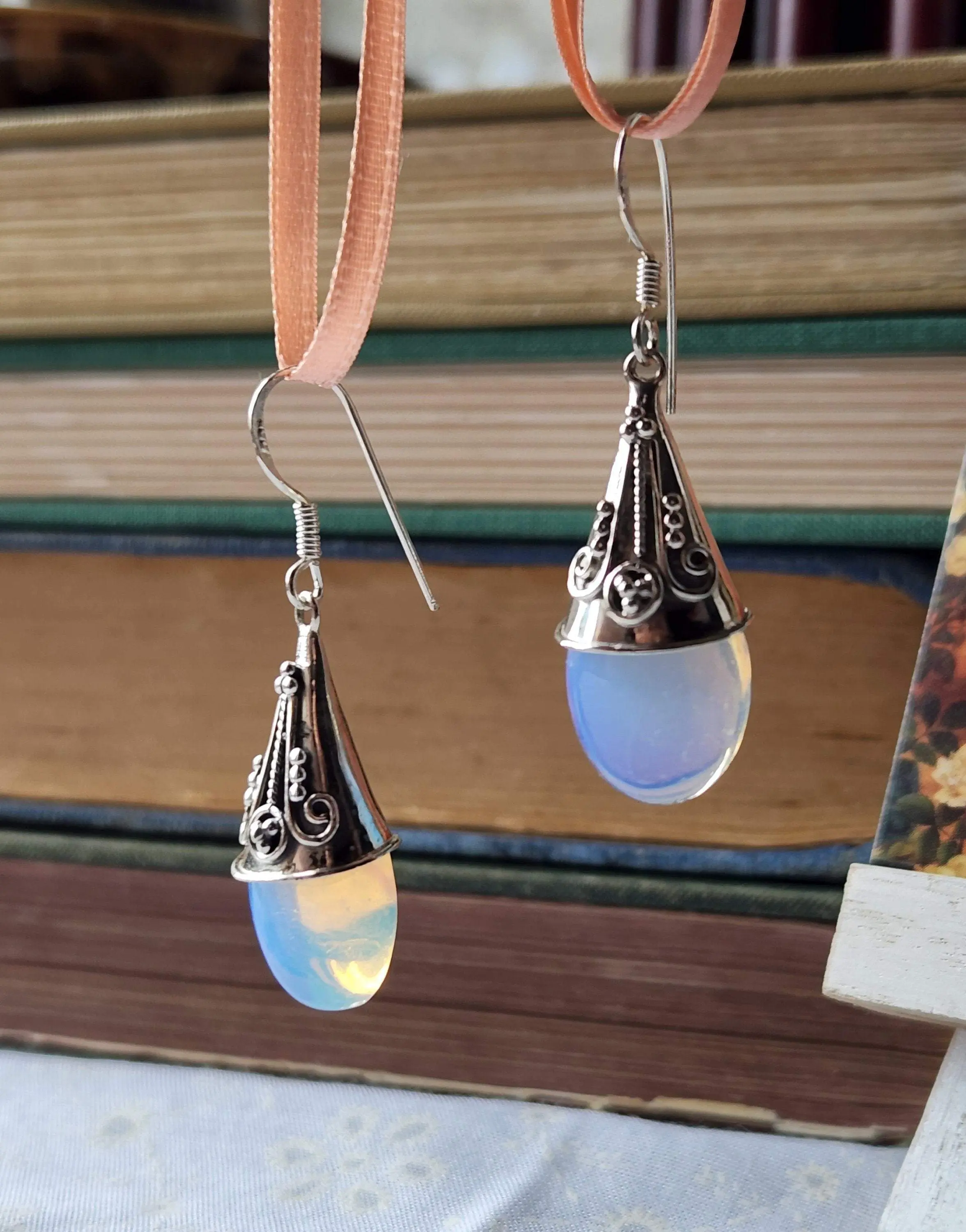 These magical sterling silver dangle earrings feature stunning iridescent glass teardrops that shift in color depending on the light. The opalescent drops evoke hues from blue to milky white, with a soft yellow glow, adding an enchanting touch to any outfit. Inspired by Victorian elegance, these earrings are perfect for fans of Dark Academia, Art Nouveau, or vintage-inspired fashion.