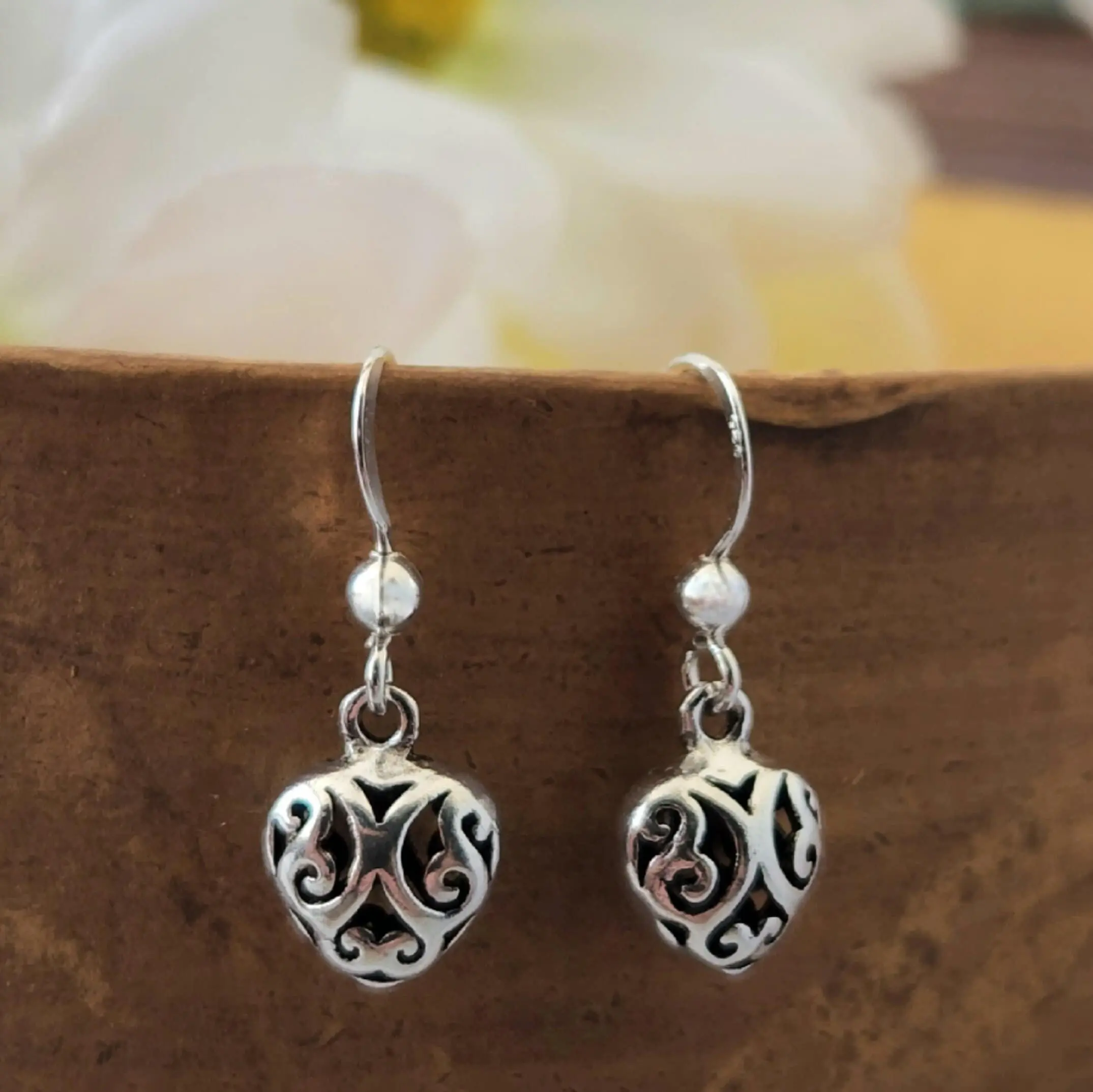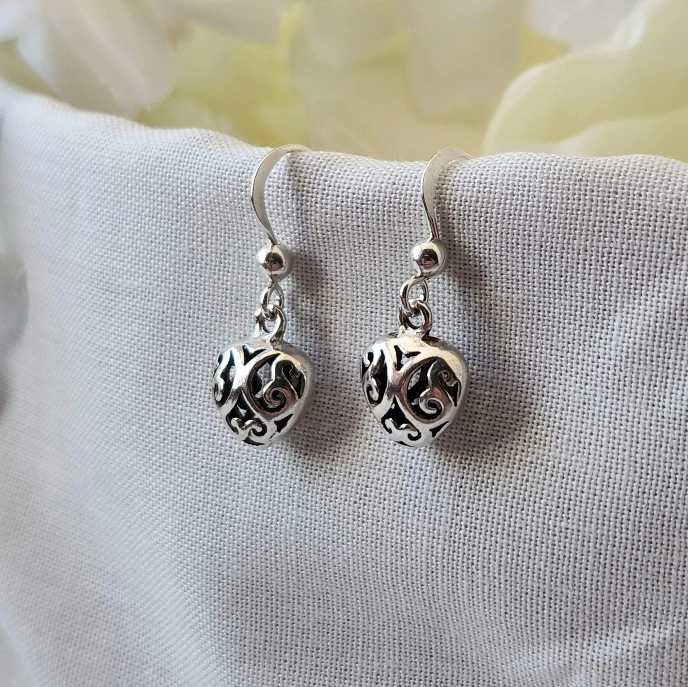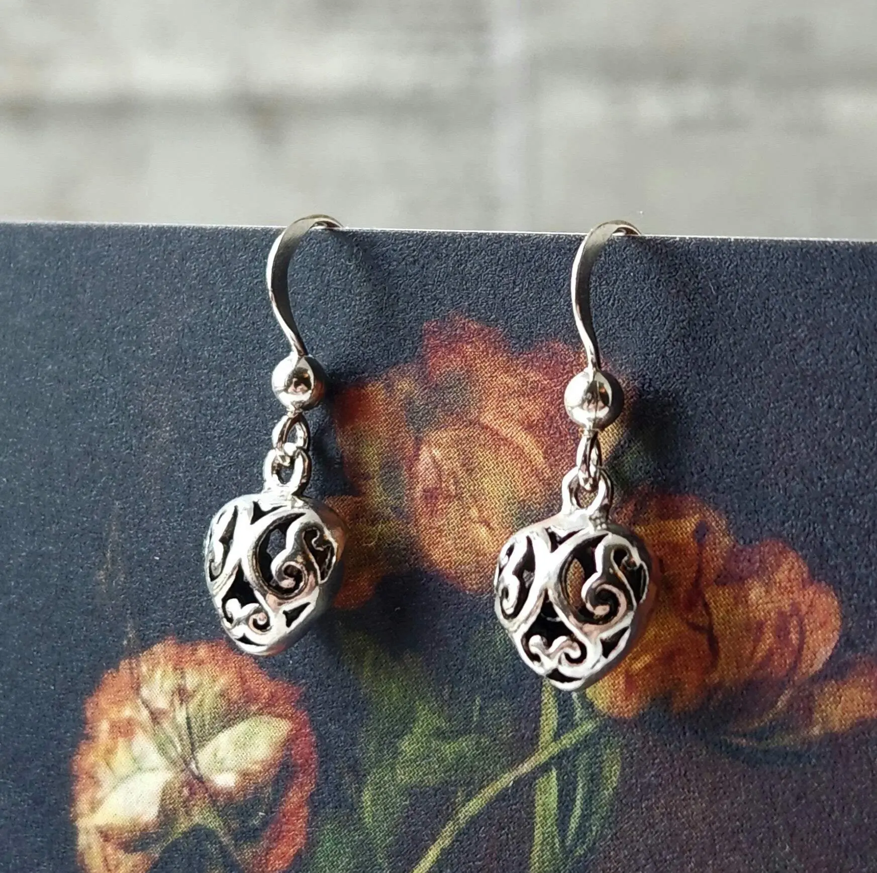 Step into a world of whimsy and charm with these Sterling Silver Filigree Heart Earrings. Inspired by the intricate designs of Victorian and Regency eras, these puffed 3D hearts will add a touch of gothic romance to any outfit. Perfect for those who embrace the cottagecore aesthetic, these earrings are lightweight and comfortable for everyday wear or a dreamy night out. Made from .925 sterling silver, they're nickel-free and hypoallergenic, making them a safe and timeless addition to your jewelry collection.