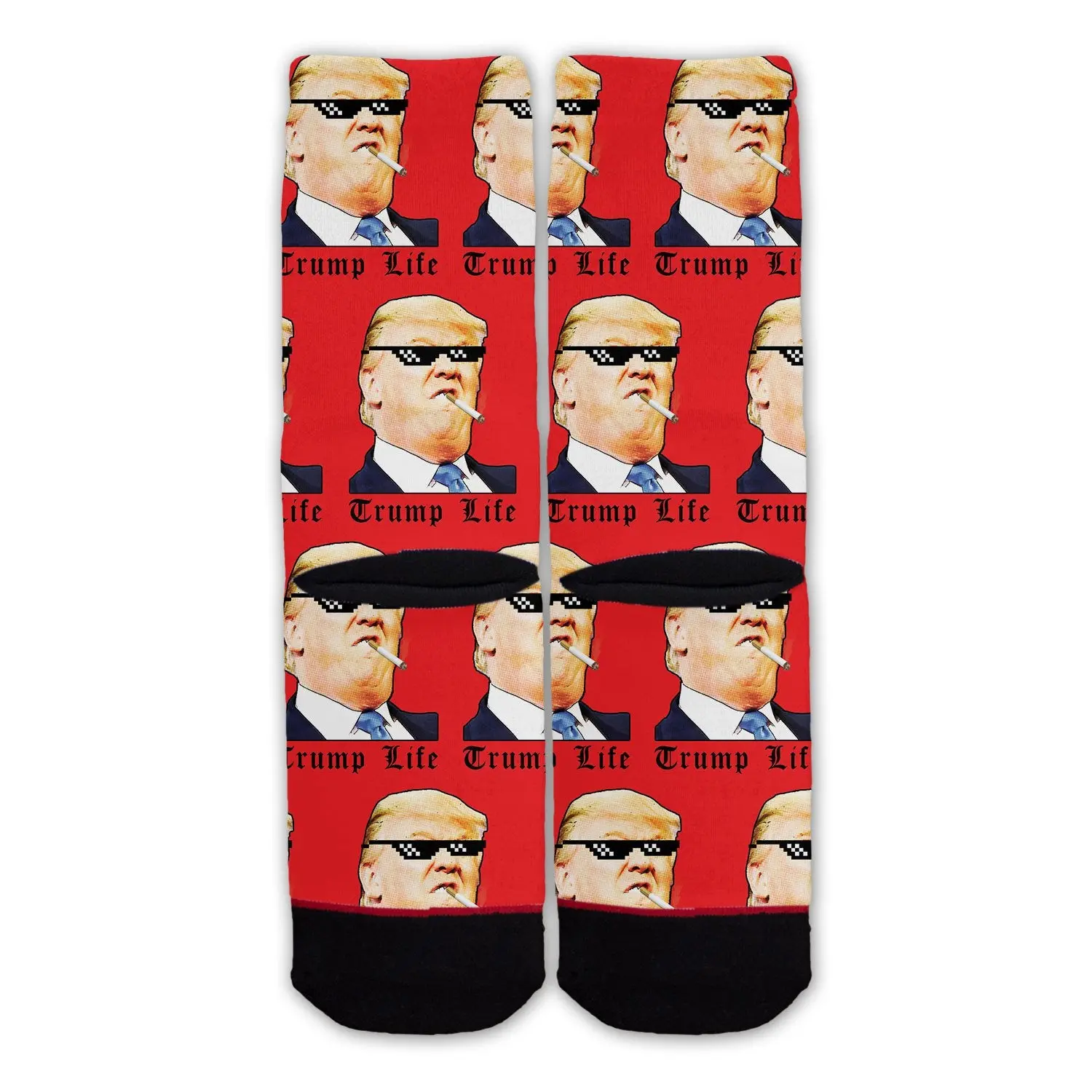 Being president is probably the most stressful job out there. So can you blame him for puffing down a few heaters every now and then? We may have exaggerated a bit on how many but we've all seen how he glorifies whoppers and Big Macs so you can only imagine. Having all eyes on you can lead to some excessive behavior, including a horrendous diet riddled with fried chicken and burgers. All that despicable behavior is captured in a true Trump essence on these Trump life socks. These crew socks are made from a polyester blend with a black cotton toe cap. All socks are designed with an all over graphic print that won't crack or peel. Featuring an elastic cuff to create a tight, non-slip fit. Recommended for mens size 6-12. Machine washable, hang dry.