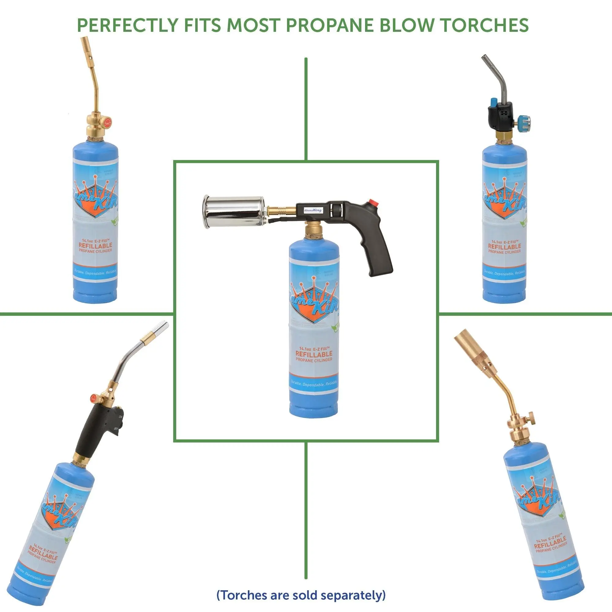 The Flame King 1LB Blue Refillable Propane Cylinders are perfect for welding, soldering, and cooking torches. The tall and skinny design provides a better grip on the torch while soldering, welding, or searing steaks, caramelizing sugar on creme brulees, melting cheese, and much more. These propane bottles are refillable & transportable. Our unique & patented valve design is not available from any other manufacturer. Spend your money wisely & start refilling small cylinders whenever you need them! Tossing a single-use disposable tank is just a silly waste of resources & can be a potentially huge problem in the waste stream! Join the eco-revolution! Please note: these cylinders fill fastest & safest with our commercial Flame King refill adapter - sold separately. - UL1769 listed. The TALL and SKINNY design of the 1LB Refillable Cylinders provides a better grip of the tank, making it the PERFECT CYLINDER for welding and soldering torches, as well as kitchen torches!