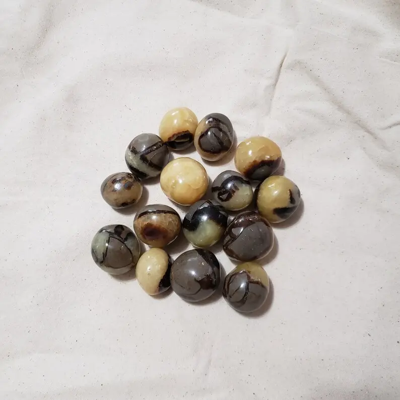 This listing is for ONE Septarian tumble from Madagascar. The tumble was sourced in Madagascar and polished in the US. Each tumble is spherical/round-ish. The measurement is approximately ~1". One tumble will be intuitively selected.