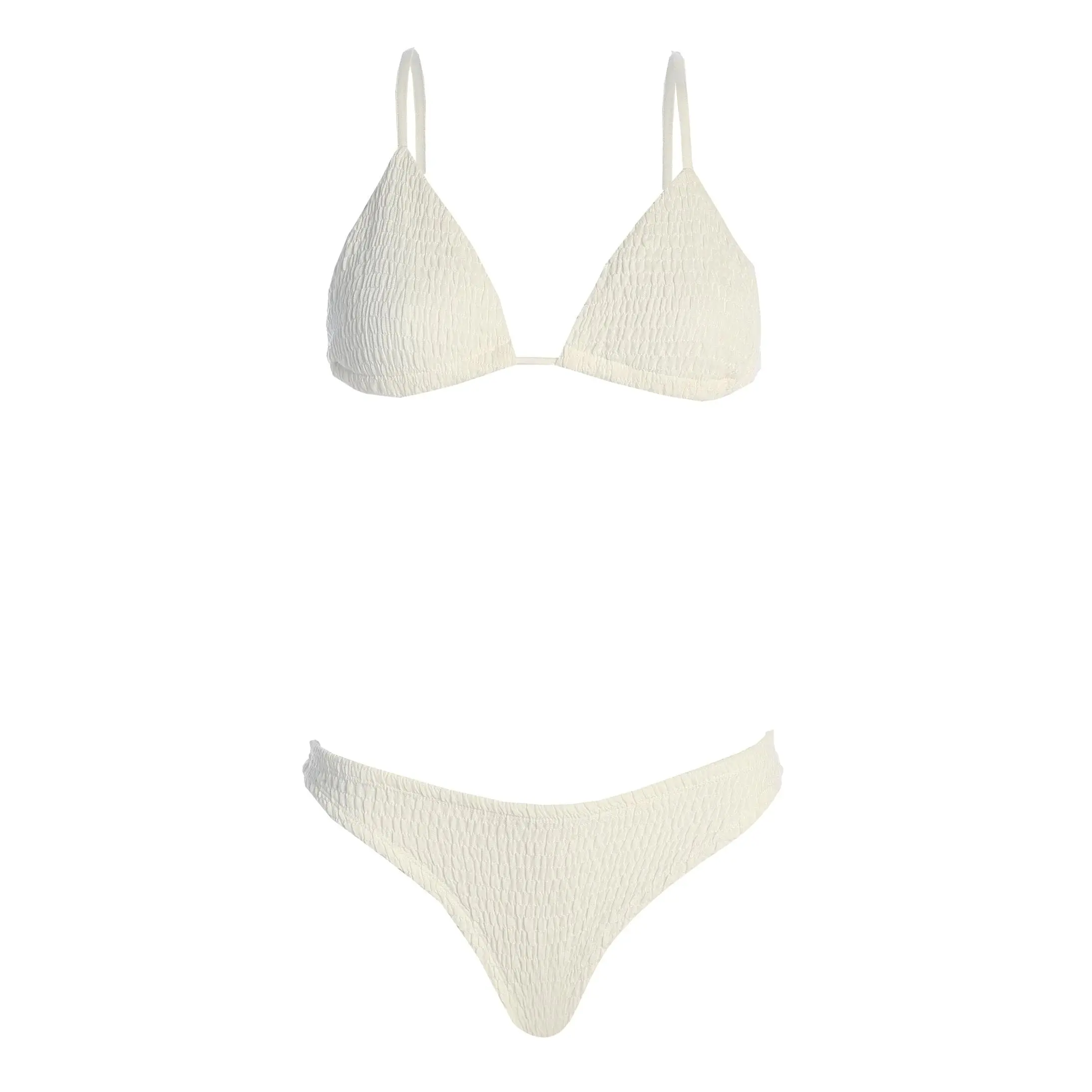Feel like a goddess at Sea in the new Off White Shores Of Gold Bikini Set. Crafted in a stretchy smocked fabric, this luxurious bikini set features a triangle bikini top with neck ties and cheeky bikini bottoms with a high leg cut. Stretchy. Sold as set.