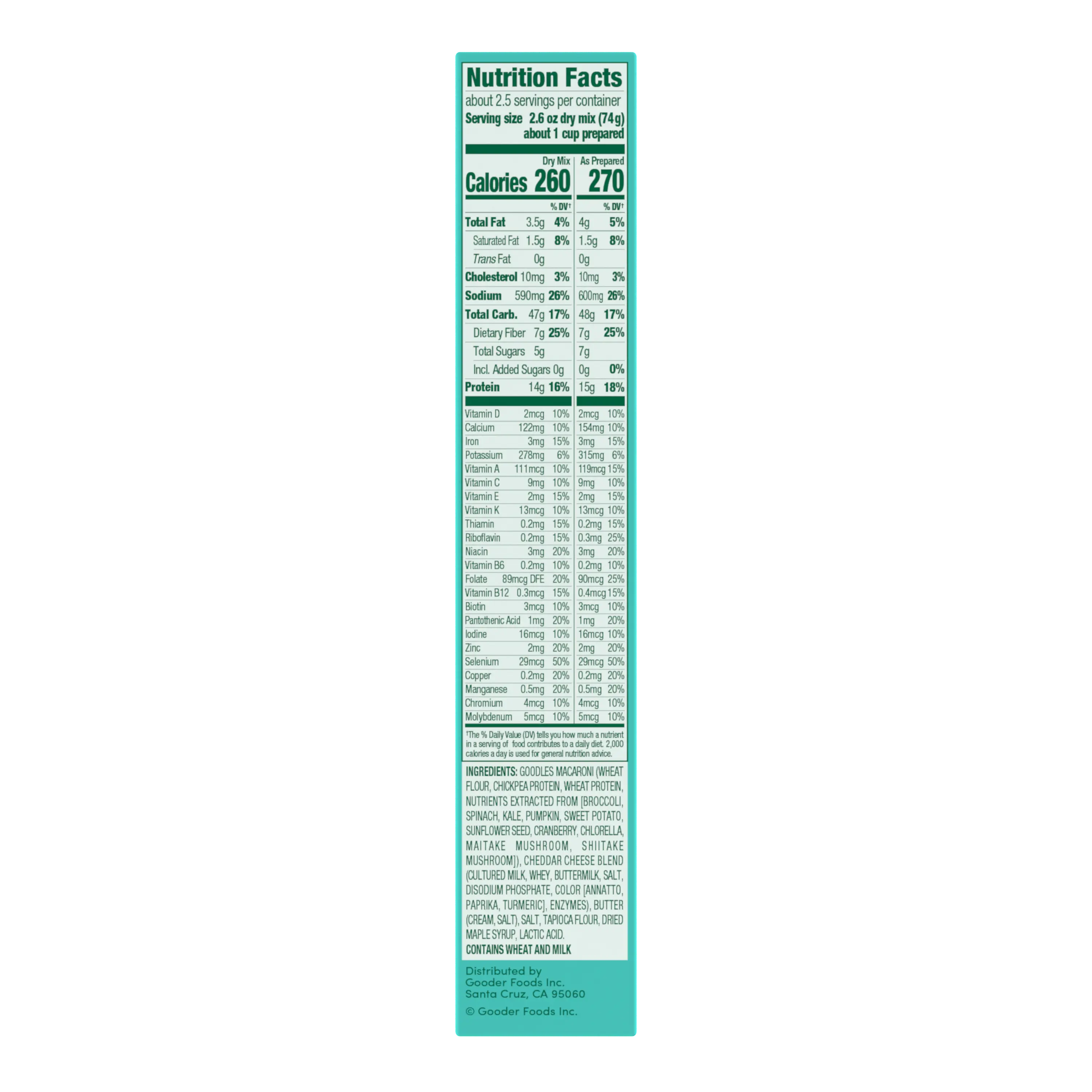 GOODLES Noodles (Wheat Flour,Chickpea Protein,Wheat Protein,Nutrients extracted from [Broccoli,Spinach,Kale,Pumpkin,Sweet Potato,Sunflower Seed,Cranberry,Chlorella,Maitake Mushroom,Shiitake Mushroom]),Cheddar Cheese Blend (Cultured Milk,Whey,Buttermilk,Salt,Disodium Phosphate,Color [Paprika,Turmeric,Annatto],Enzymes),Butter (Cream,Tapioca Flour,Dried Maple Syrup,Lactic Acid. Contains Wheat and Milk