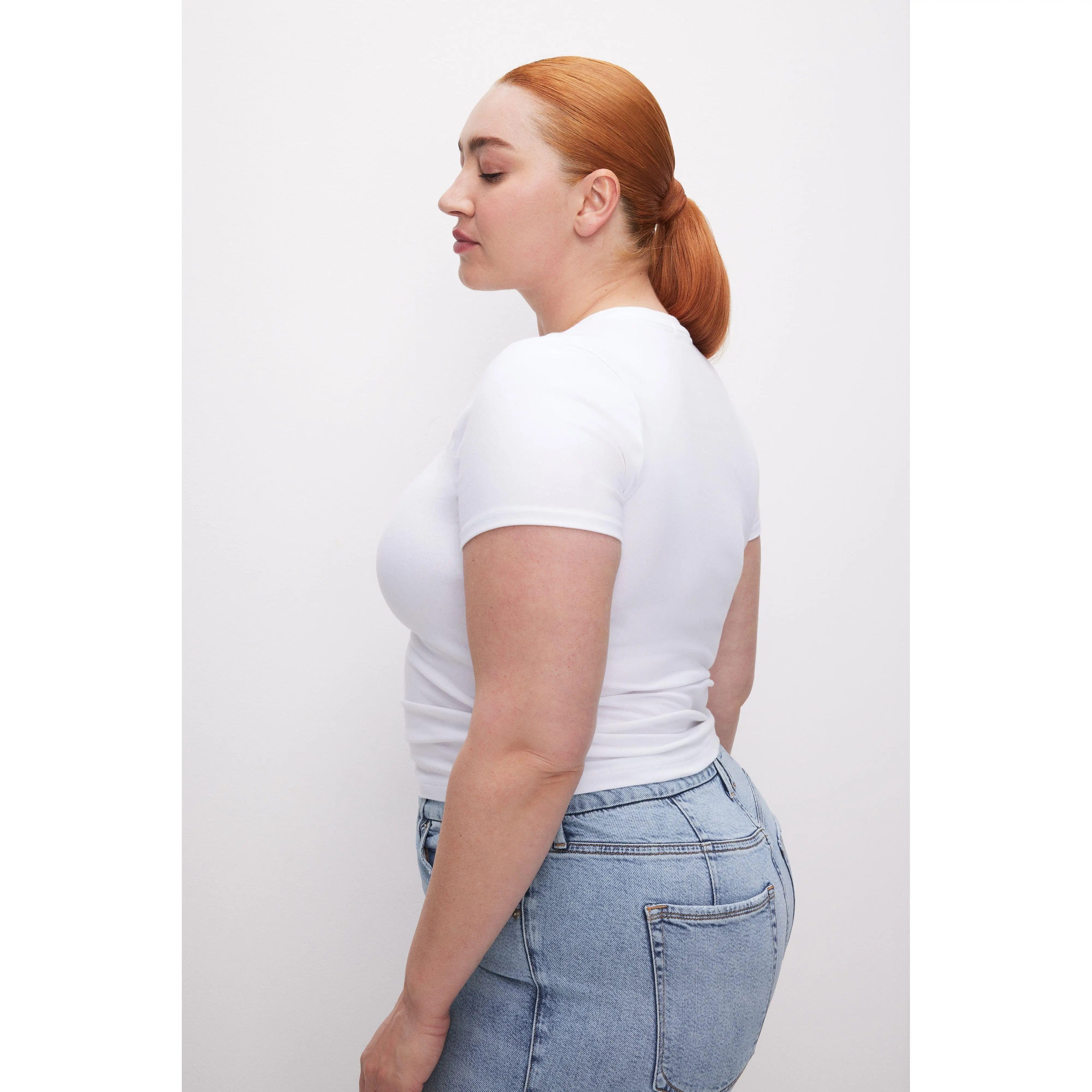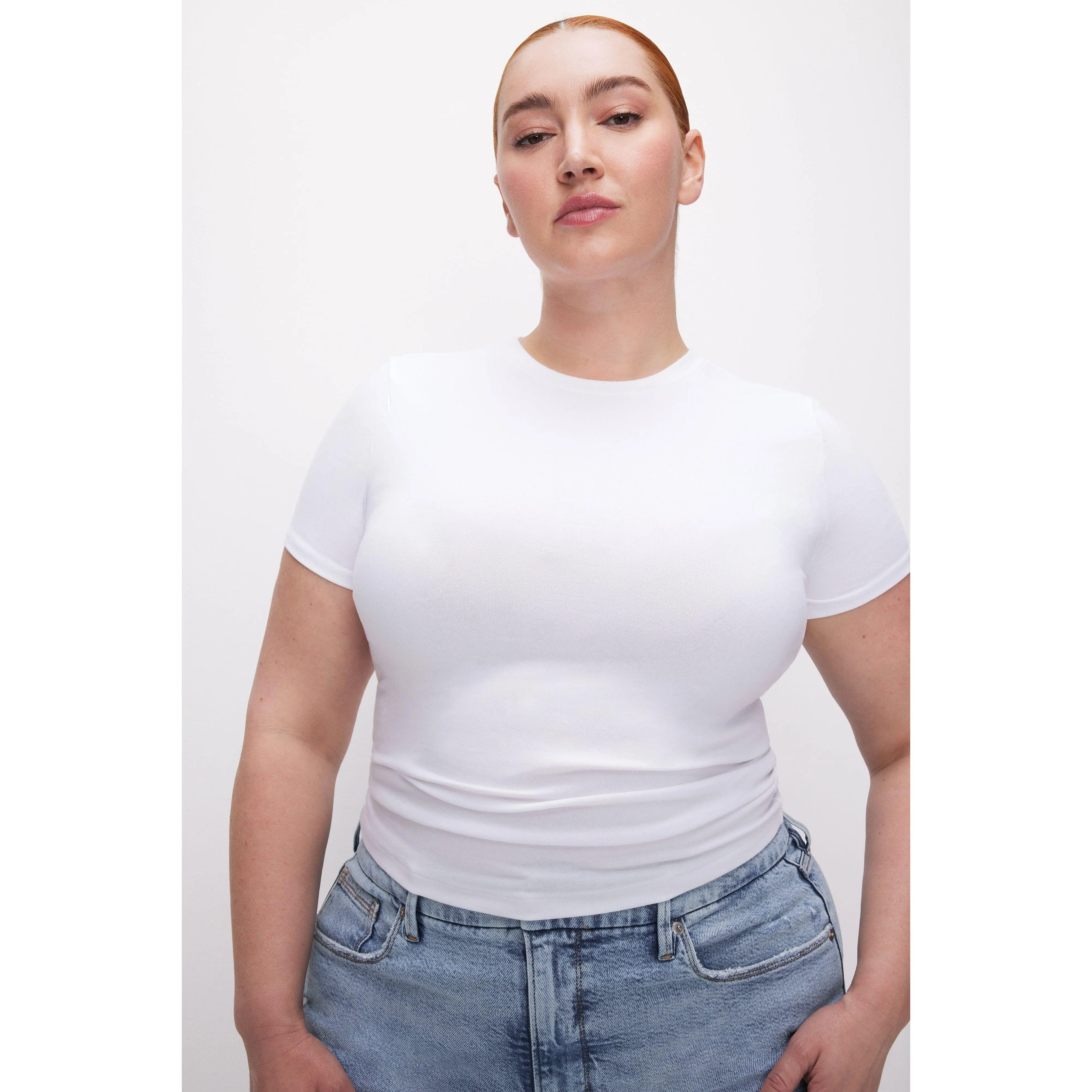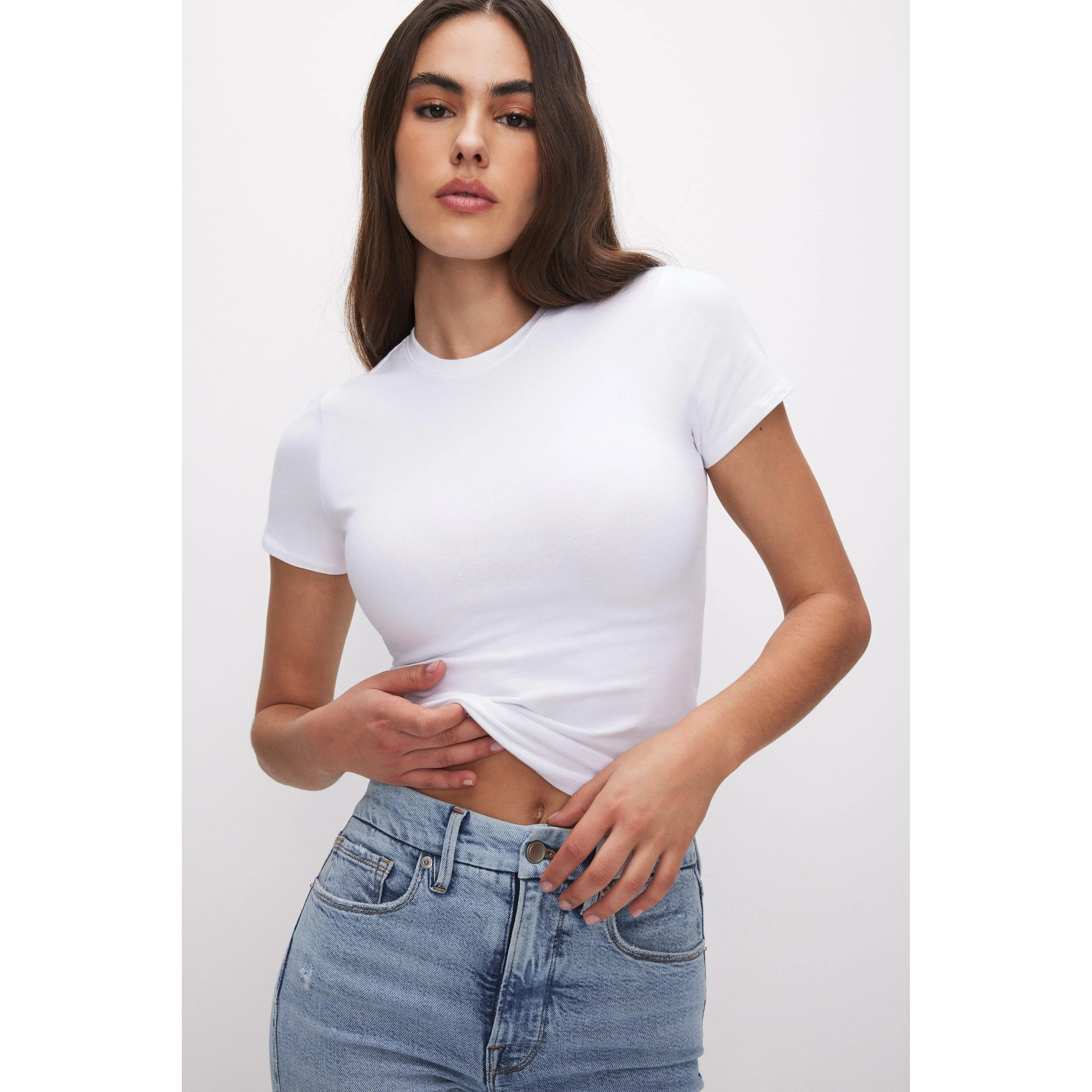 The second-skin baby tee. A cropped, form-hugging fit with a slim, flattering shape and crew neckline. Made from premium smooth cotton with unparalled stretch that molds to your curves and comfortably holds you in.