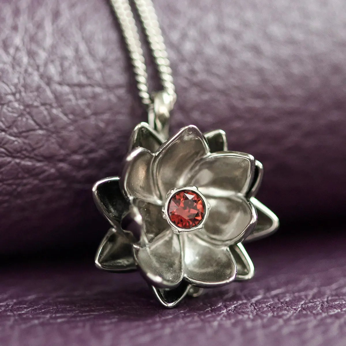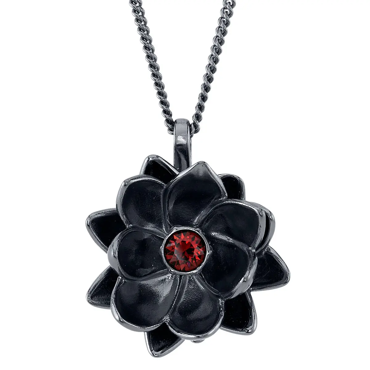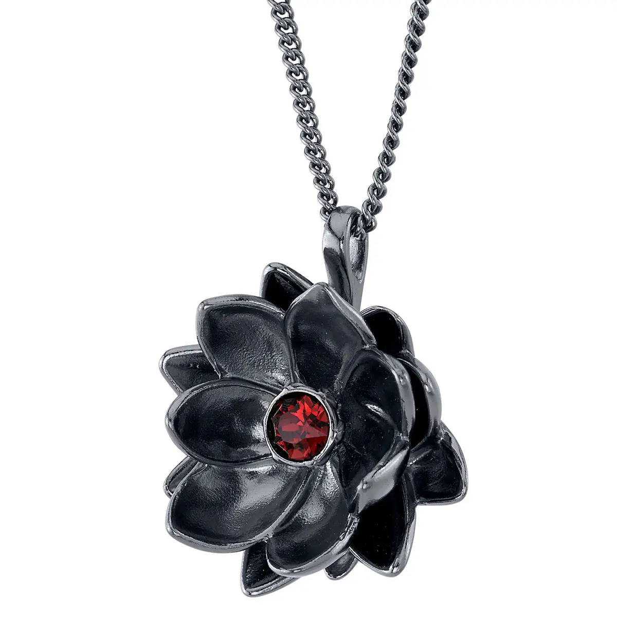 Carved in solid sterling silver and plated in gleaming black rhodium, elegant Black Lotus petals embrace pistils set with a rich burgundy red faceted crystal. A slender stem-like bail gently loops so that the intricate blossom lays flat against the chest, comfortable for day wear. Three-dimensional and larger than its matching ring and earring counterparts, the pendant hangs from a slender black rhodium plated sterling silver adjustable curb chain.