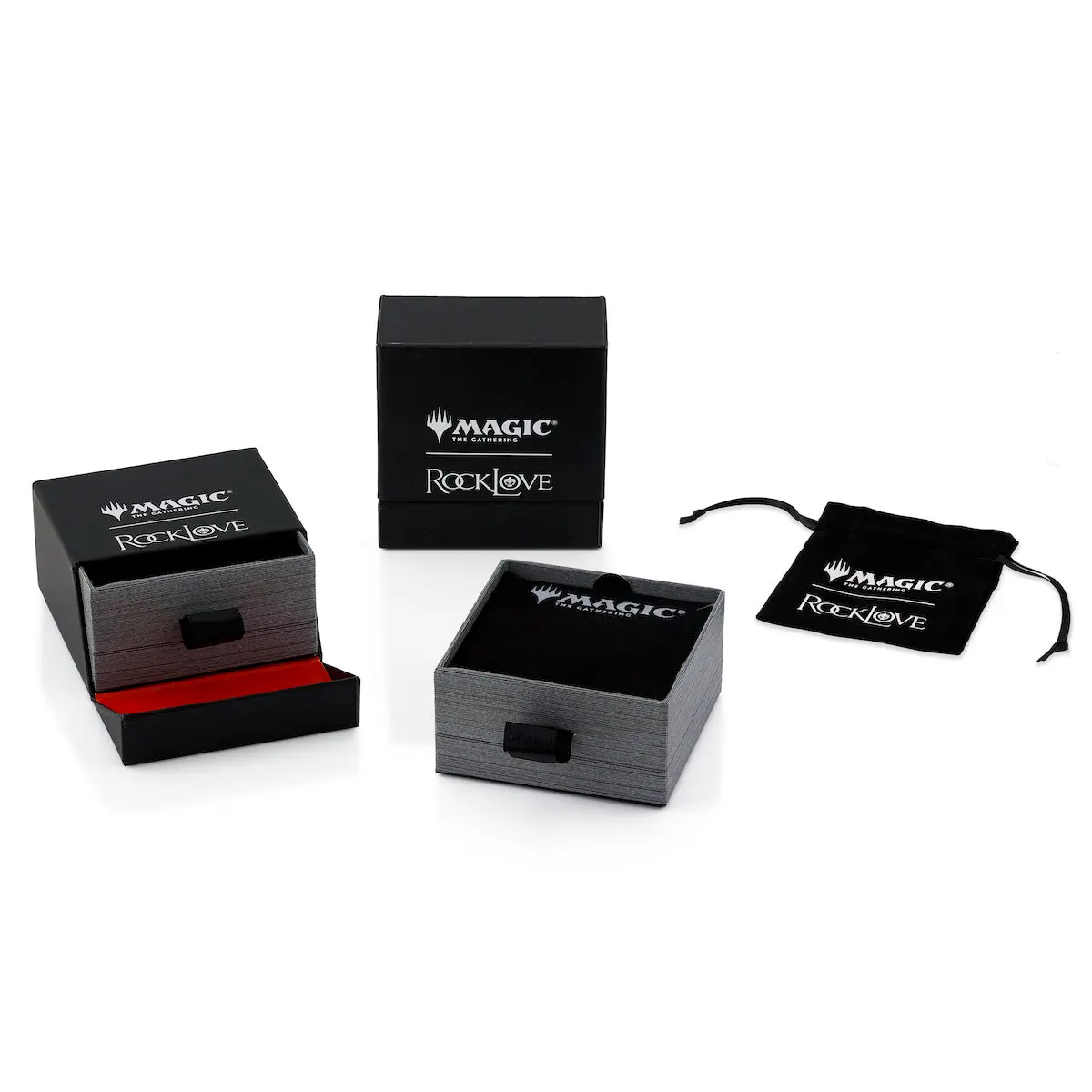 This Magic: The Gathering X RockLove jewelry design is an open design. Every piece arrives in a signature Magic: The Gathering X RockLove Collector's Dice Box, with black exterior and “Mythic Orange” interior. The box flap opens to reveal a slide-out compartment, printed with the side image of stacked Magic cards. The jewelry nestles within branded soft black flocking and includes an additional black fabric drawstring travel satchel with silkscreened logos. A compelling addition to any display case.