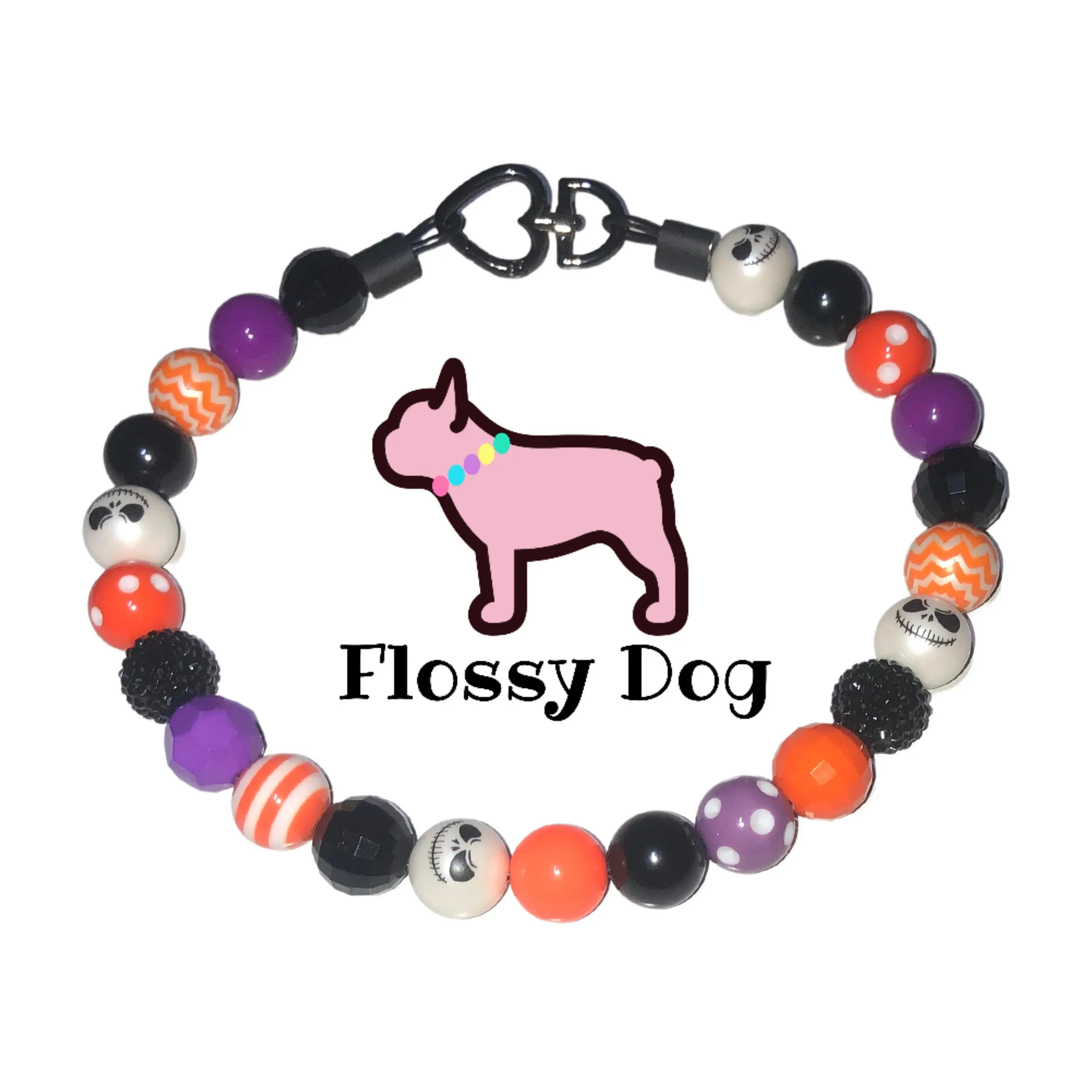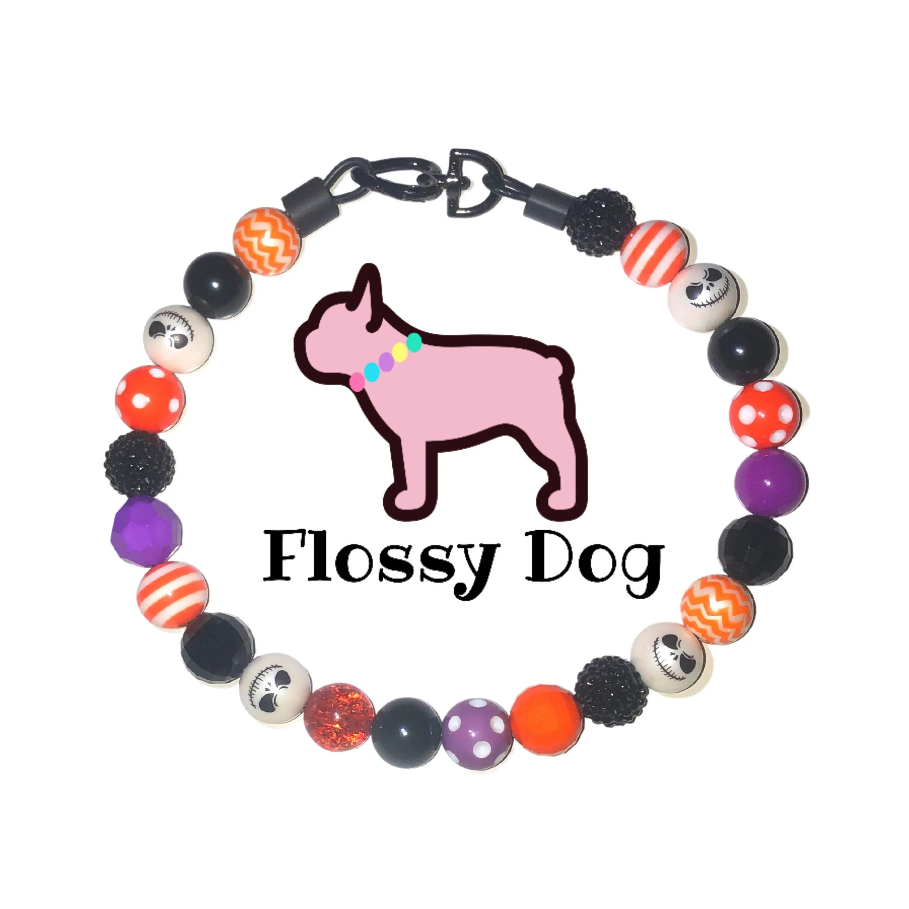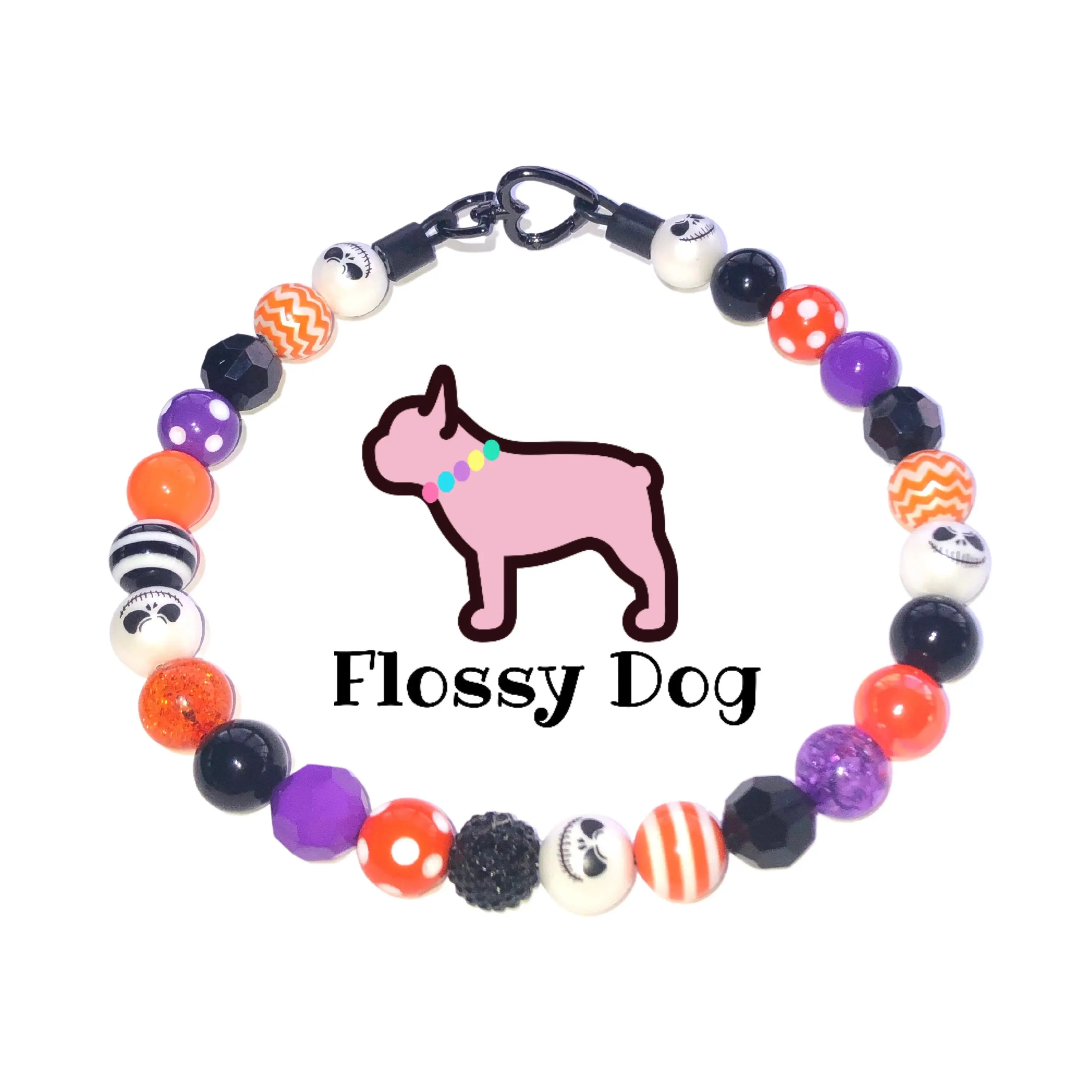 Howl-o-ween Beaded Dog Collar | Durable Dog Necklace | Orange, Black, White, Purple Jack Skellington Bead Collar | with Collar Charm