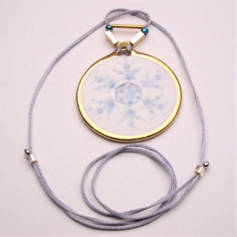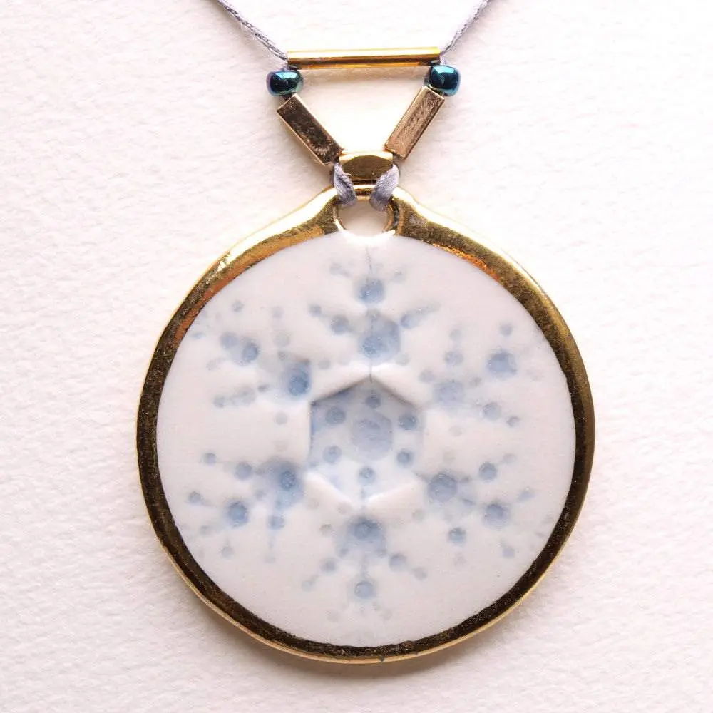 Adorn your winter look with this charming Snowflake Pendant Necklace style. Handcrafted in the U.S.A. by me, it showcases a central snowflake carving beneath a glassy glaze with two colors to choose from, accentuated by a glistening 24k gold luster band. And one in the 24k gold luster. This exquisite ceramic porcelain necklace measures approximately 1.9 inches in diameter and weighs 18 grams. Each piece is meticulously crafted, fired to 2281°F for scratch-resistant, durable beauty. The adjustable lanyard, about 26 inches in total length, features gold-plated, stainless steel, and colorful glass beads, adding a unique touch to your style.